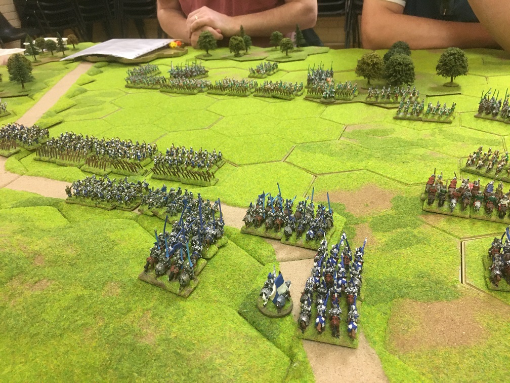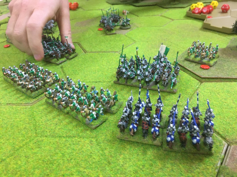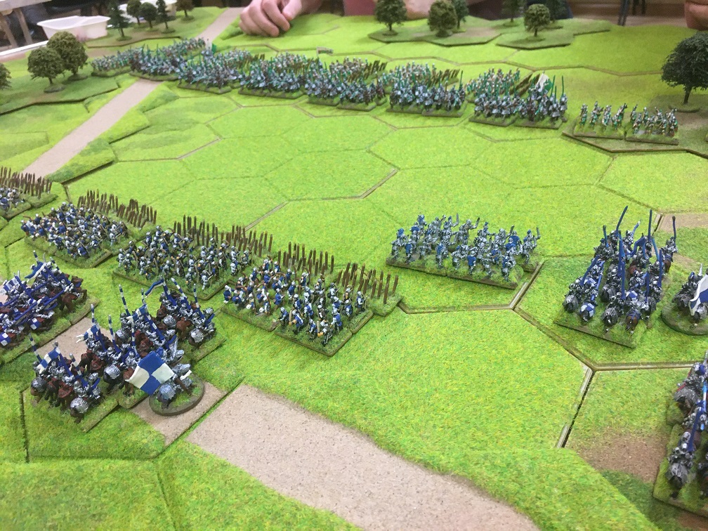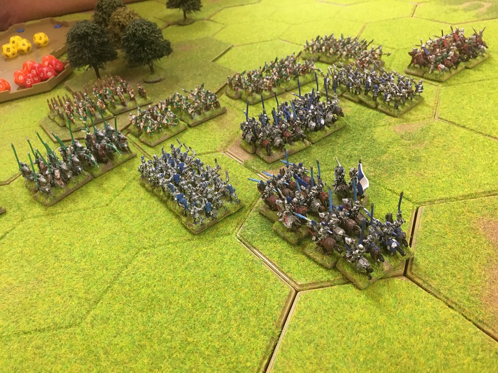 With an hour or so left we quickly set up the armies for another game with exactly the same armies and terrain layout. Tim and I decided that we would attack on both wings – infantry into the woodland on the left and heavy cavalry and 3 units of infantry on the right towards the other 4 hex woodland on the right. Again the longbow units of both armies faced off against each other behind a line of stakes in the centre.