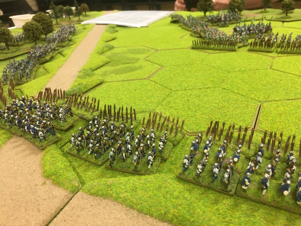 Tim and I had the Yorkists (blues), and Chris and Tony the Tudors (green and white), and our Yorkists got the first move. We reluctantly moved away from our 8 hex hill and set up our longbow shooting line behind our planted stakes just 1 hex in front of the road, the possession of which proved to be an important asset. Tony and Chris echoed our deployment using the 4 hex wood as a bastion protecting their left flank.