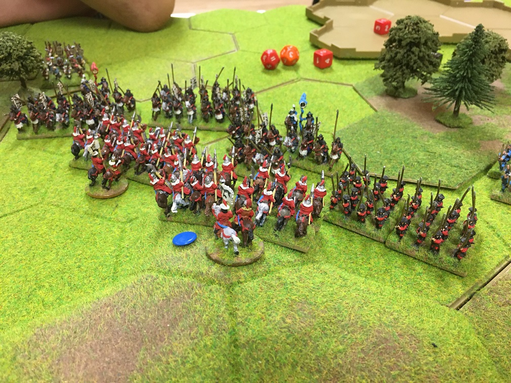 I advanced my horse archers and medium cavalry and Tony responded with his mounted Samurai forcing them to evade. This bought time for him to position his peasants between and inside 2 areas of woodland which made them into a major obstacle for my 8 units of cavalry. For the loss of one unit of cavalry for each side, the Samurai cavalry withdrew behind the peasant infested woods!