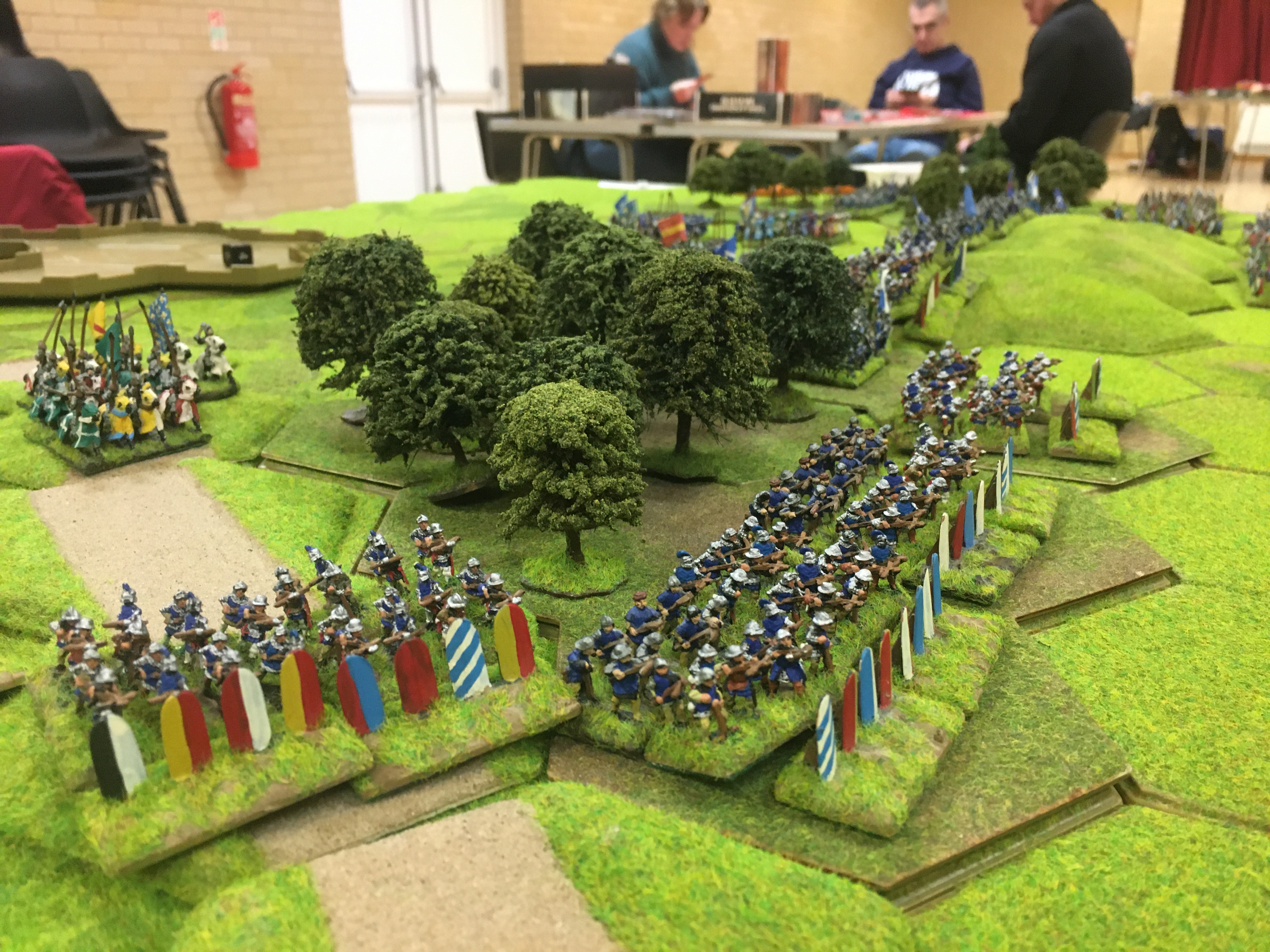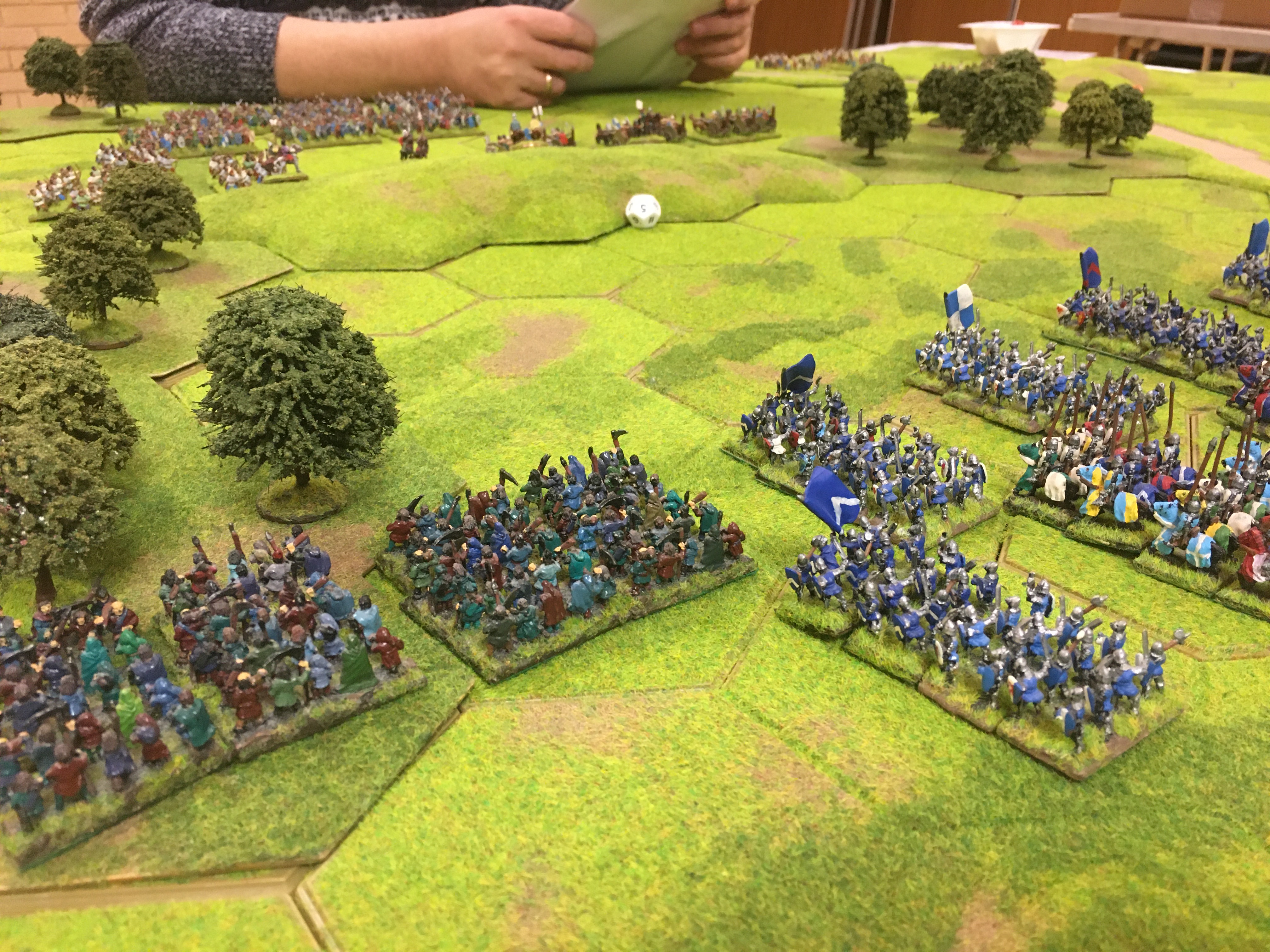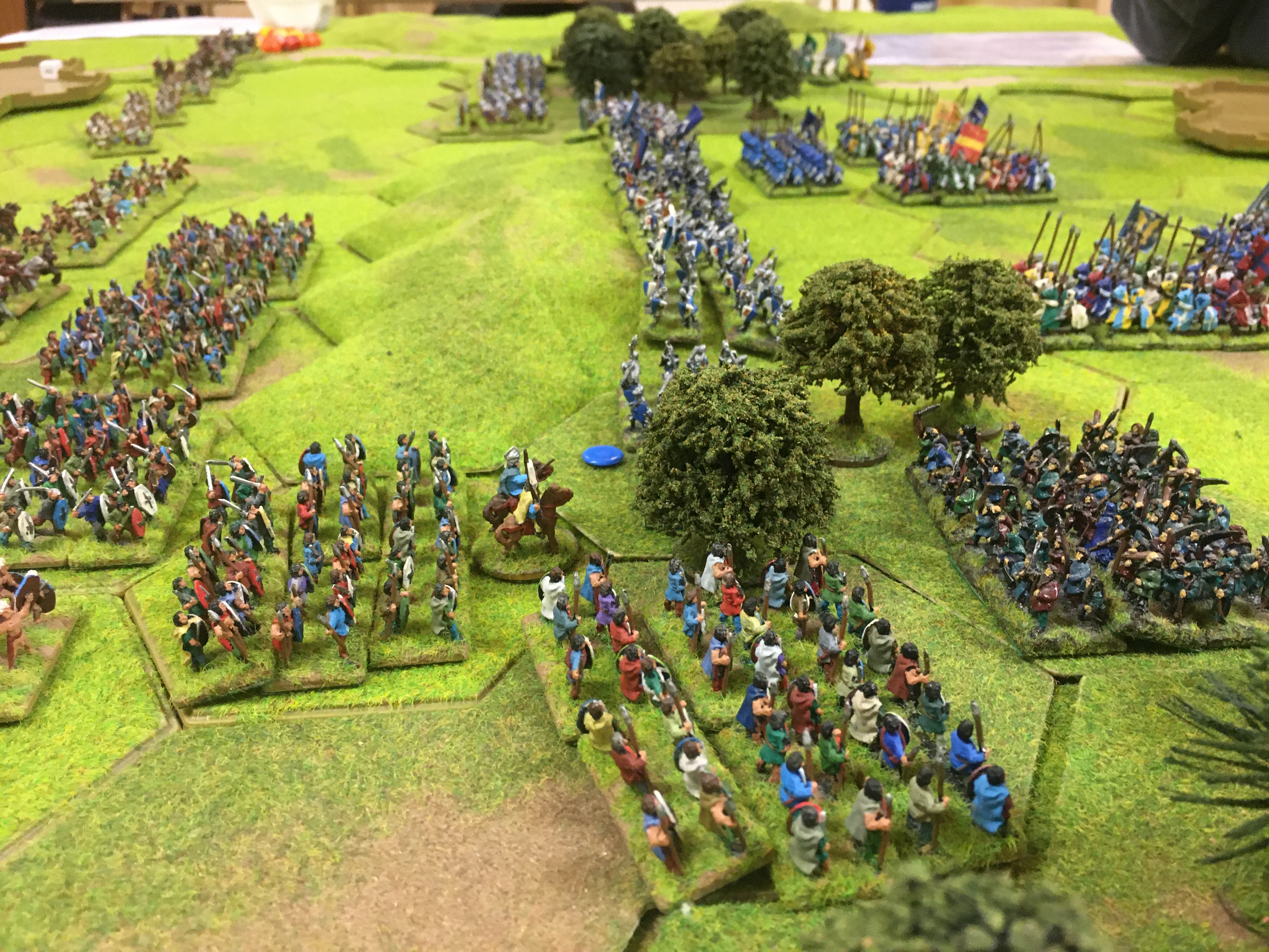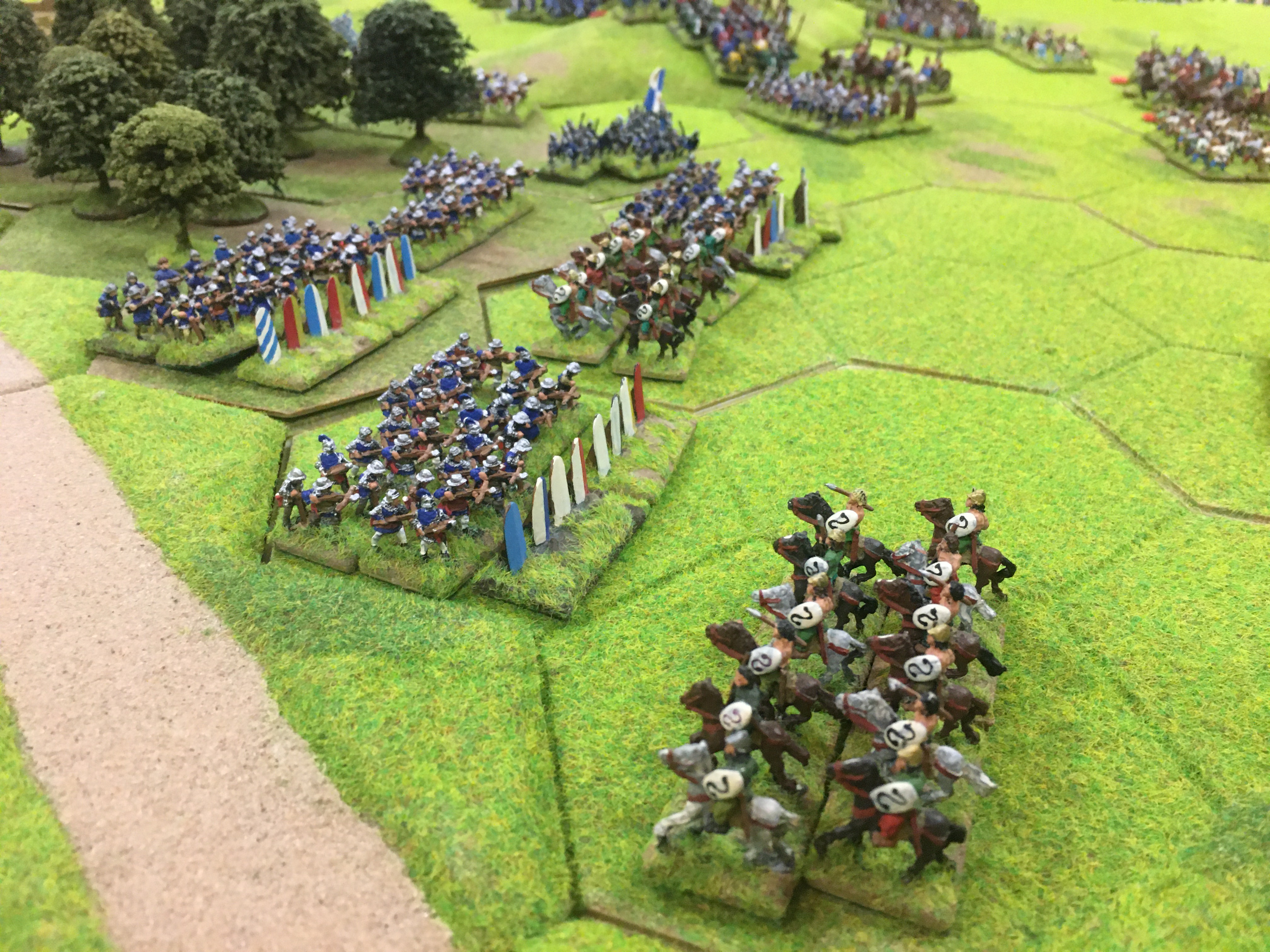 With the woods key to the French holding a strong defensive position they were the obvious target for the French quick advance. Tim used the road to move his crossbow units towards and into the wood on the right while I advanced the two 6 stand peasant horde units into the left hand wood. The central 8 hex hill, between the woods was the target of the dismounted followed by the mounted men-at-arms.