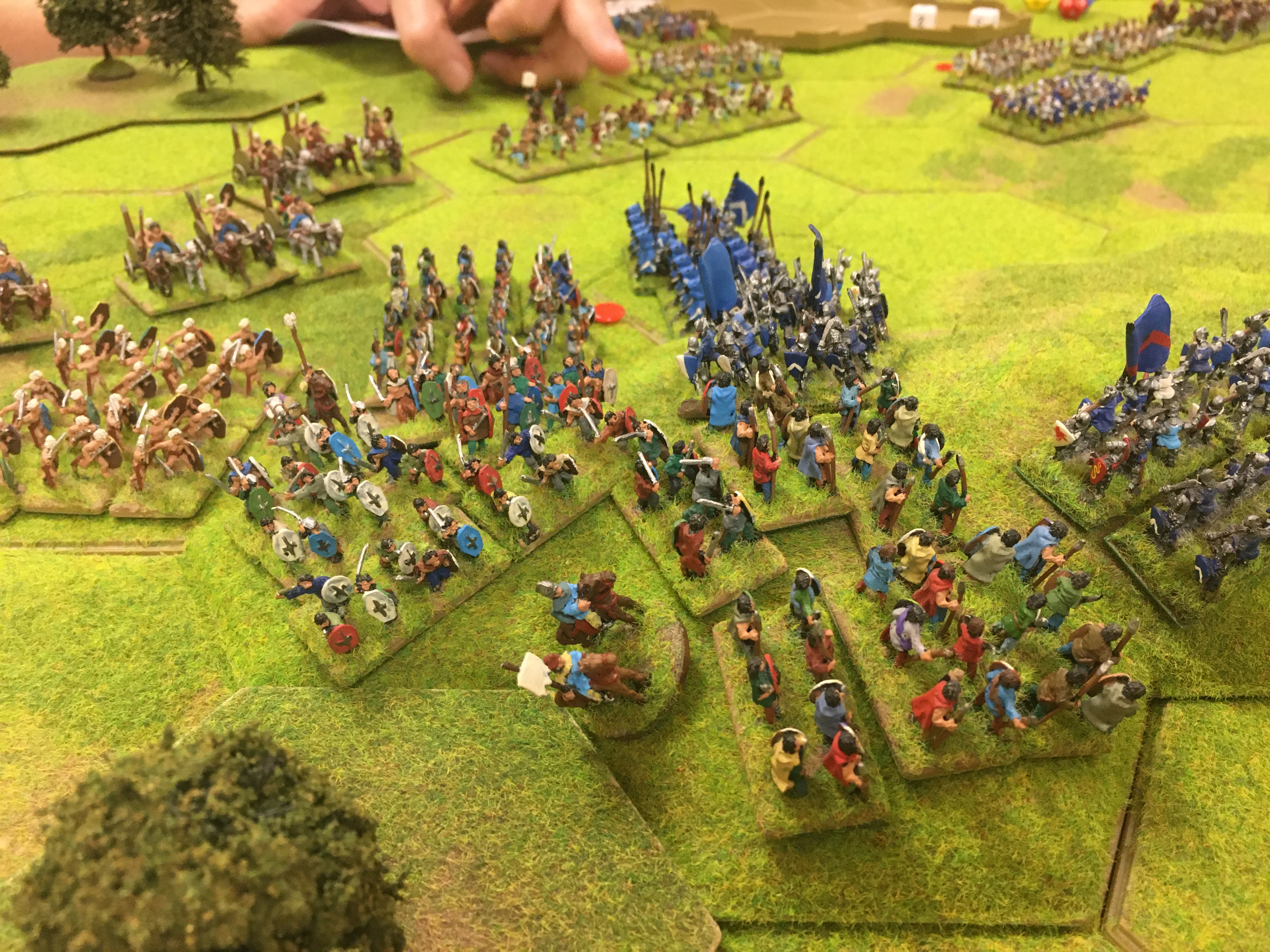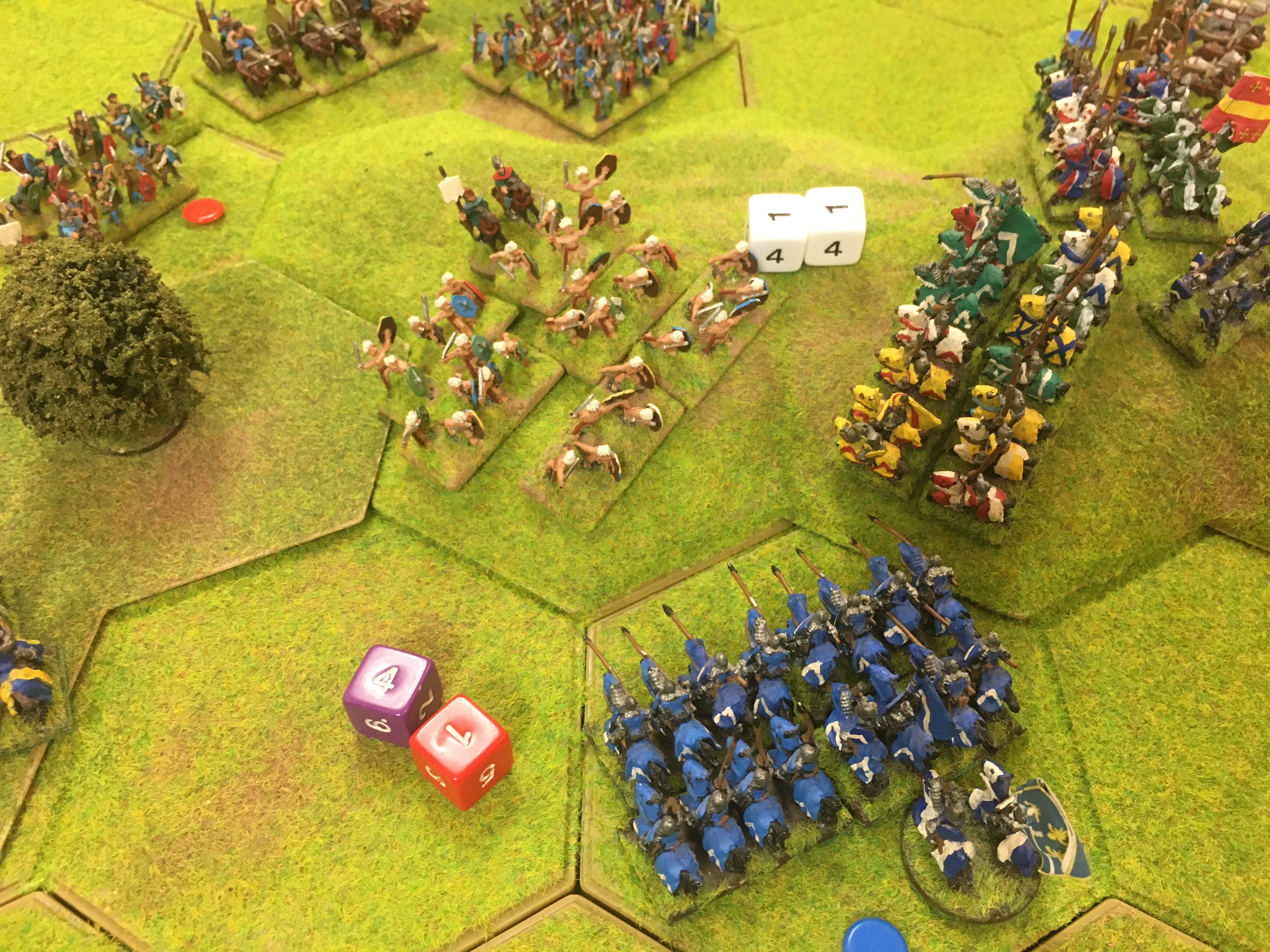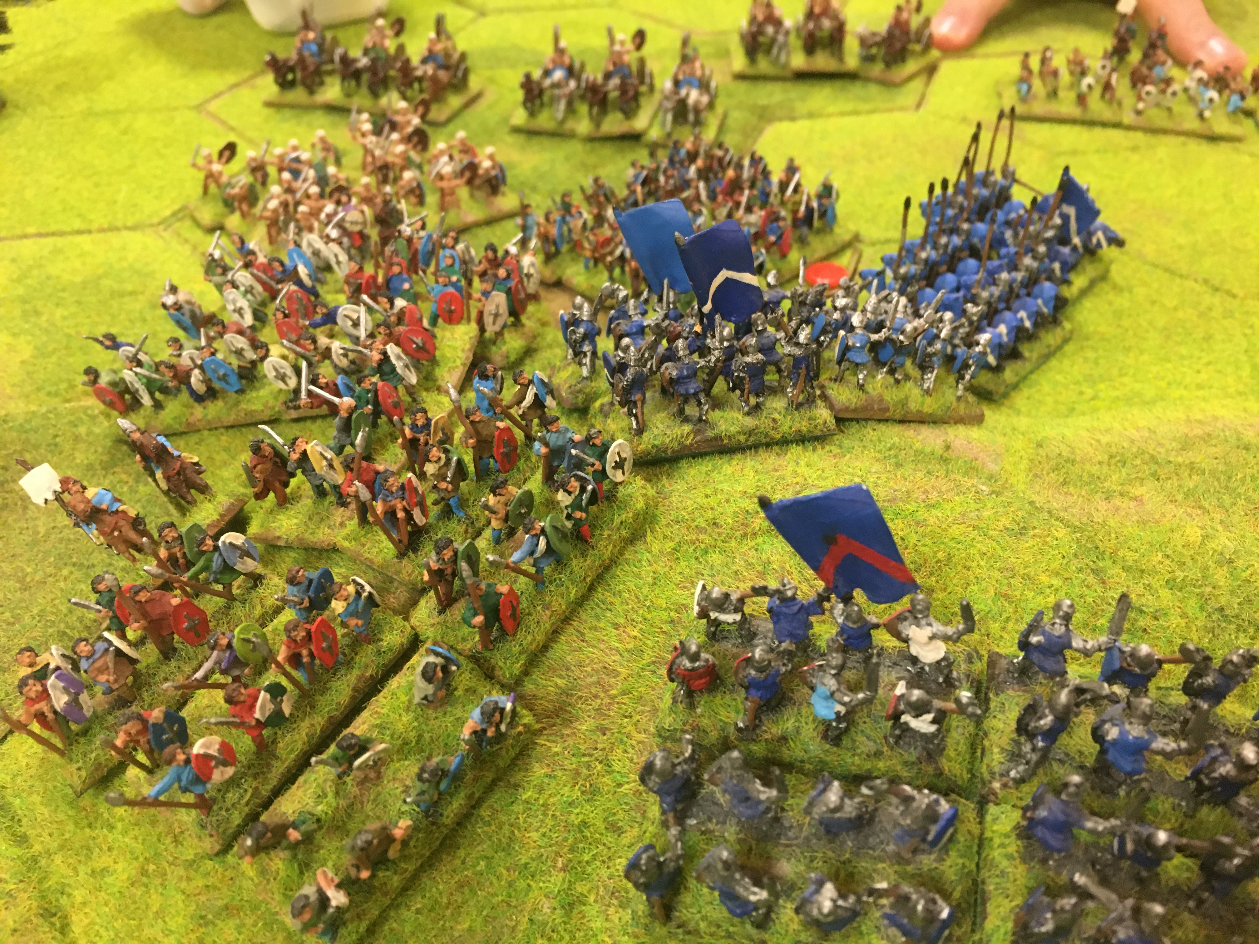 With the opposing infantry lines now ‘thinned’ through casualties in the battle for control of the 8 hex hill and left hand woodland, the remaining French heavy cavalry units were given the space to charge onto and across the hill. They were accompanied by the last uncommitted French generals and the resulting hand-to-hand combat phase dealt a decisive blow to the Ancient Brits. Large numbers of warriors and fanatics were recoiled disrupted. More significantly, the command and control of the Brits was almost non-existent. As a result the Brits couldn’t make any tactical movements in the next phase and could only remove disruption markers from their units not engaged in combat. The British light cavalry units had now been defeated by Tim’s crossbow units and the Brits by now run out of options and accepted defeat.