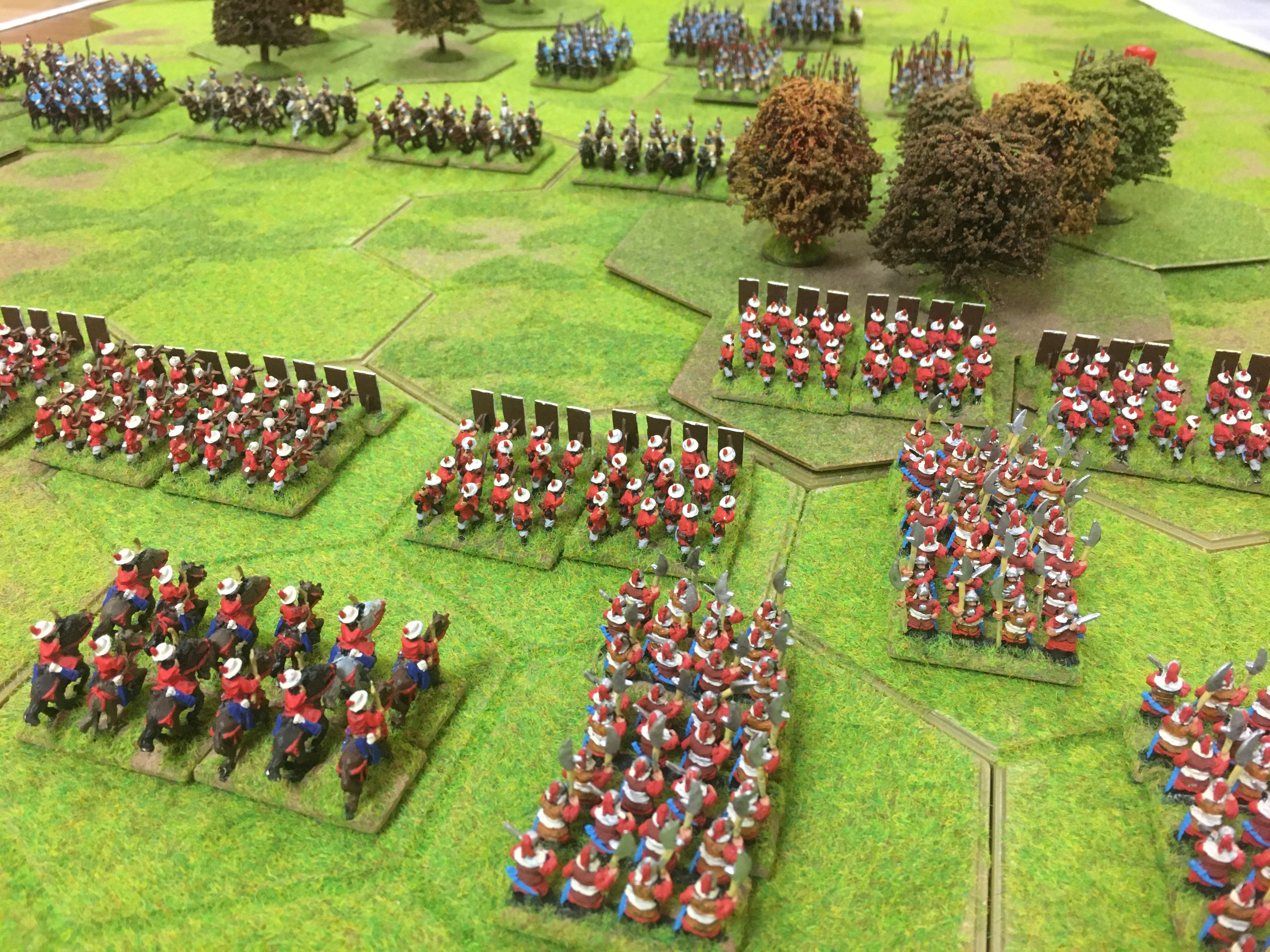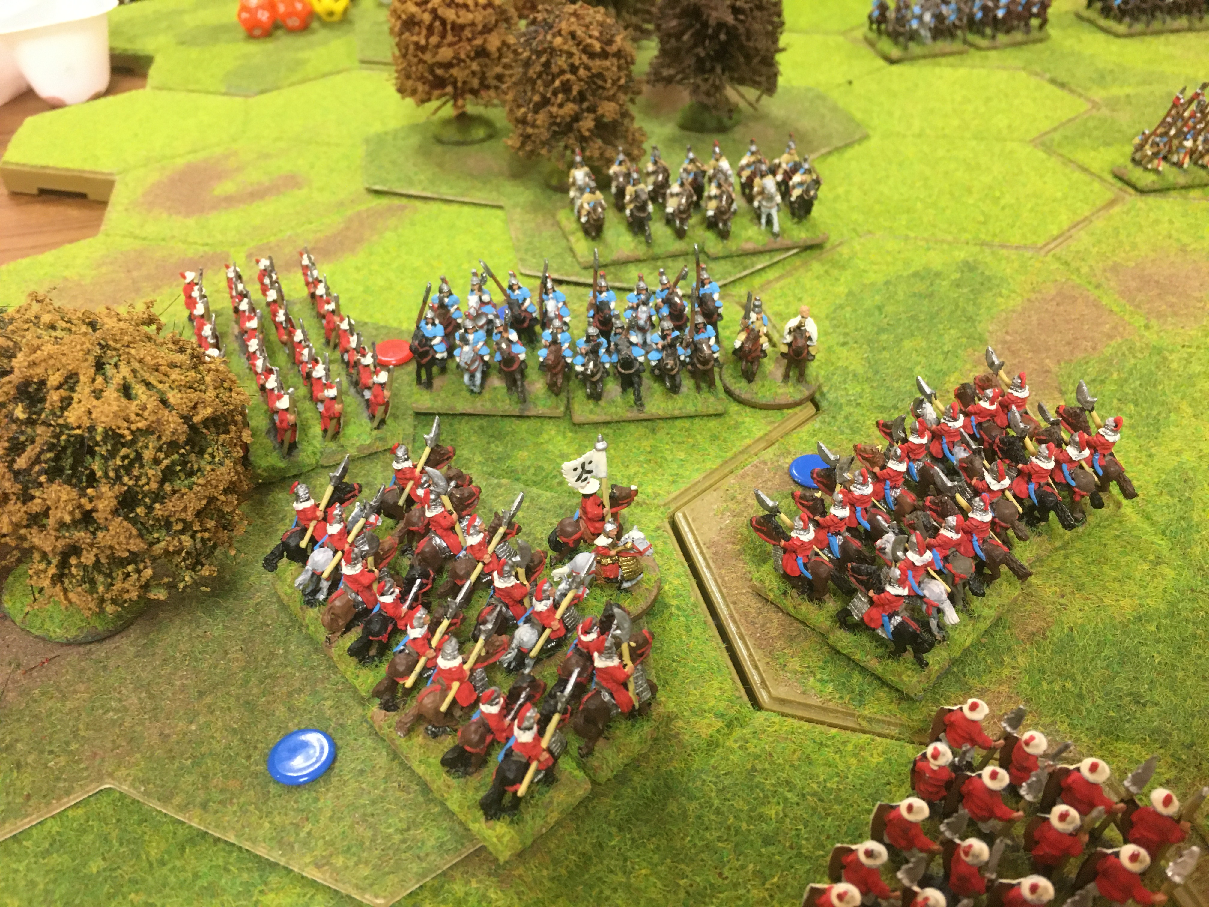 The Koreans deployed first and my Chinese won the dice roll for first move which I used to close the distance towards the woods. This was a deliberate attempt to close down the movement options of the excellent Korean cavalry. The light and heavy Korean cavalry units were all deployed on the forested side of the table. This I convinced myself was a ploy to pull my cavalry to the left so that the Koreans could switch their cavalry across behind the centre to the other wing into the more cavalry friendly open ground.