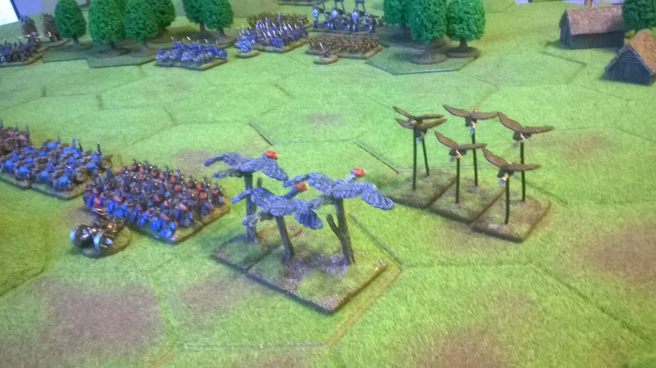 the Barbarians moved first . their birdmen caught the vultures on the hop and flew over to attack them. the infantry advanced slowly in the centre. their cavalry worked around the woods to their right.