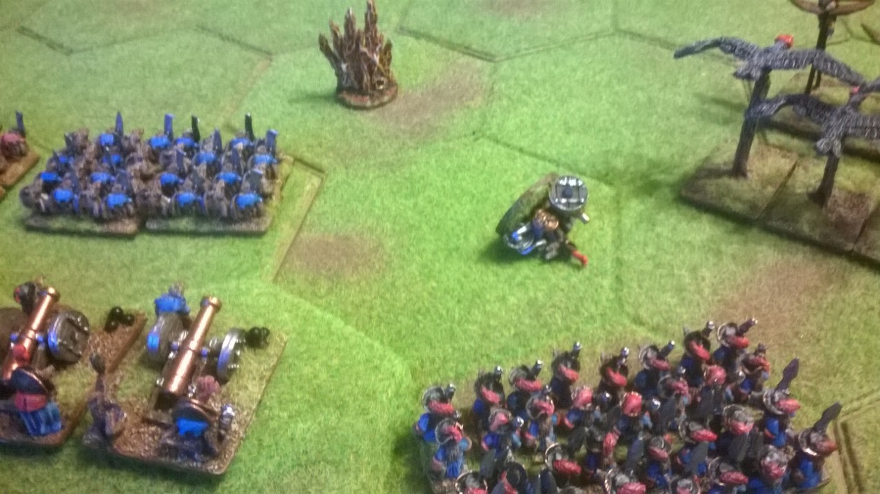 The Ratmen had two units of fliers vs the Barbarians' one unit of fliers so had the choice of deploying 1st or 2nd. they chose to deploy 1st with a strong artillery position on their hills , protected by 2 mixed ratguard musket/halberdiers and 2 small rat hordes. they had their balloons and armoured cars on the left flank and vultures on the right flank.