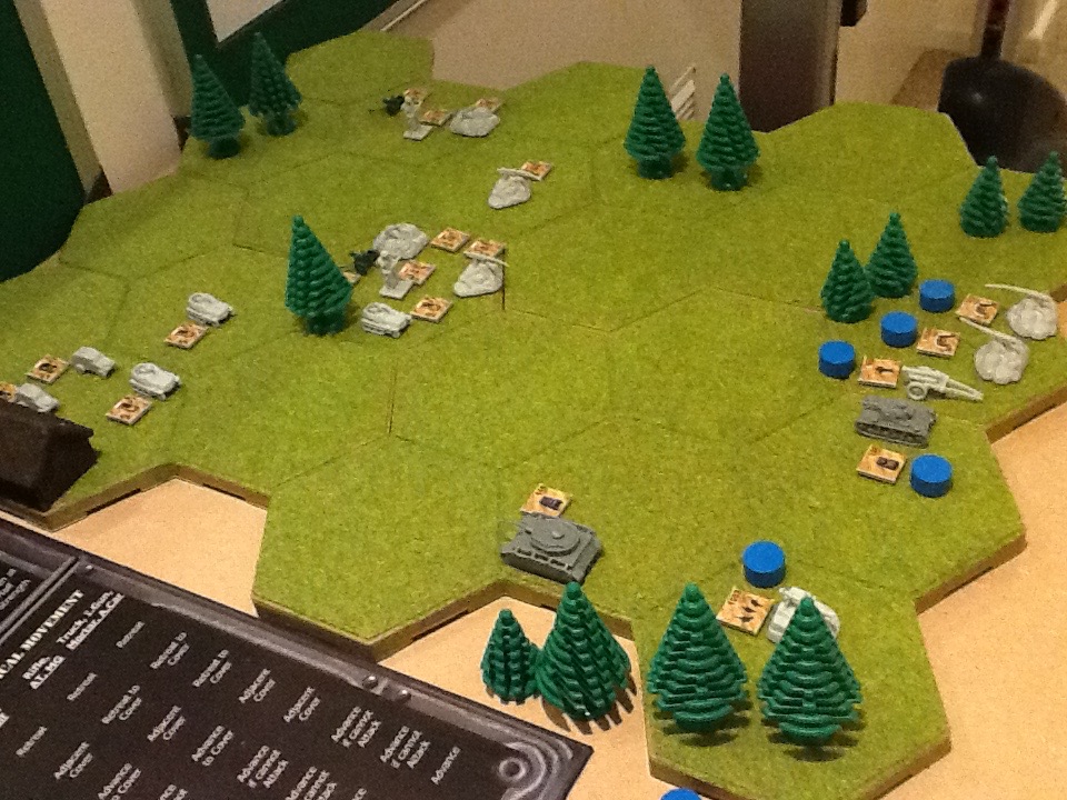 The blue disks on the battlefield indicate that the German troops have not (Moved and Fired straight away) yet - this is like one action if it is permitted (e.g. some pieces can only move one hex or fire). The disks also help me make sure I do not miss a units turn or have a units turn twice. With just the chits I found this very difficult myself and kept getting into a muddle although I'm sure there are people who are more alert than me!