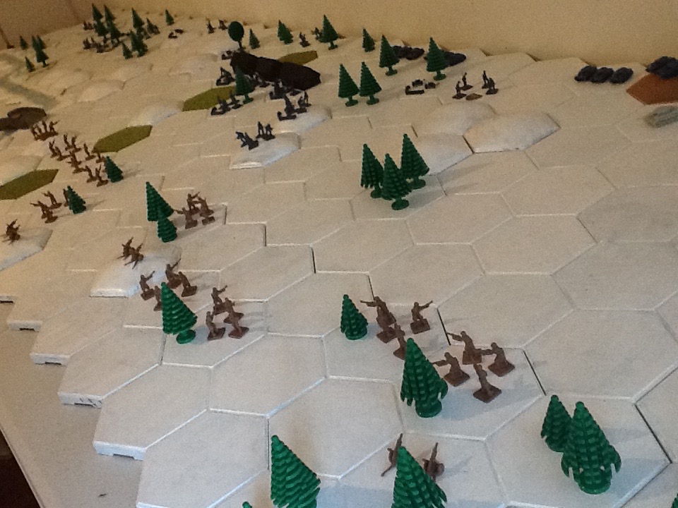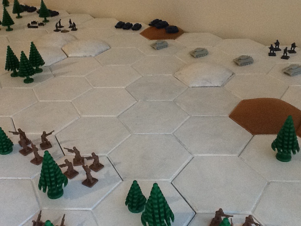 The pictures are of the Memoir 44 scenario "Tigers in the Snow" which uses two winter white boards. The photos show this set up using kallistra (brown boards painted white). I ran out of single white hexes so the two boards are joined with 4 green single hexes. It takes 18 hexon II boards and 5 singles to make one Memoir 44 board.