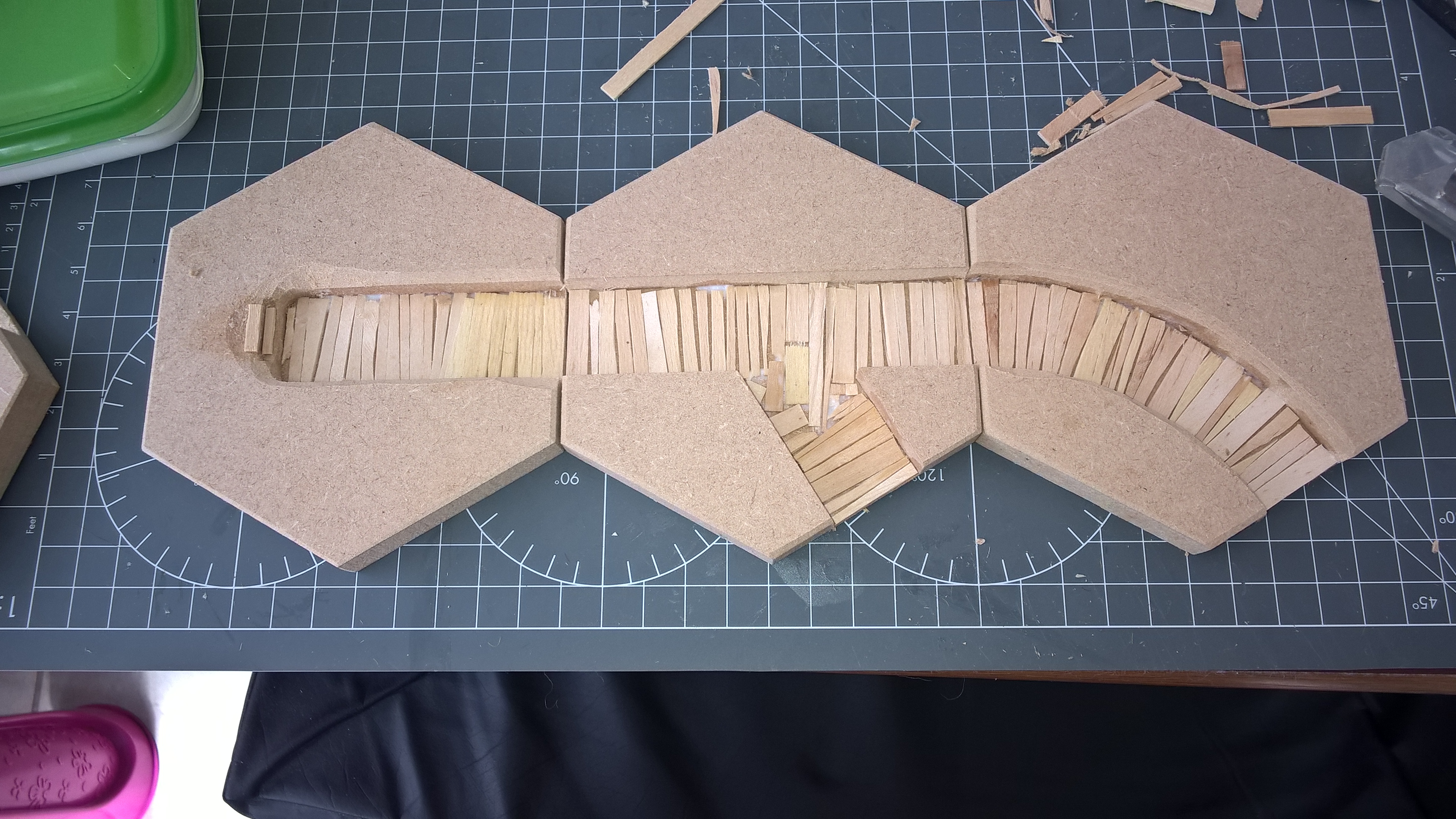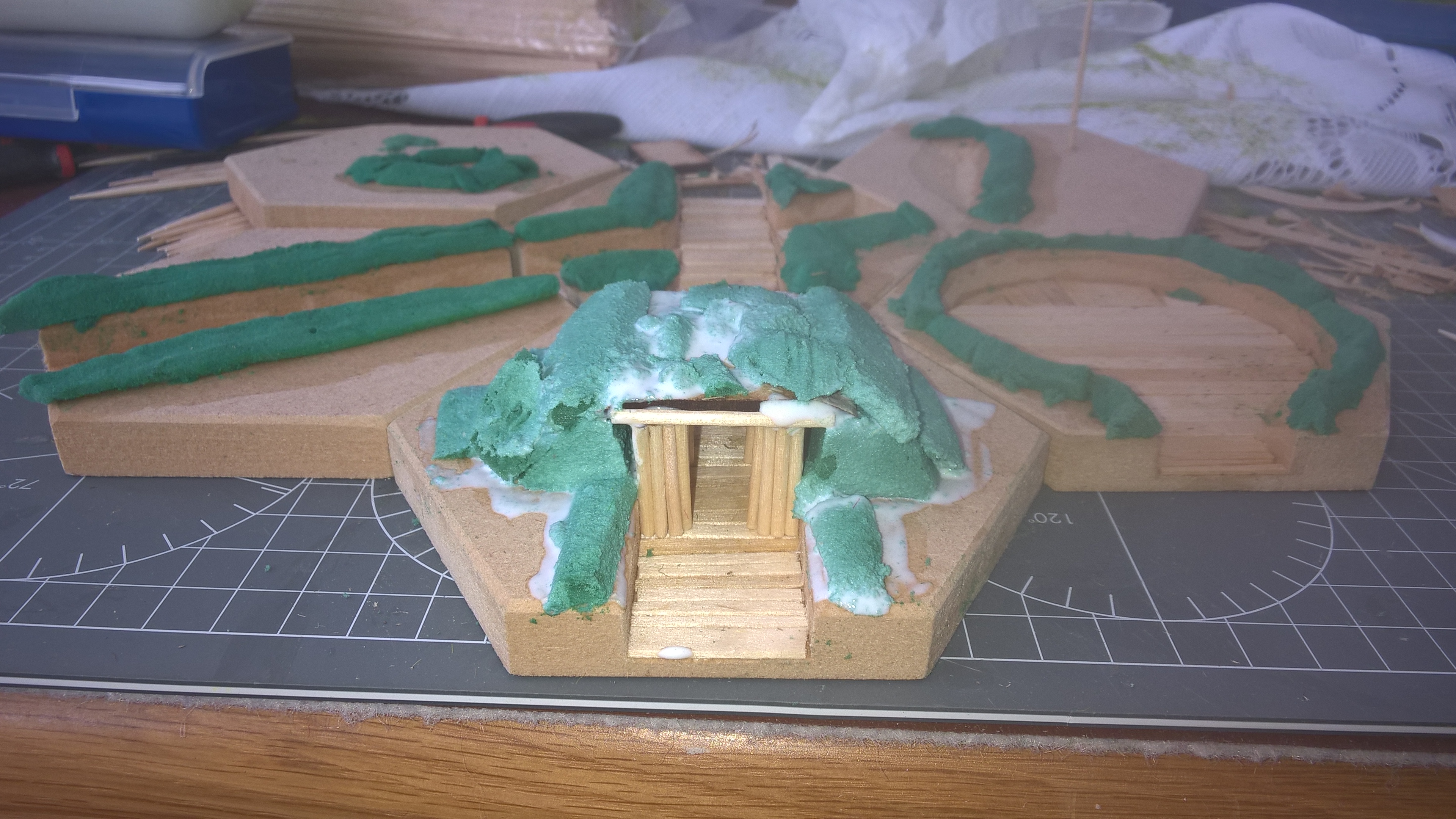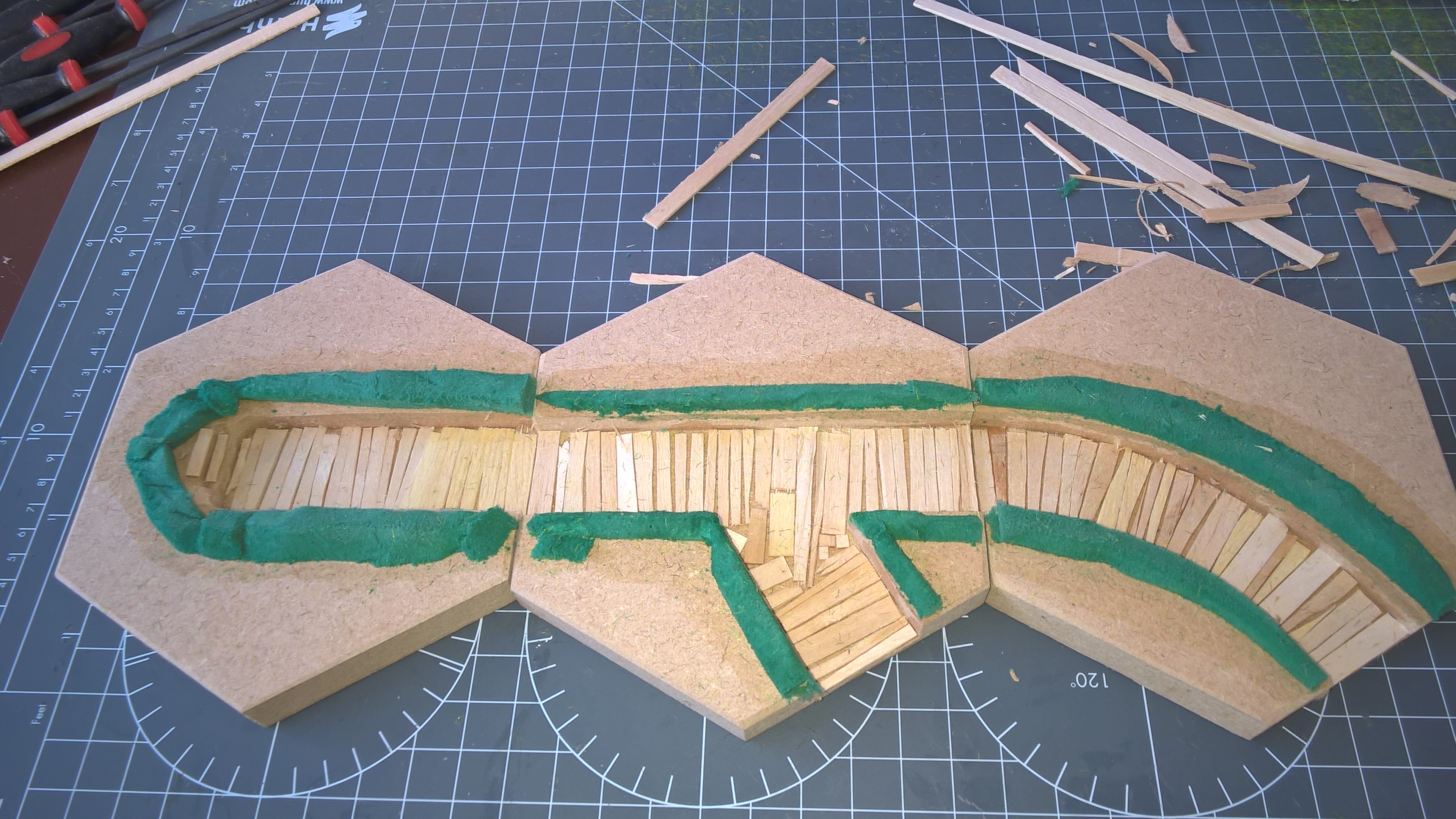 I used split firelighters and floral oasis pva'd in place. Flocked and then tufted. weathering to come. I didn't edge them properly. All hexes are chamfered to ensure the hexes are still wholly apparent. Alas I think I didn't flock up to the line well enough, but this was first effort. Hexes were purchased from a reputable company, and have the advantage of all being the same as their machining standards are high, plus the 25mm trench cuts all align :-)