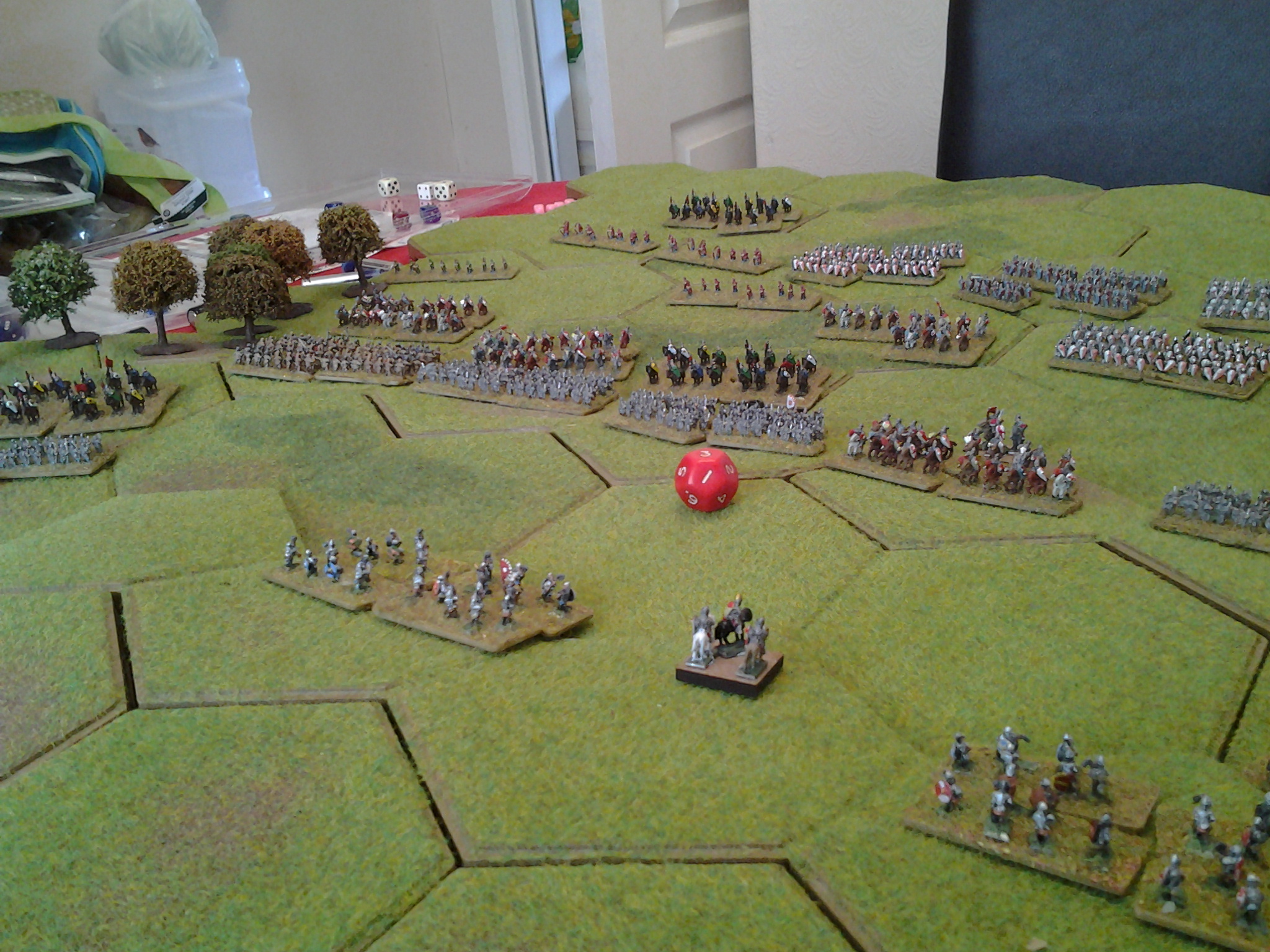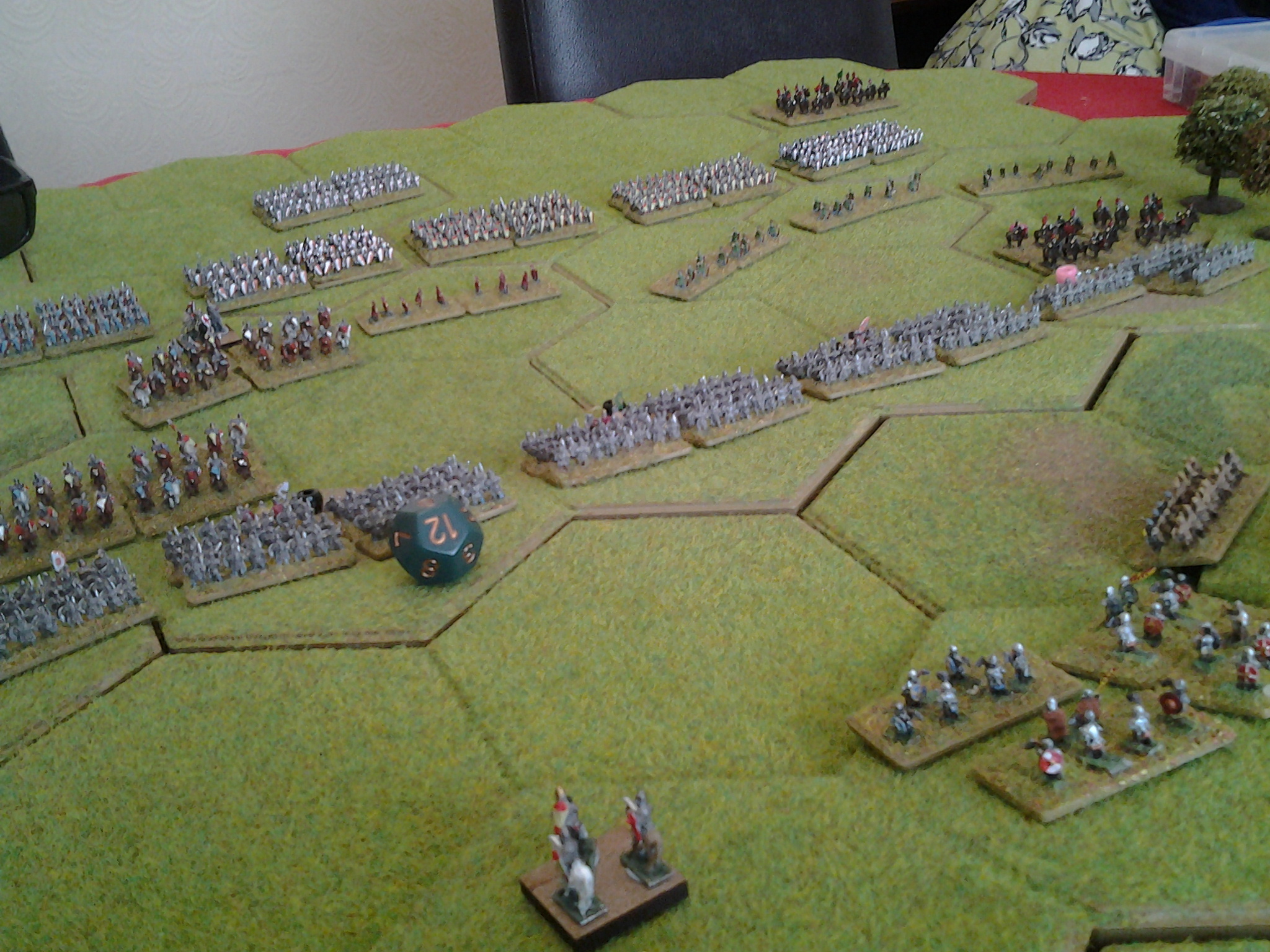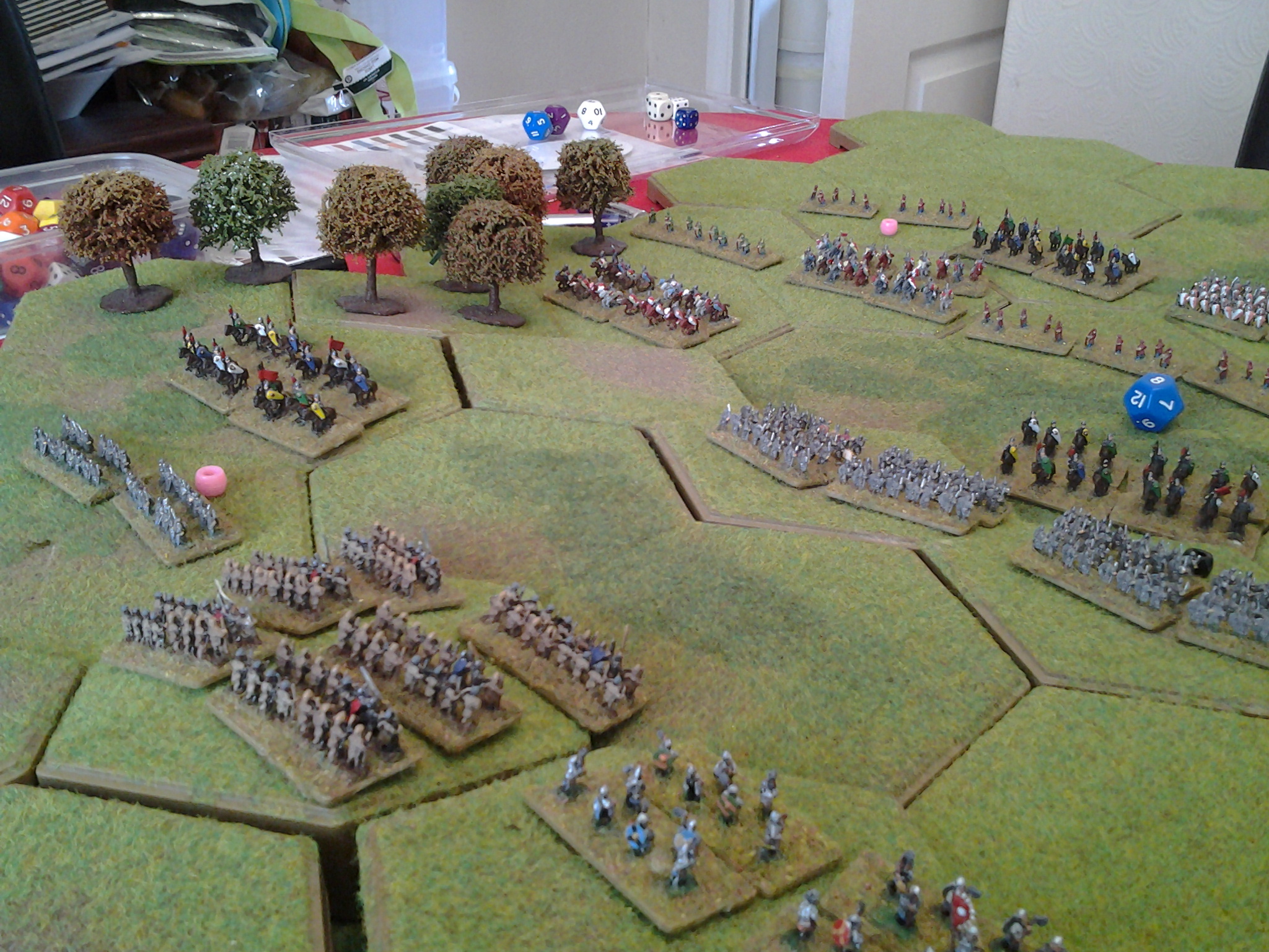 Saxon huscarls v's disrupted Norman knights with Leo the impetuous leading boldly from the front. Only to have Leo lead them quickly to the rear (A loss by 1 more pip and Leo the impetuous would have died on the field of battle and England remain in the hands of the Saxons)