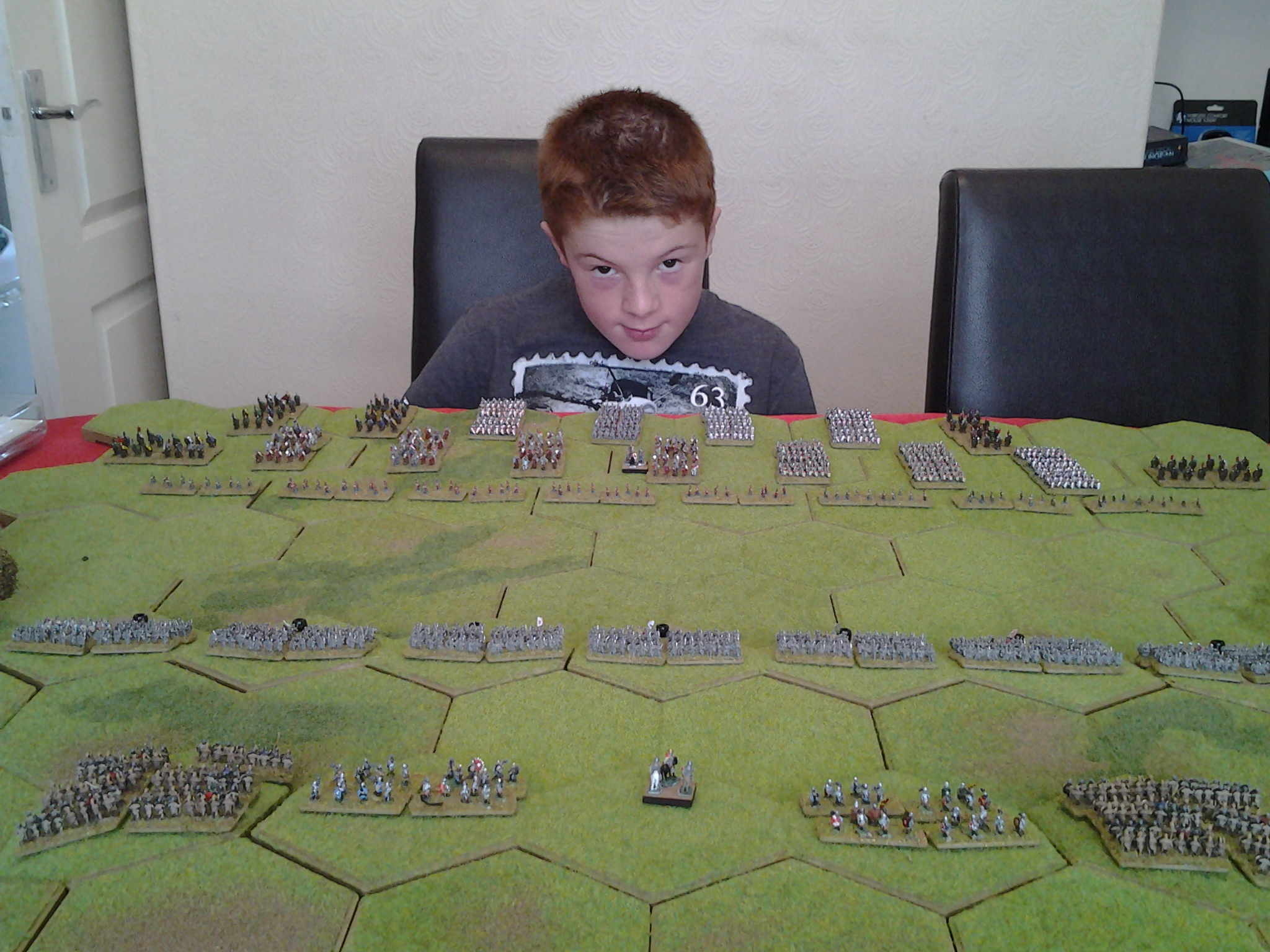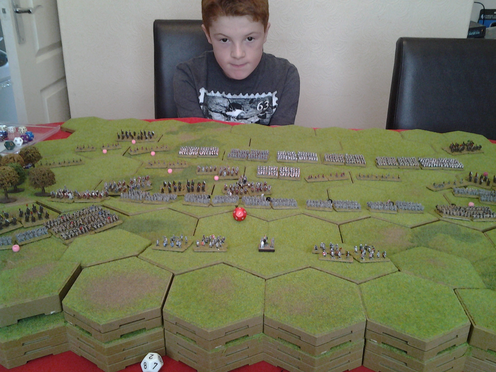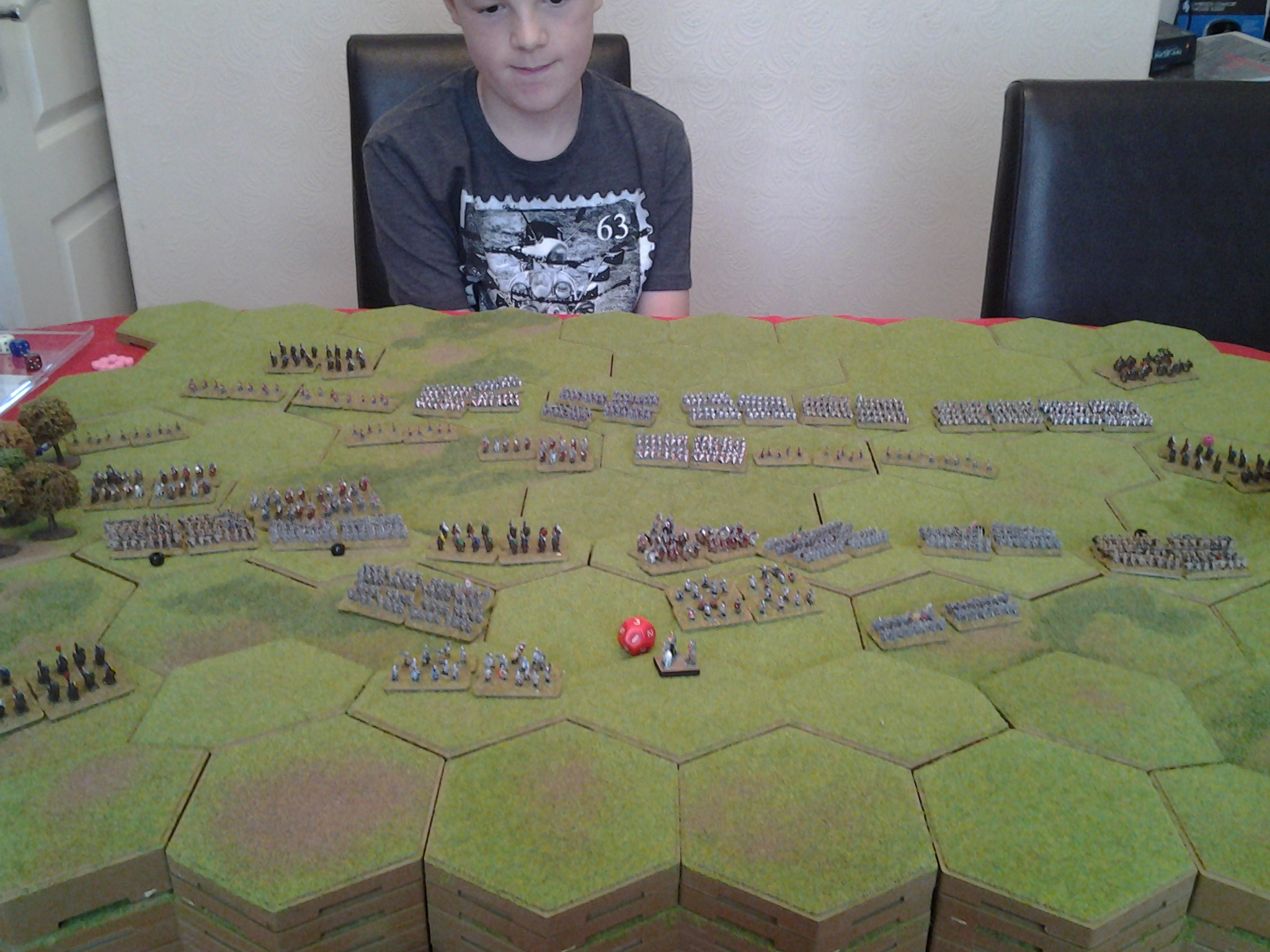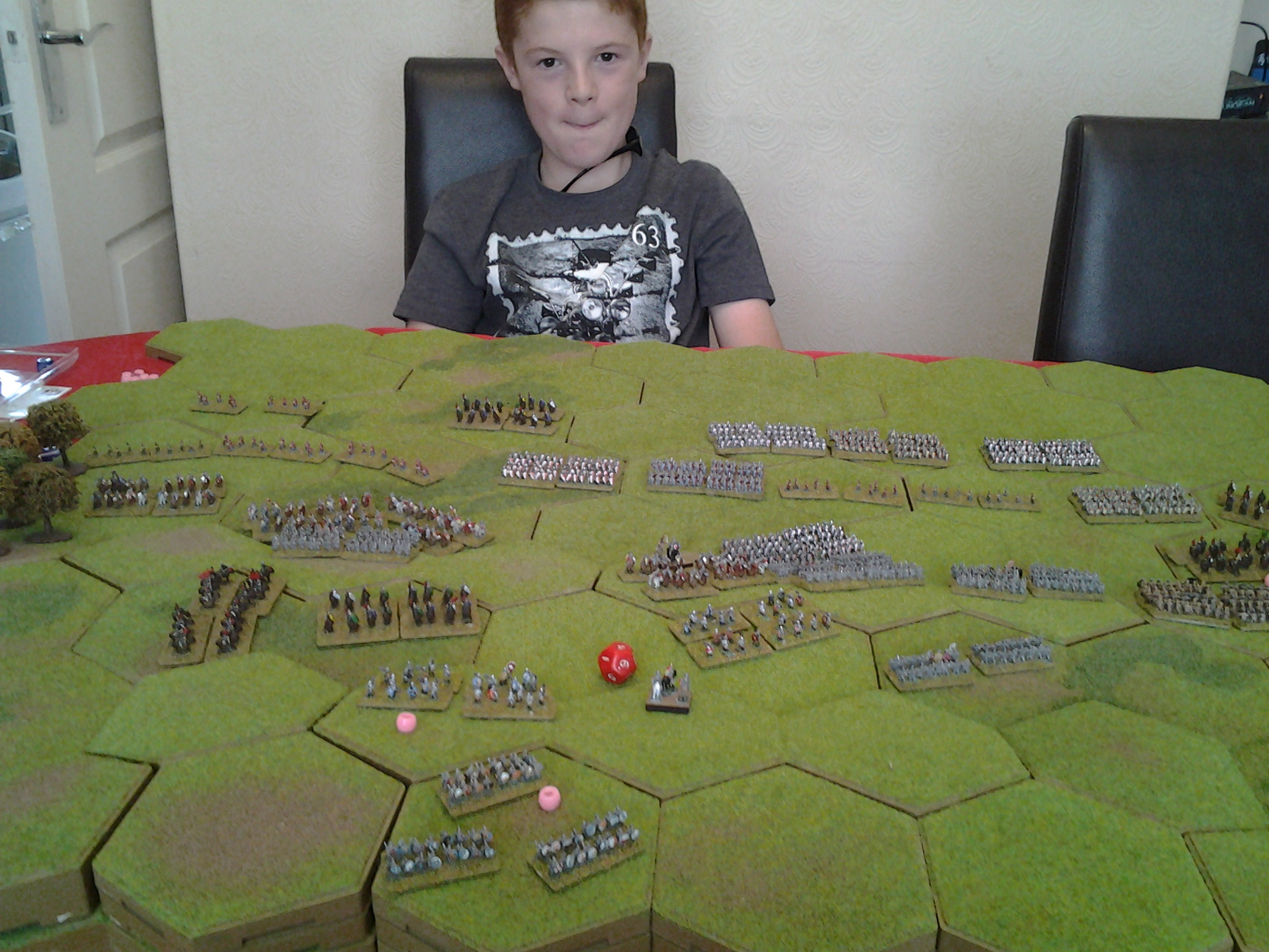 Saxon huscarls v's disrupted Norman knights with Leo the impetuous leading boldly from the front. Only to have Leo lead them quickly to the rear (A loss by 1 more pip and Leo the impetuous would have died on the field of battle and England remain in the hands of the Saxons)