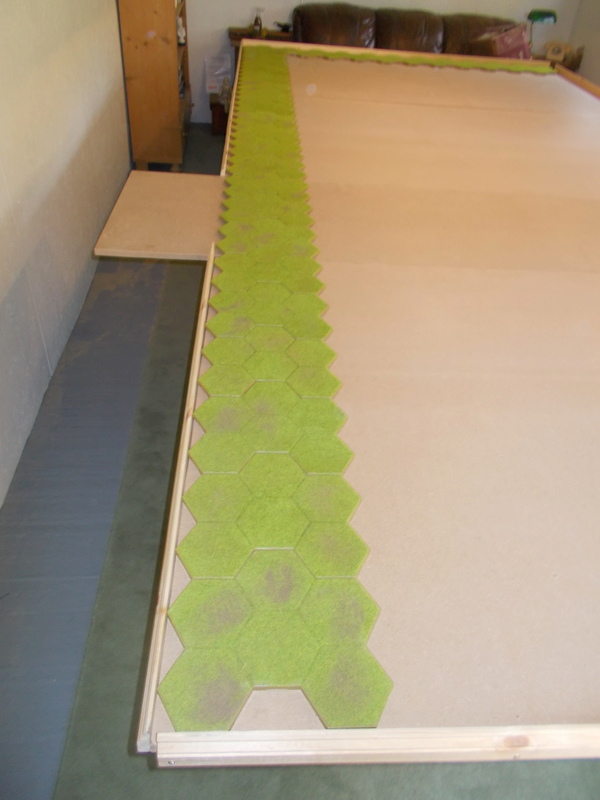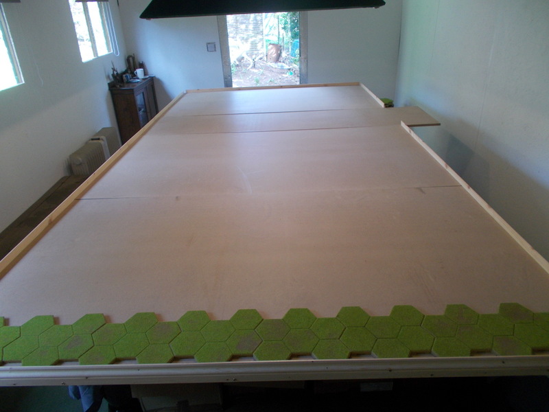Here is the finished gaming table ready for the Hexon treatment. 14ft x 7ft or 8 hexon tiles wide (24 Hexes) by 21 tiles long (42 Hexes) :)