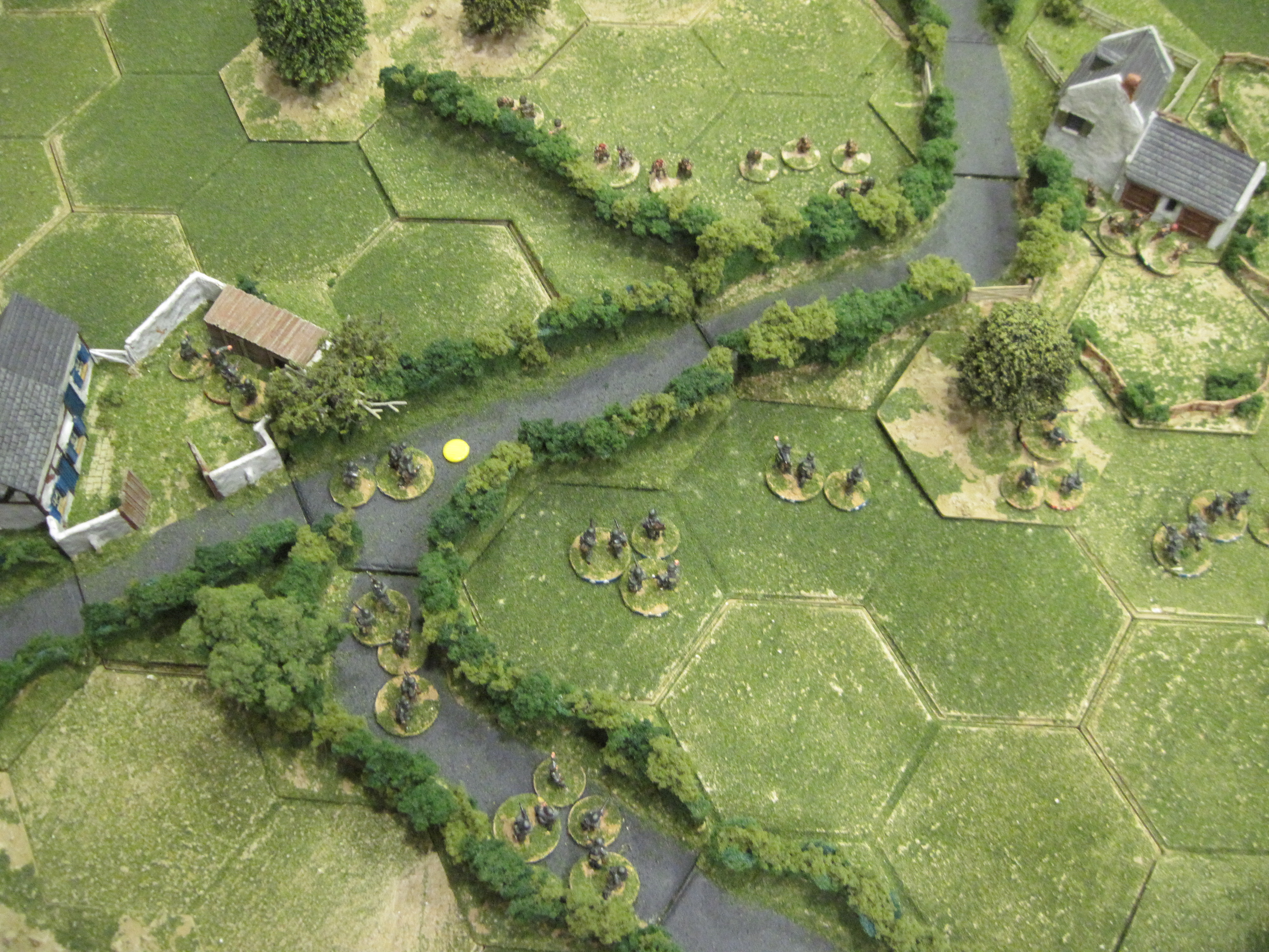 In this scenario the German players (Mick, Steve and myself), had possession of half of the table which included one of the two small hamlets which were located towards the centre on the table. The objective of the game for both sides was to have control both of these hamlets by the close of play.