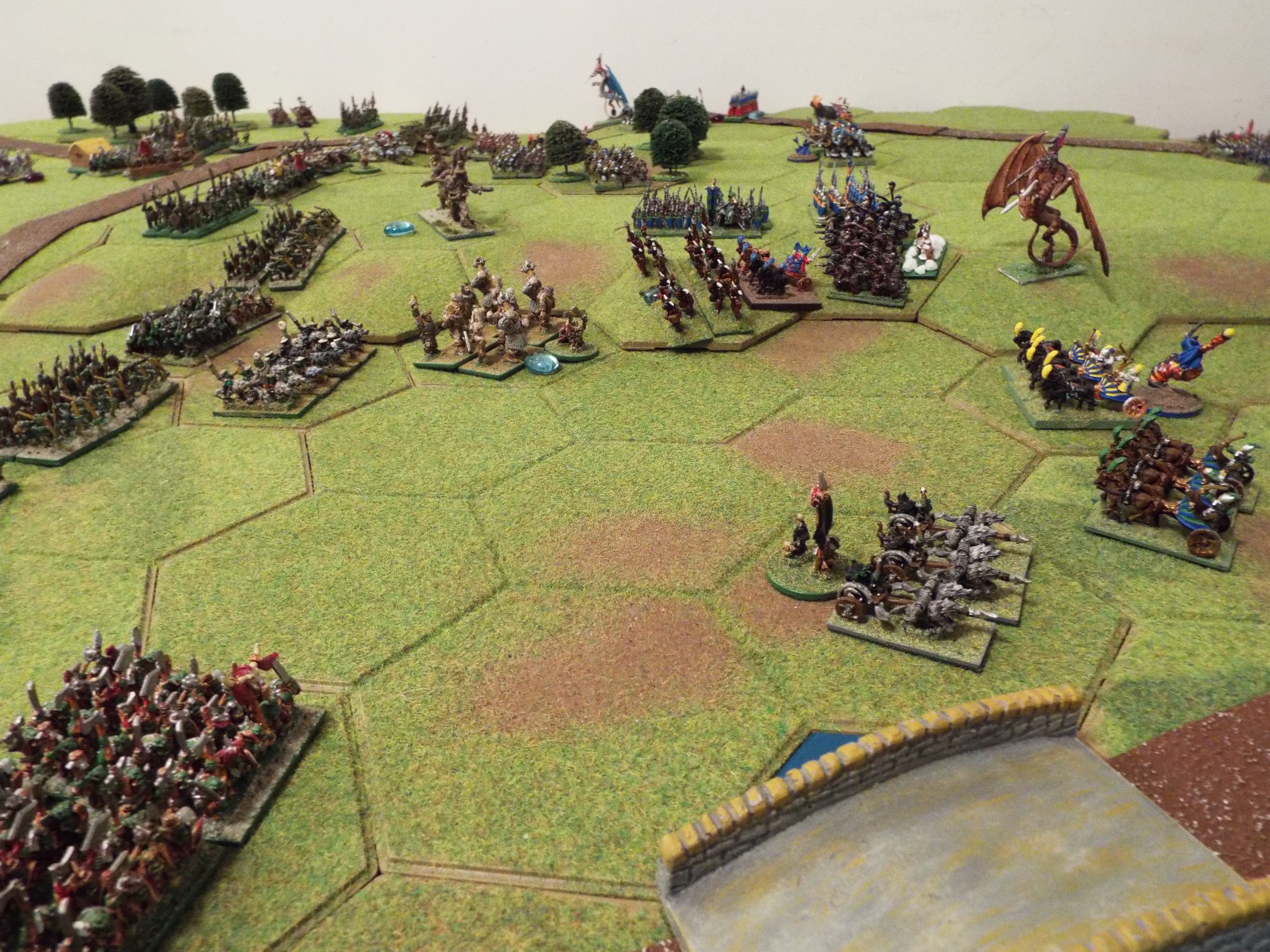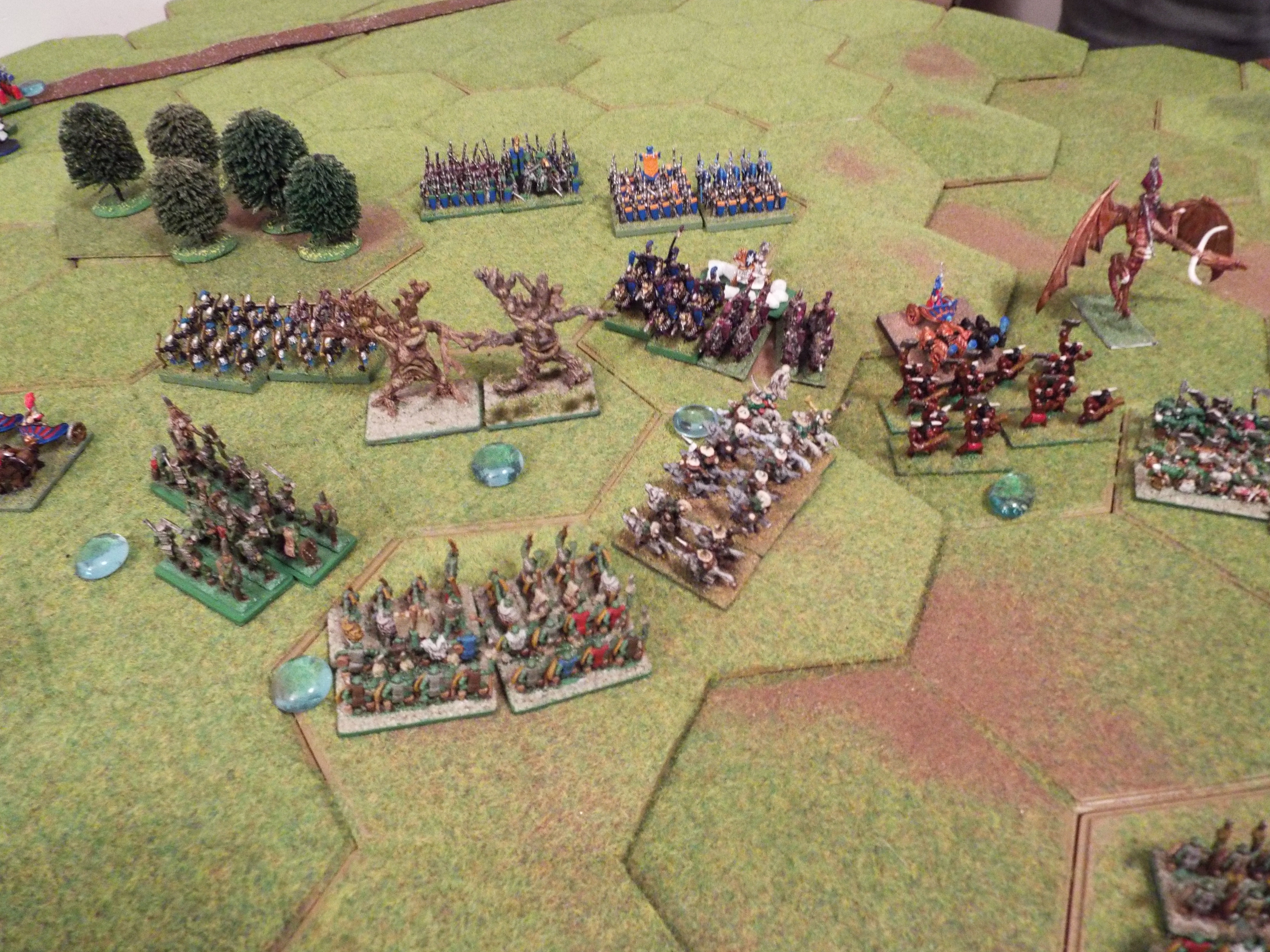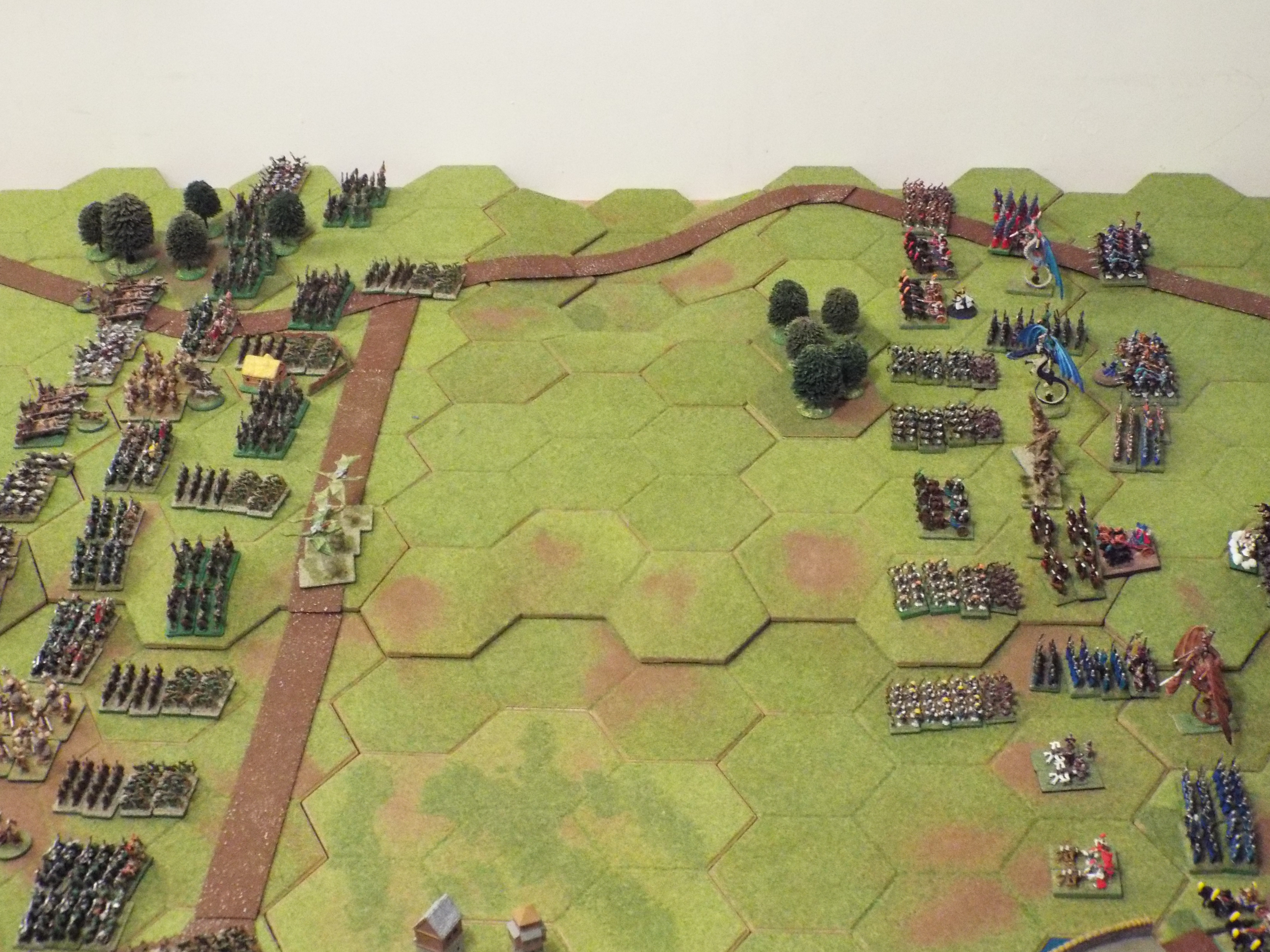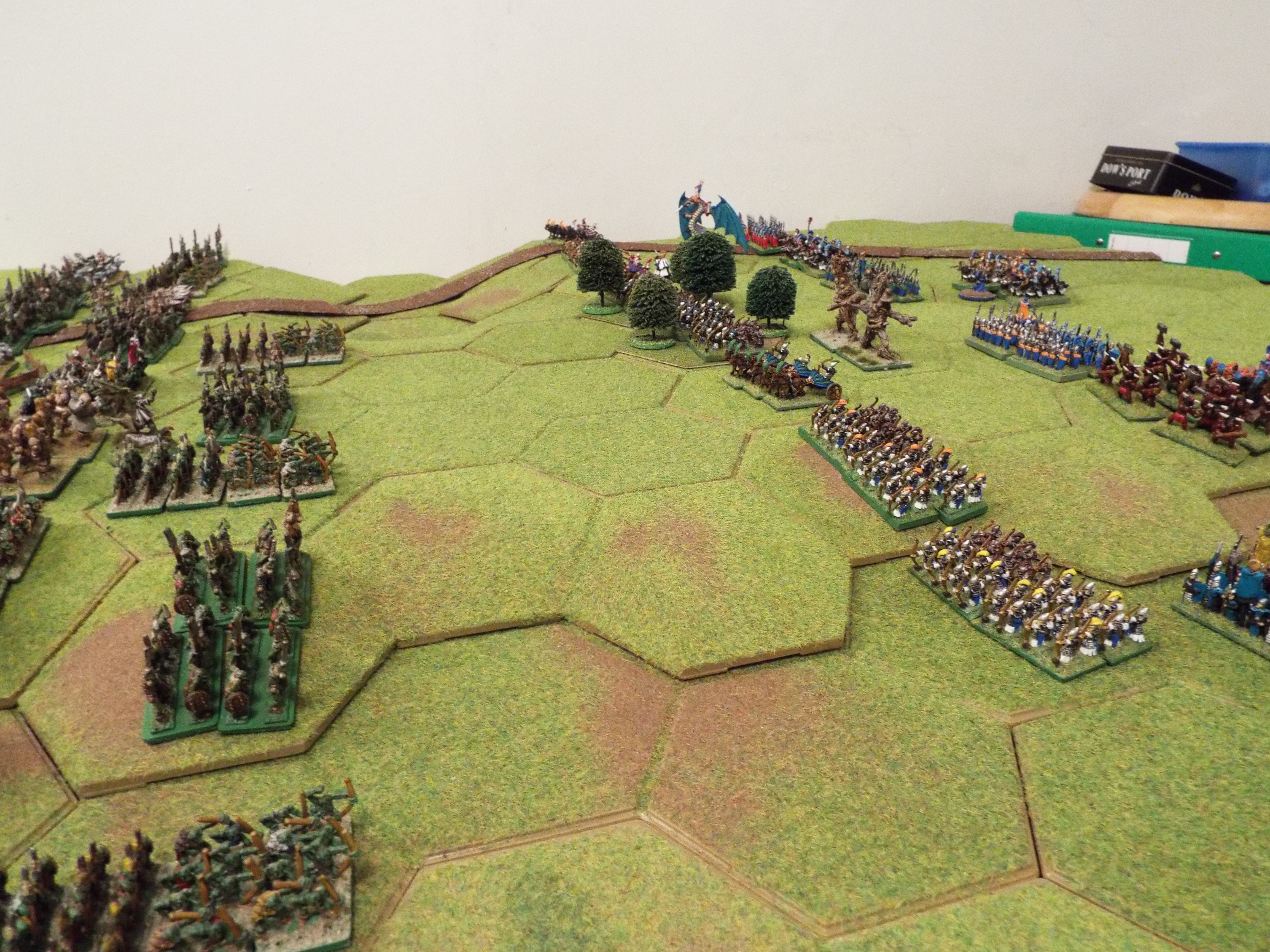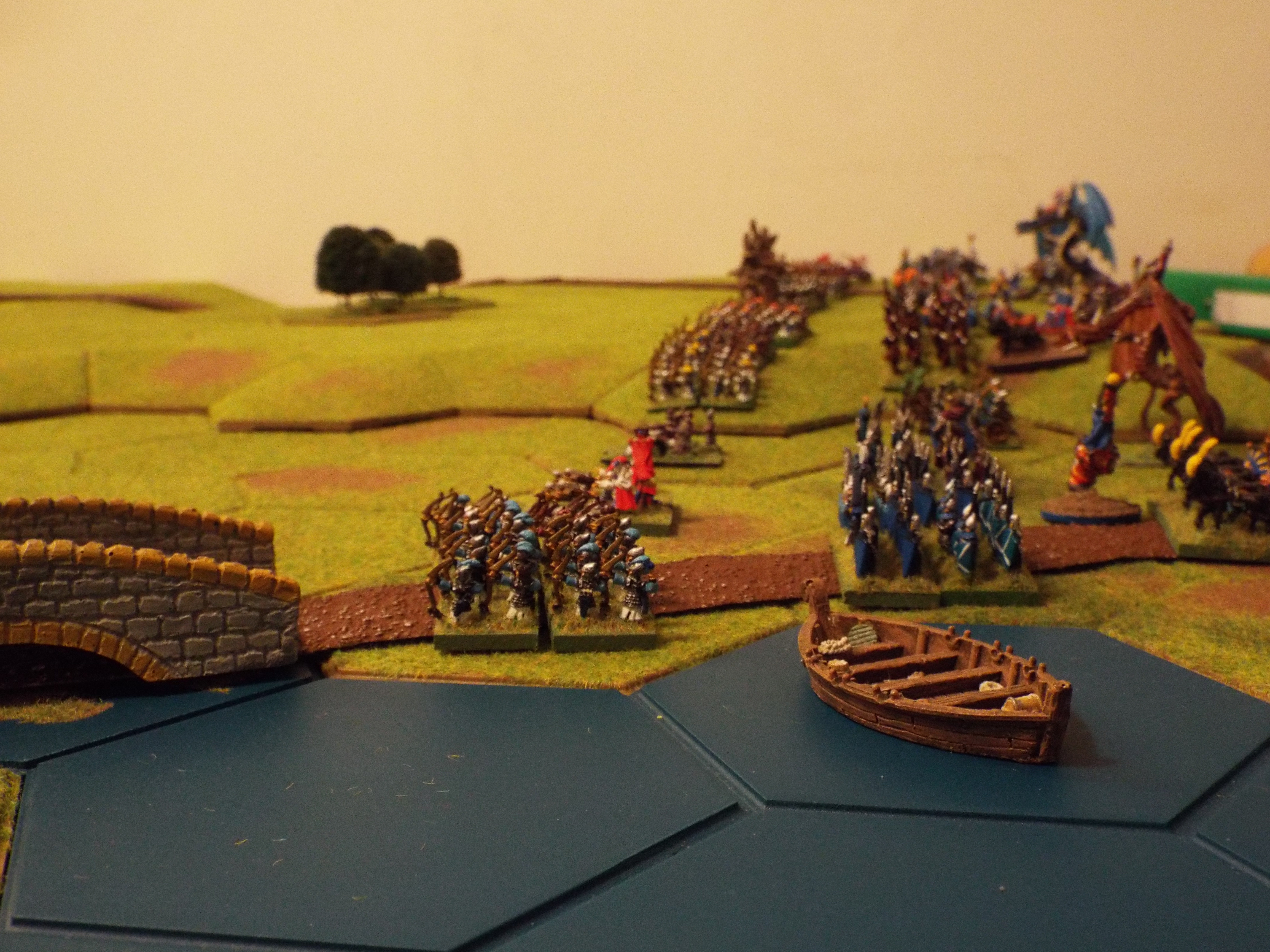 The elves responded by pushing their infantry forward in column, speeding past the treemen and artillery. The cavalry showed restraint, maintaining their support of the general advance. The threat of the orc archers kept the dragons firmly to the rear of the army.