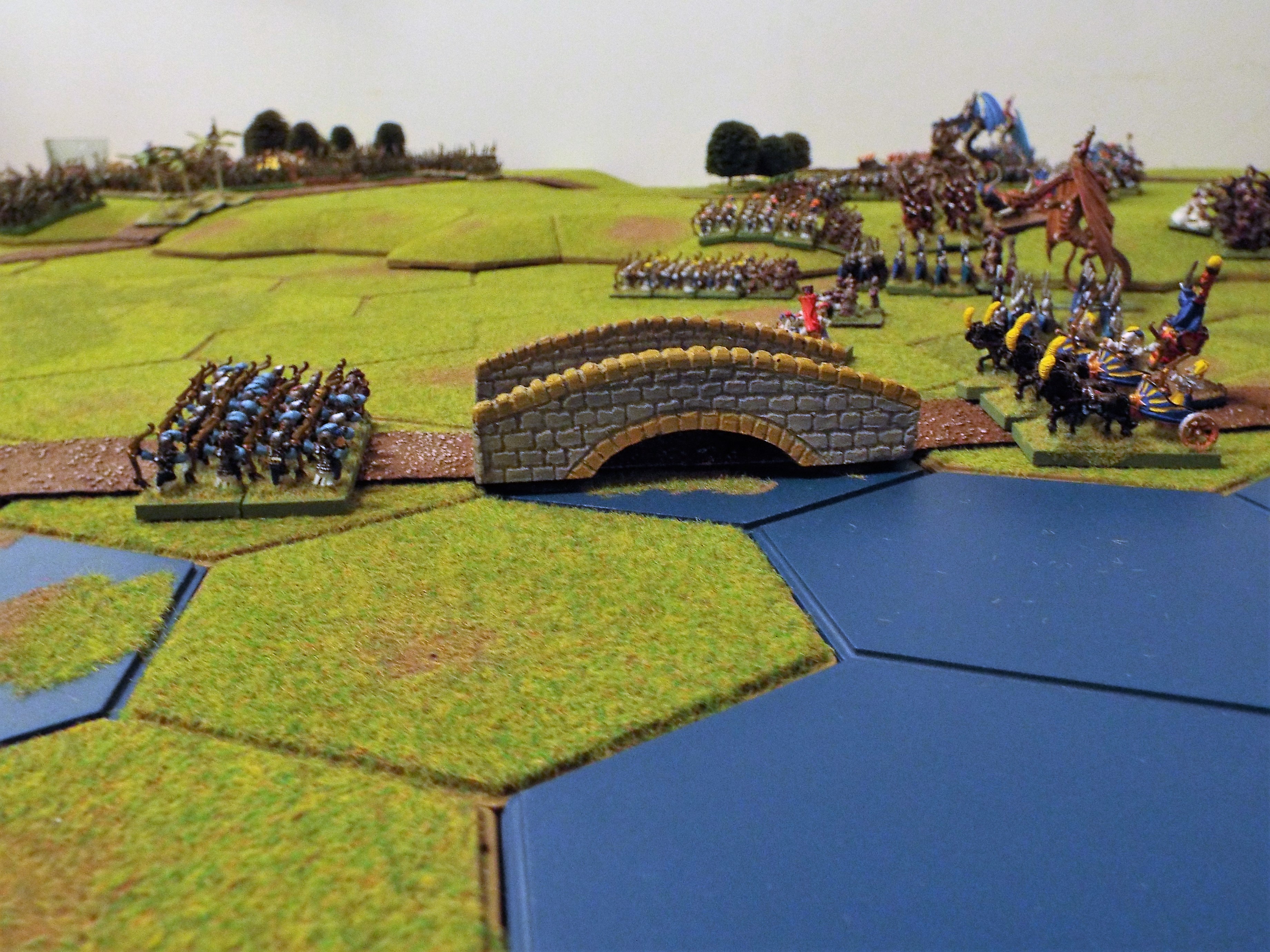 Mark’s response was to establish an unbroken line of archers and chariots along the entire width of the ridge, anchored strongly in a handy woodland. He pushed the bolt shooters forward again to pass the bridge, intent on giving them a wider arc of fire, dragons kept close to cover this advance whilst the orc generals around Caerfen watched with interest.