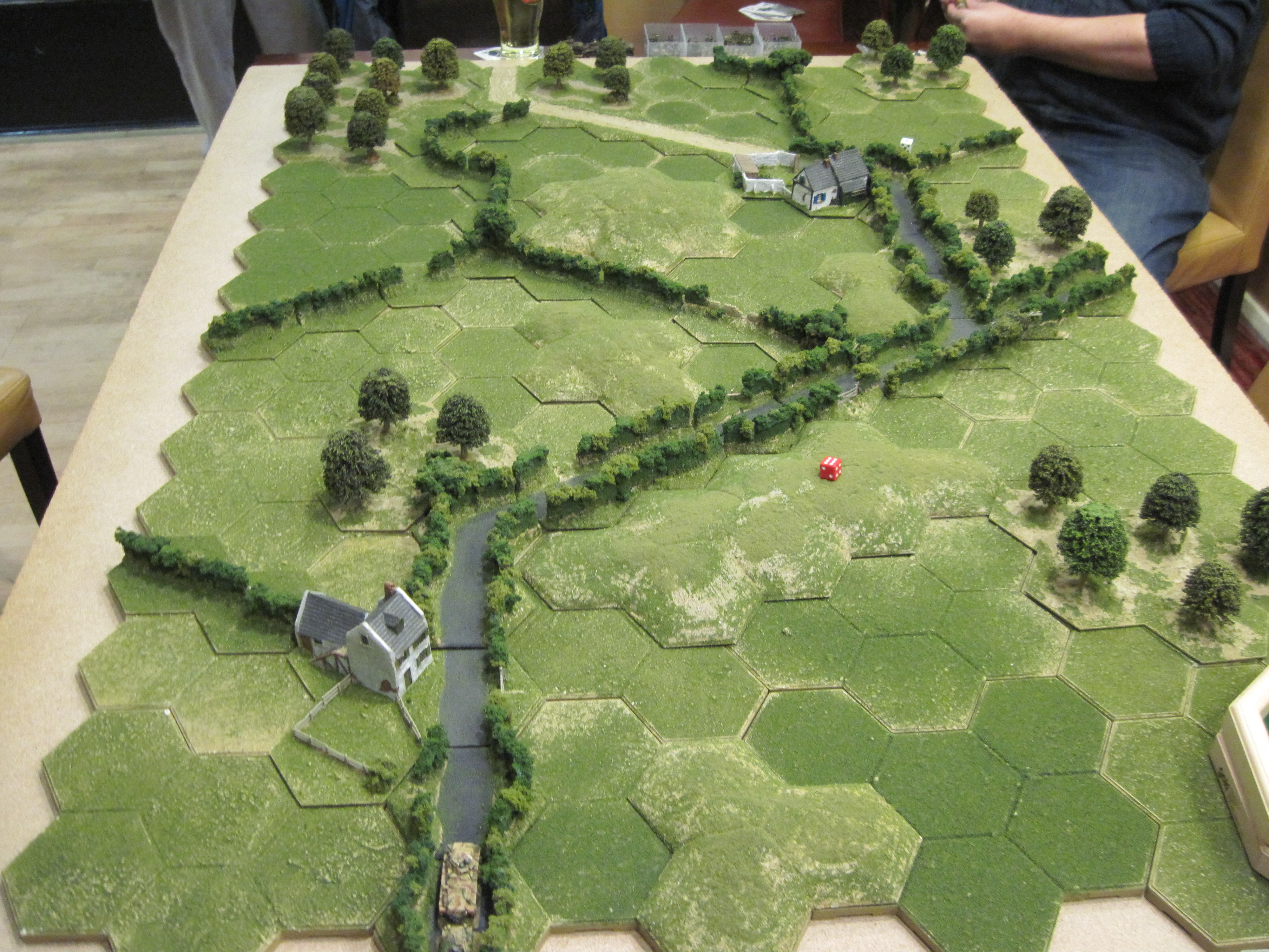 In this scenario we were using the battlegroup rule system, adapted to hexes, to fight a contact engagement between British and German reconnaissance units. The terrain layout was provided by Dave Mack and is typical of the terrain encountered inland from the Normandy beaches.