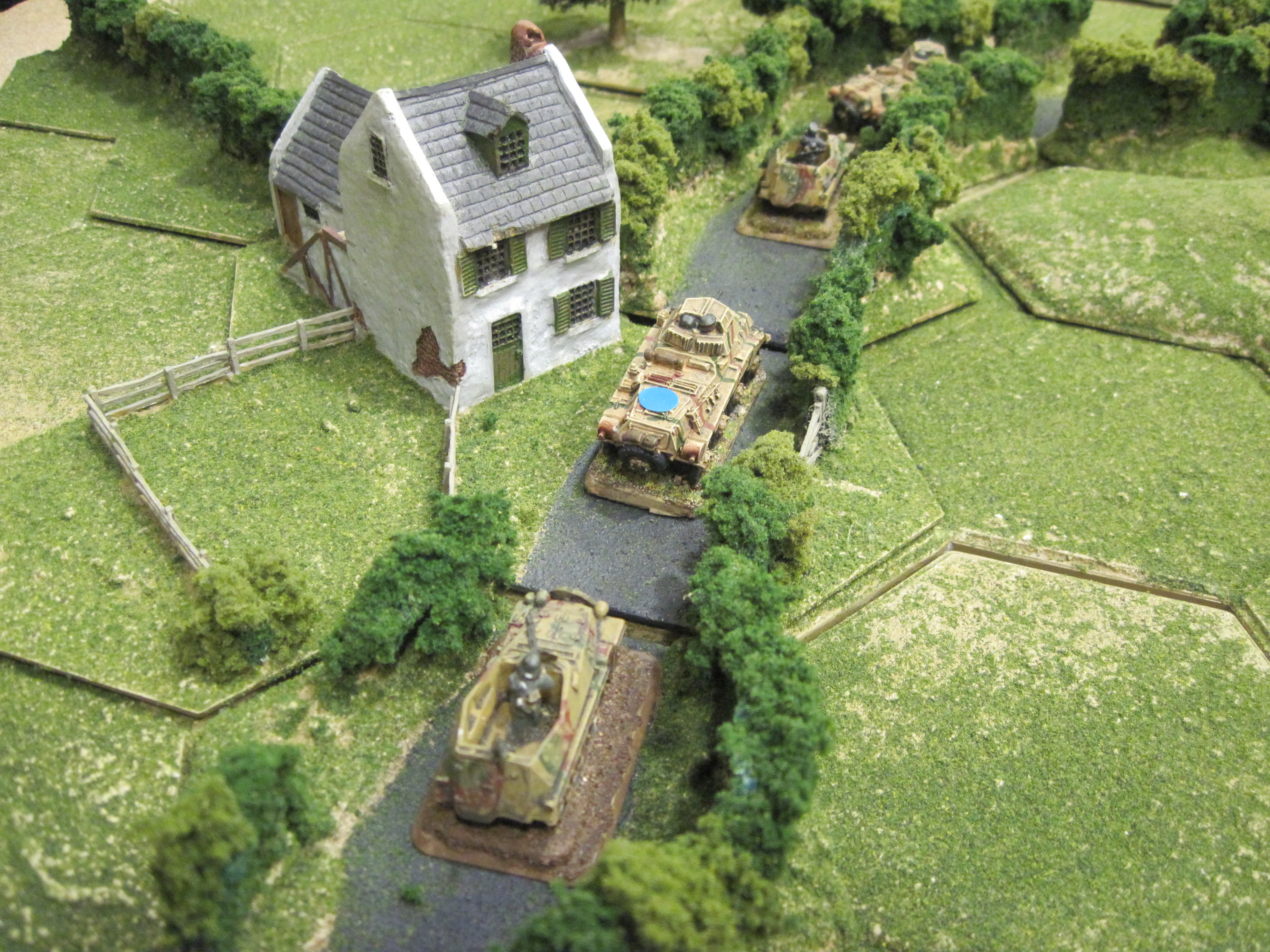 My German recon unit consisting of 4 SDKFZs, two armed with 20mm cannon and 2 carrying infantry rifle sections advanced along the road towards a small hamlet. The British units were signified by markers. Because they were in ‘ambush’ only when firing or being spotted could they then be identified. This prompted a cautious approach! The yet to be identified British units were on ‘ambush’ orders.