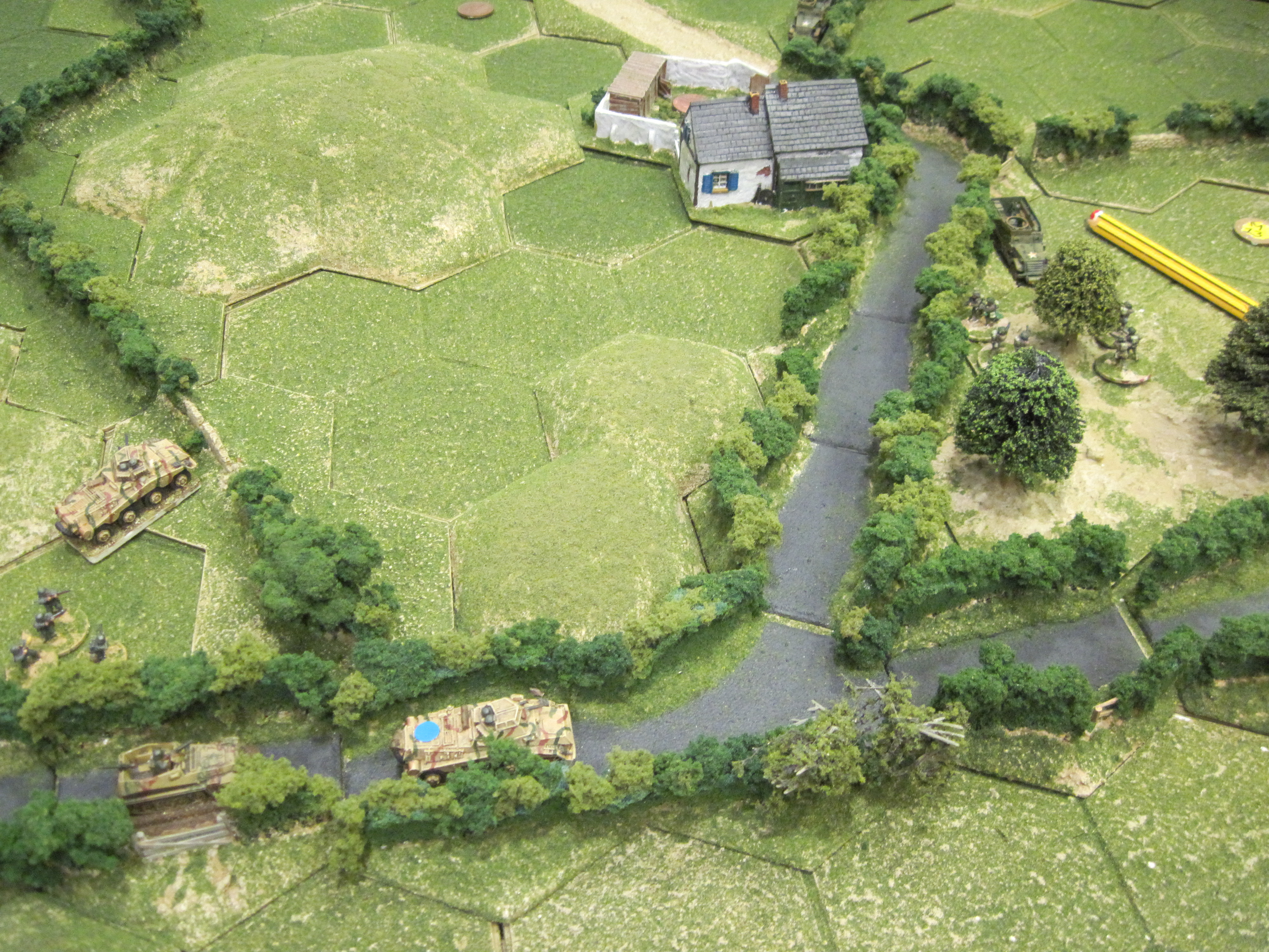 The rifle and support sections all disembarked from their vehicles and took up position along the hedge lines either side of the road. The road offered the only vehicular root for the SDKFZs to cross the table towards the British positions. For this reason, I attempted to move the infantry into hexes either side of the road to effect a ‘combined arms’ assault along the road towards the farmhouse. Unfortunately, British infantry on the first floor of the farm house successfully spotted and fired upon a German rifle unit eliminating it. On the other side of the road a German support infantry unit was also spotted, fired upon and badly cut-up.