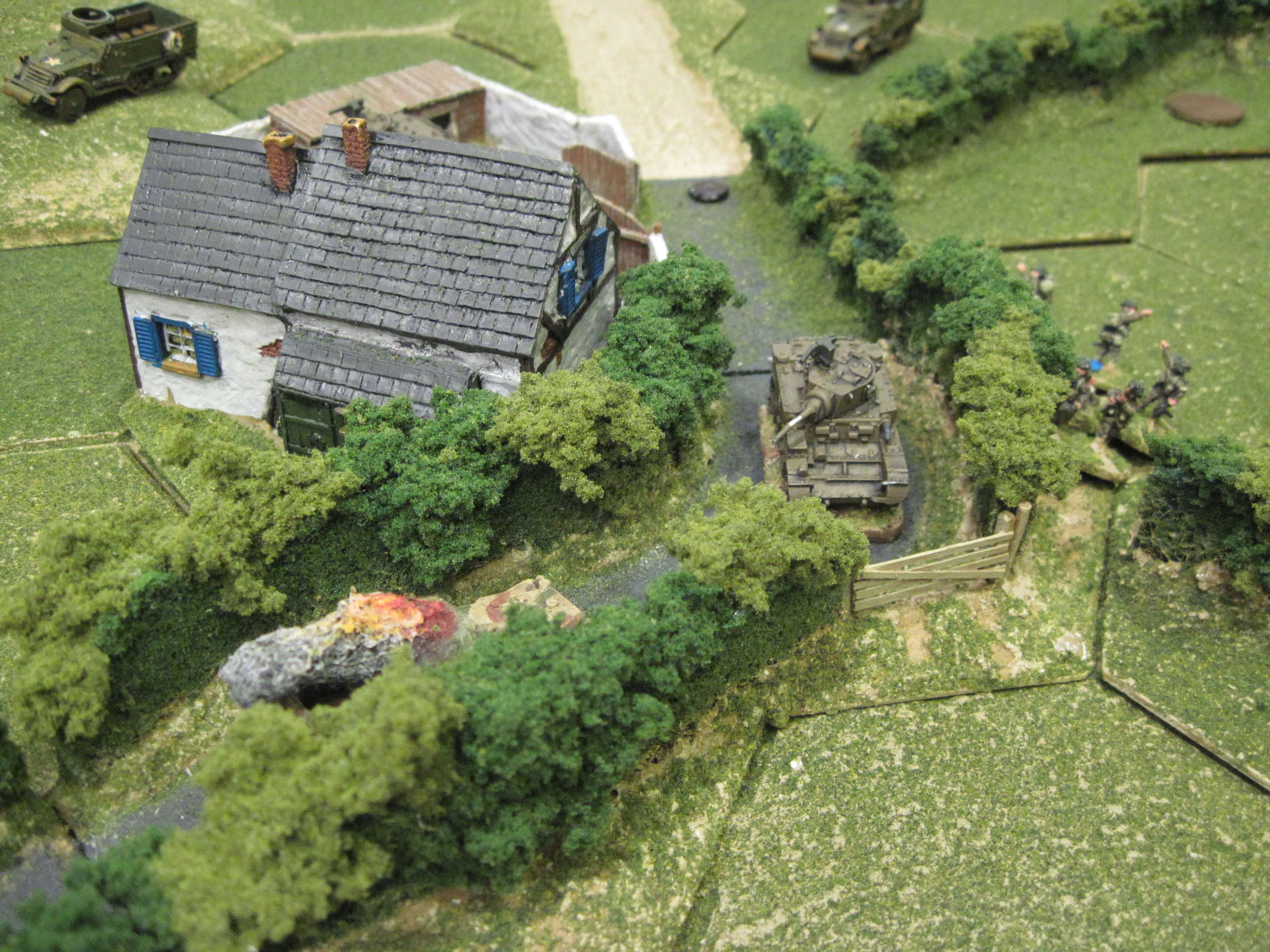 The German attack was effectively over, but one of my poorly sighted German infantrymen must have found a discarded pair of specs because miraculously he spotted a British M3 halftrack behind a hedge. The same guy, I presume, used a panzerfaust to blow-up the aforementioned vehicle, thus recording the only British casualty of the game.