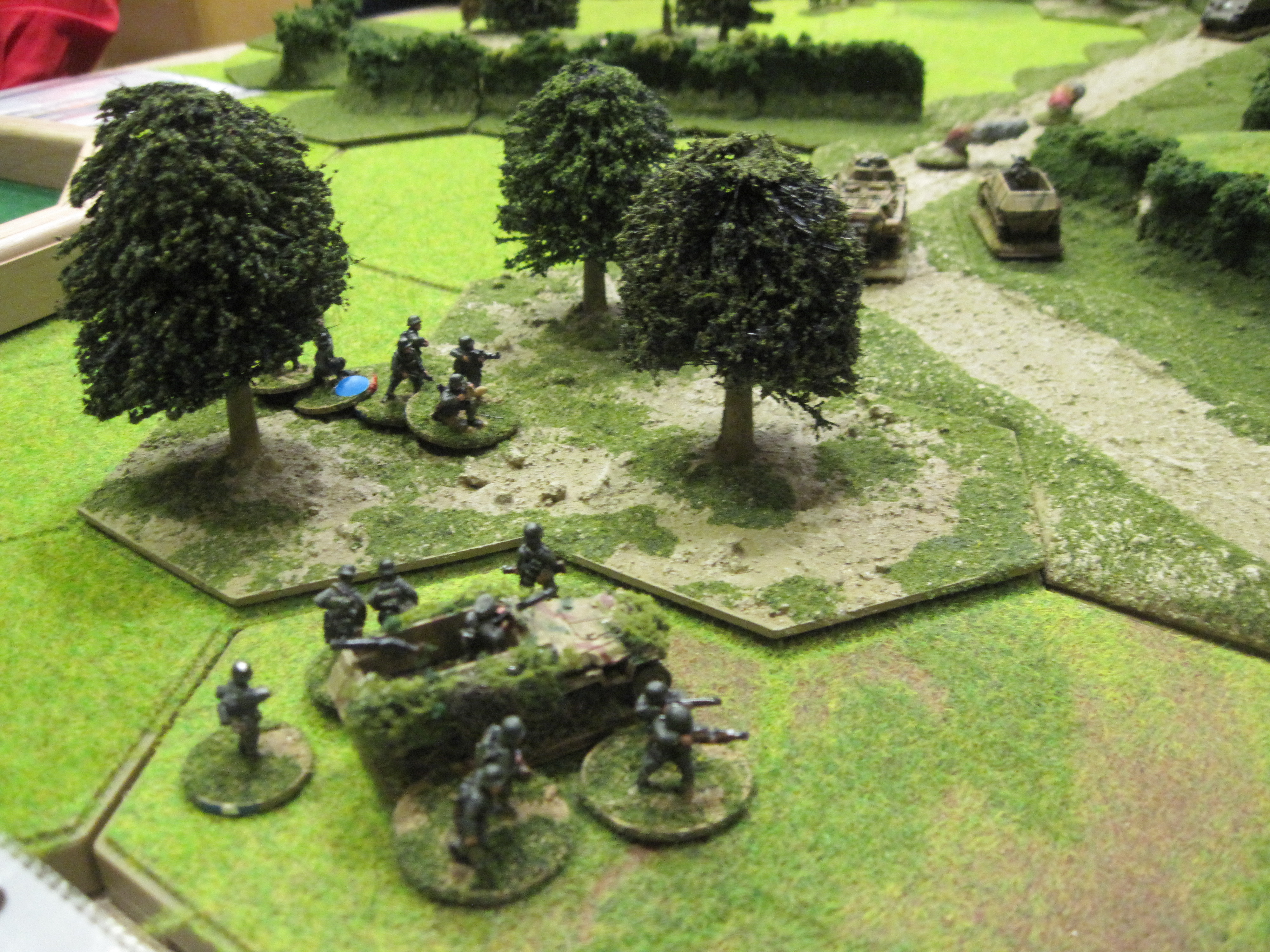 We suspected that the Germans would have an anti-tank gun in position somewhere and we made a calculated guess which of the markers this gun would likely be. When I sent the two 75mm armed Shermans across the open ground towards the German held hedgerow, a PAK 40 opened up taking out one of the closest Sherman. The gun position now identified, Tim’s infantry dismounted from their halftracks to take up firing positions in the bocage lane. In response, German infantry opened fire on them but with little effect, and we now had valuable information on the German positions and unit composition.