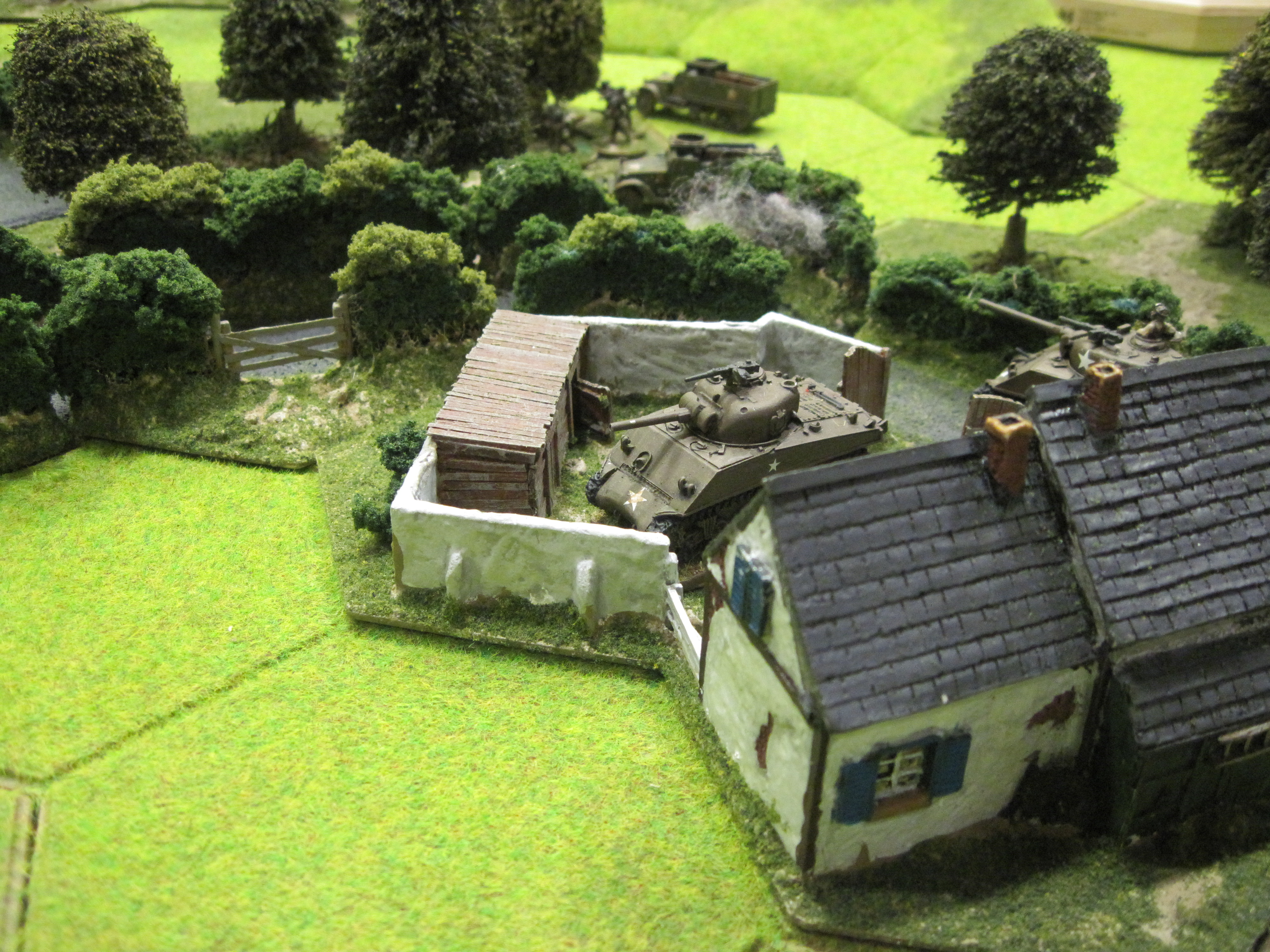 After a quick consultation in which we carefully studied the various attack options, Tim took command of the infantry and sent them towards the right-hand side of the table to occupy a bocage lane. At the same time, I sent the three Shermans to the left, the Firefly taking up a firing position in the walled farmyard.