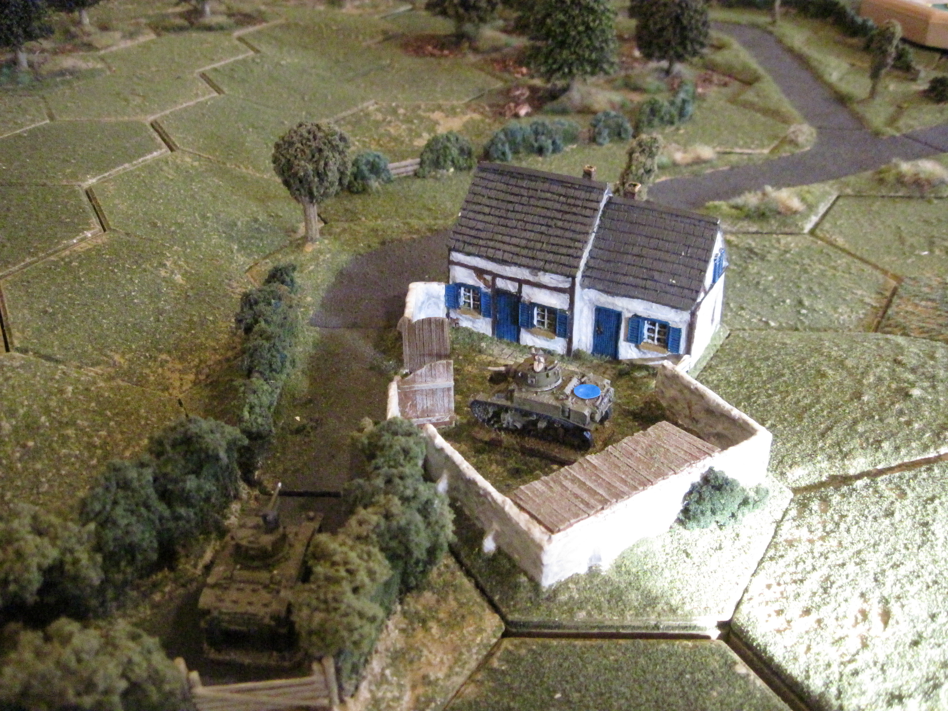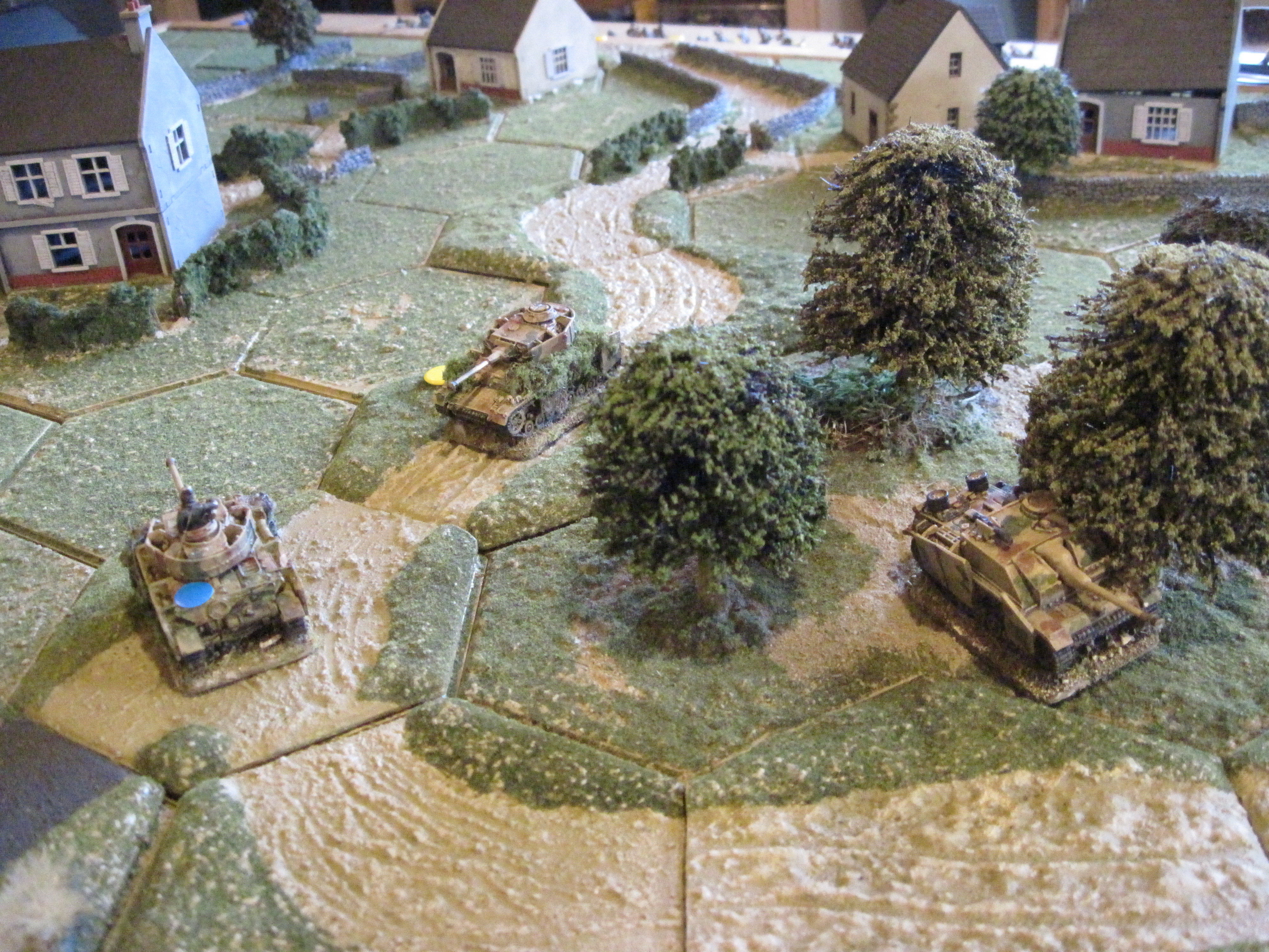 All German units were on ‘ambush orders’ and so as Chris and I pushed our Stuart tanks and M3 halftracks forward we expected to be fired upon by concealed German assets. I pushed quickly into the small village without contacting any resistance and positioned one of the Stuart tanks to block the road between the bocage hedge. Soon a Stug IV appeared and after a ‘lucky’ close range hit the Stuart popped it and in doing so cut one of the six escape routes.