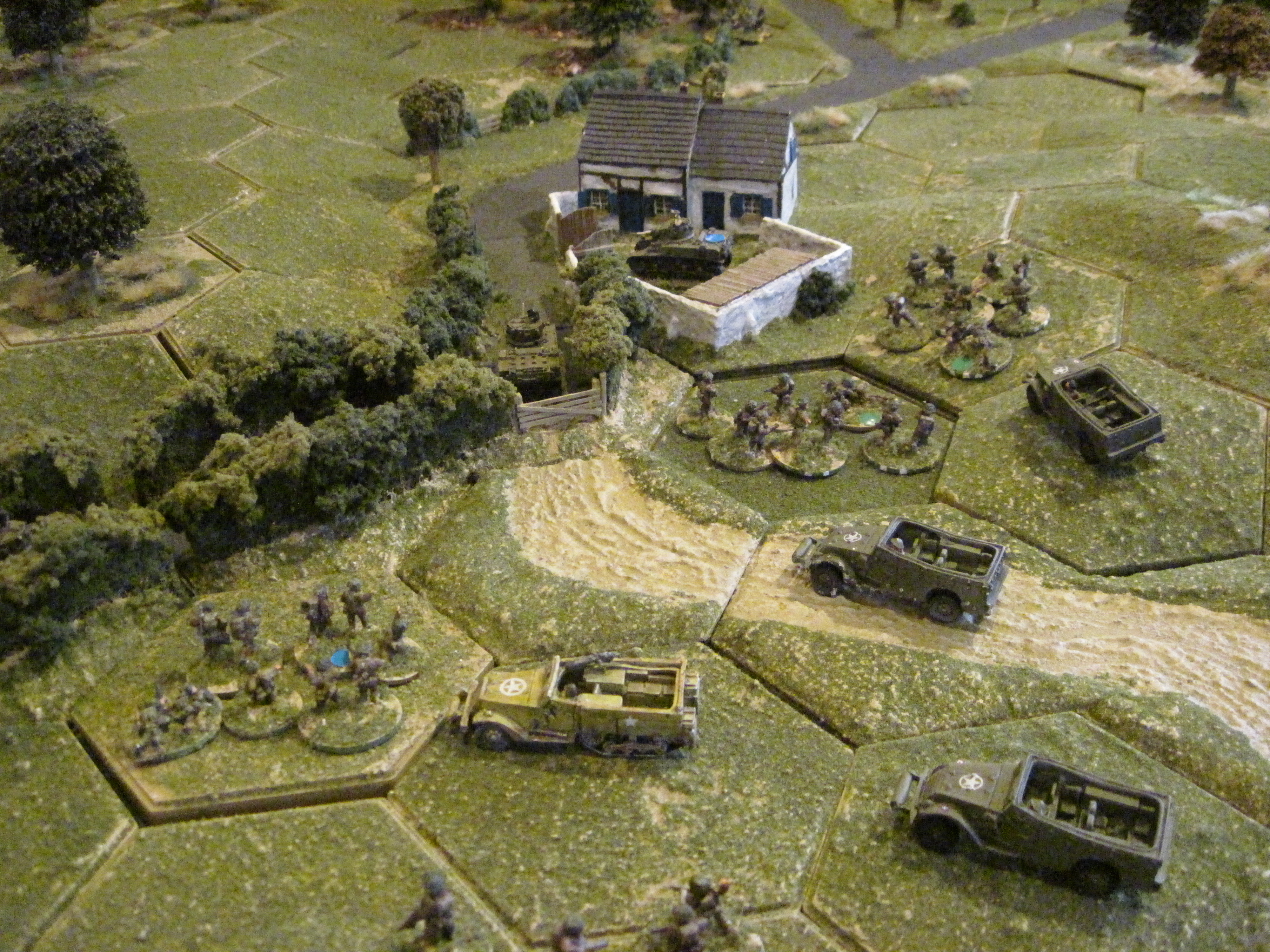 Unfortunately, my German infantry defending the small village, were been pounded by 25pdrs, 4 Stuarts, M3’s and their unloaded infantry sections. They weren’t going to survive for too many game turns and once they were gone the village was soon overrun. Two more German tanks appeared, but to far from the escape road, and their progress was soon hindered by British infantry units passing through the small village and into the woodland hexes either side of their only escape route.