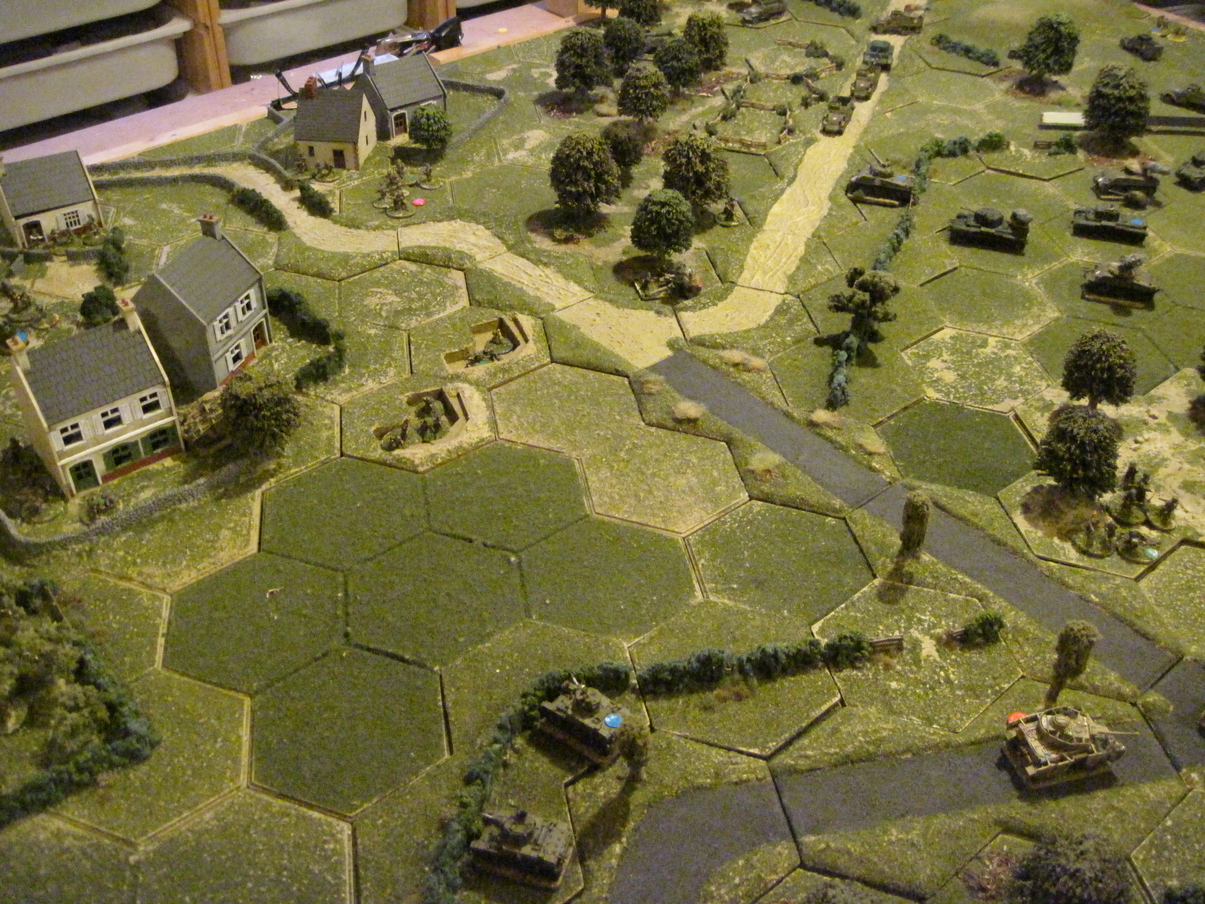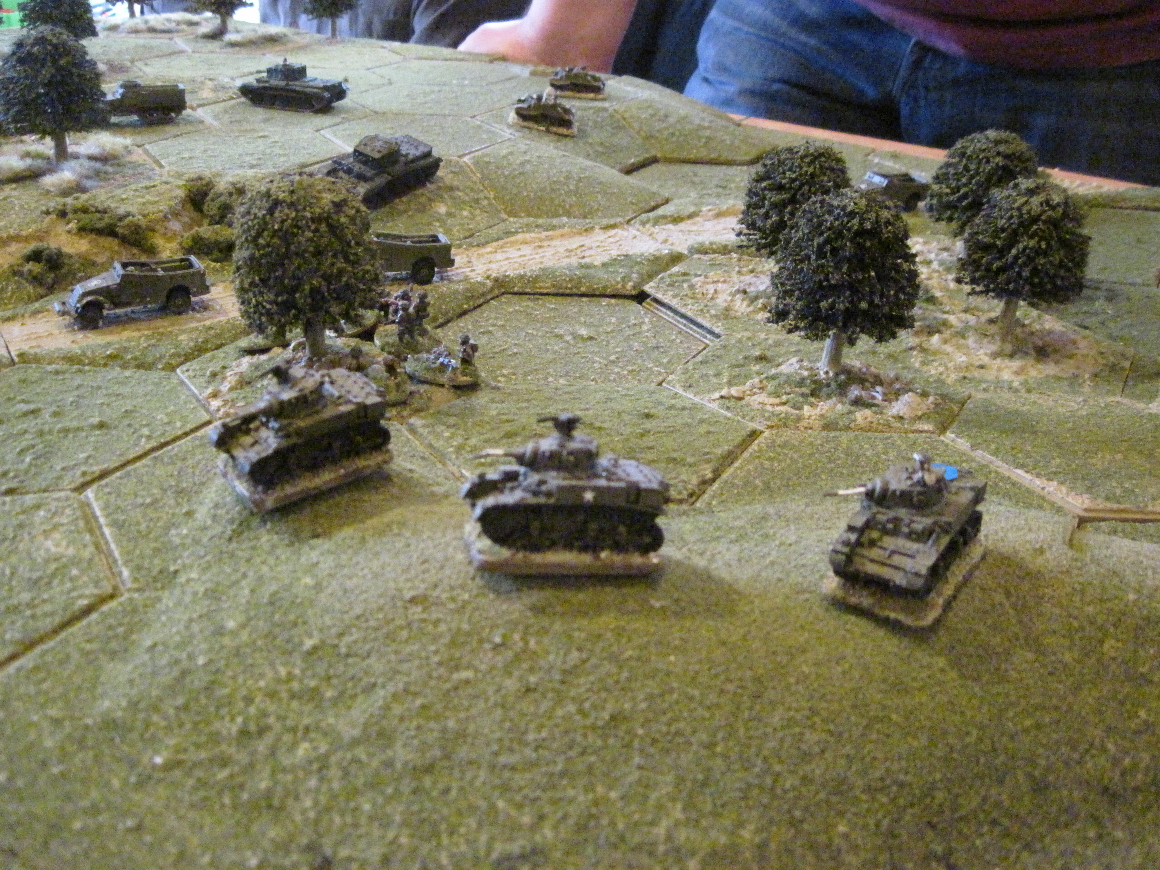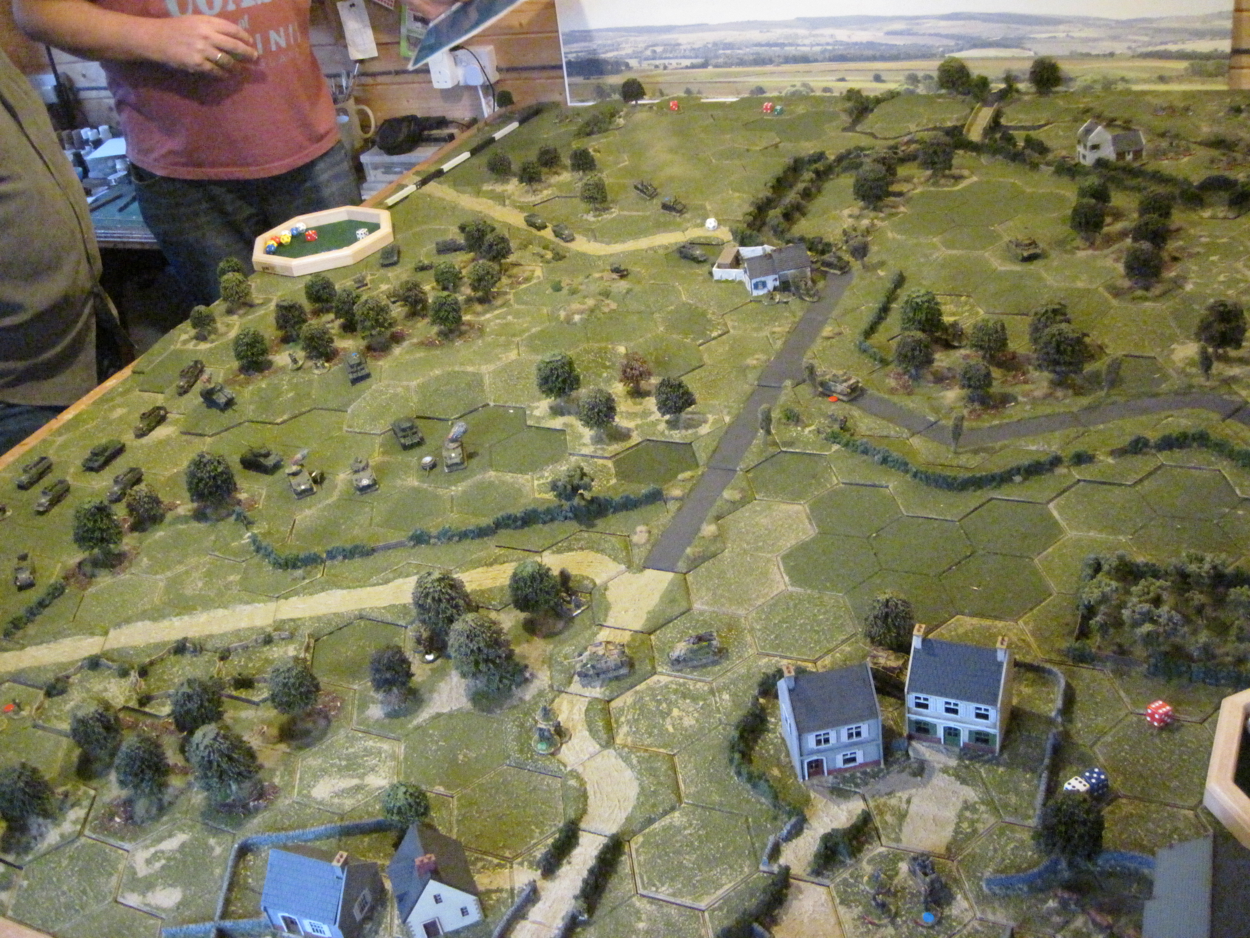Tony, Dave and Steve were in charge of the Brits as they quickly arrived and advanced towards both villages. The advanced British tanks, instead of advancing into the village, occupied a long, low hill from where they could shoot at the German defenders. The third unit of German infantry took up position in a forest hex adjacent the road which did provide some much needed cover.