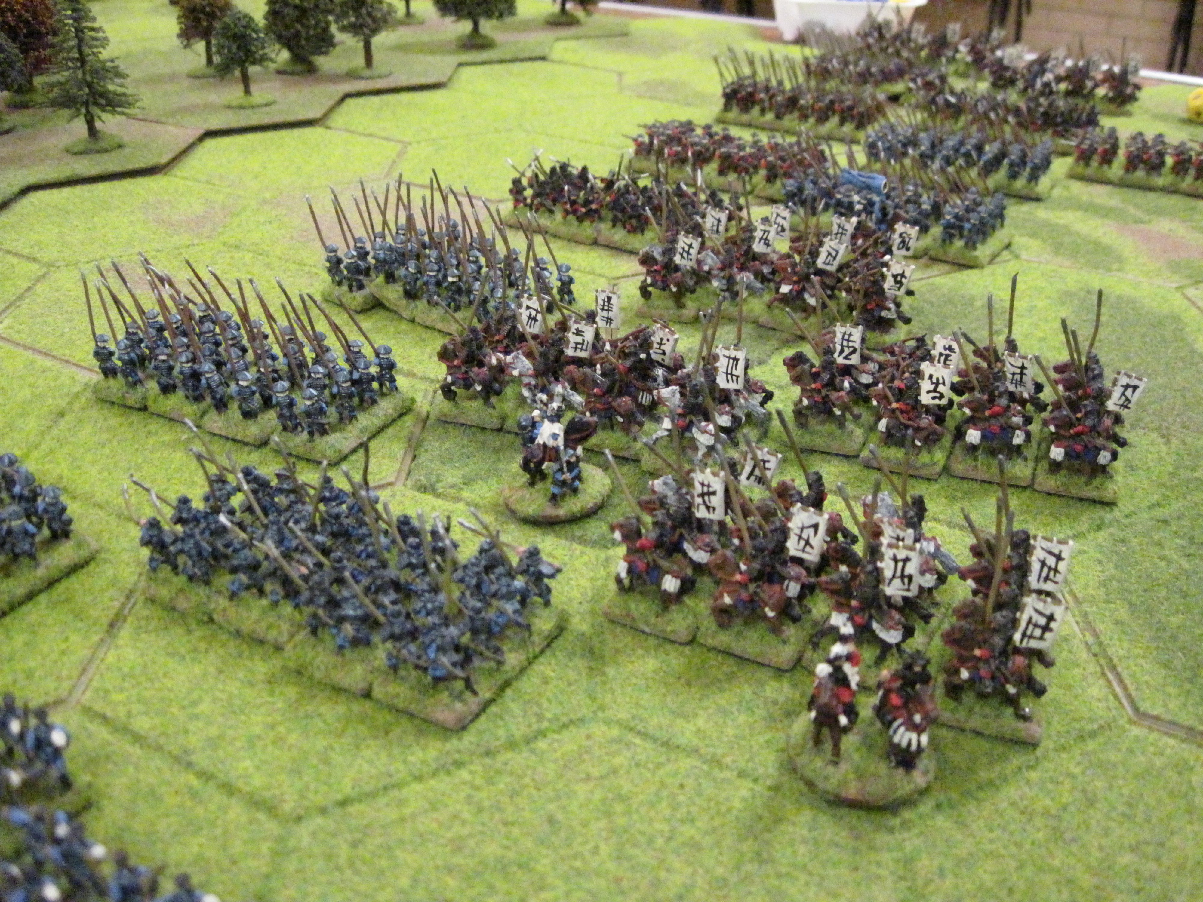 The Koreans (Callum, Steve and Dave), won the Di roll for first move, but with a wall of trees stretching across half the battlefield between the 2 armies there wasn’t going to be any early contact. The Samurai ( Tony, Chris and I), had time to organise our units into a slow advance to best take advantage of the terrain. There were two further tactical moves by both sides before the shooters of both sides started to ‘tickle’ each other. The protection offered by the forests kept the Korean light cavalry from shooting away their weaker ashigaru opponents. Instead they formed a shooting line ready to blitz any Samurai units that dared to advance out of the forest hexes.