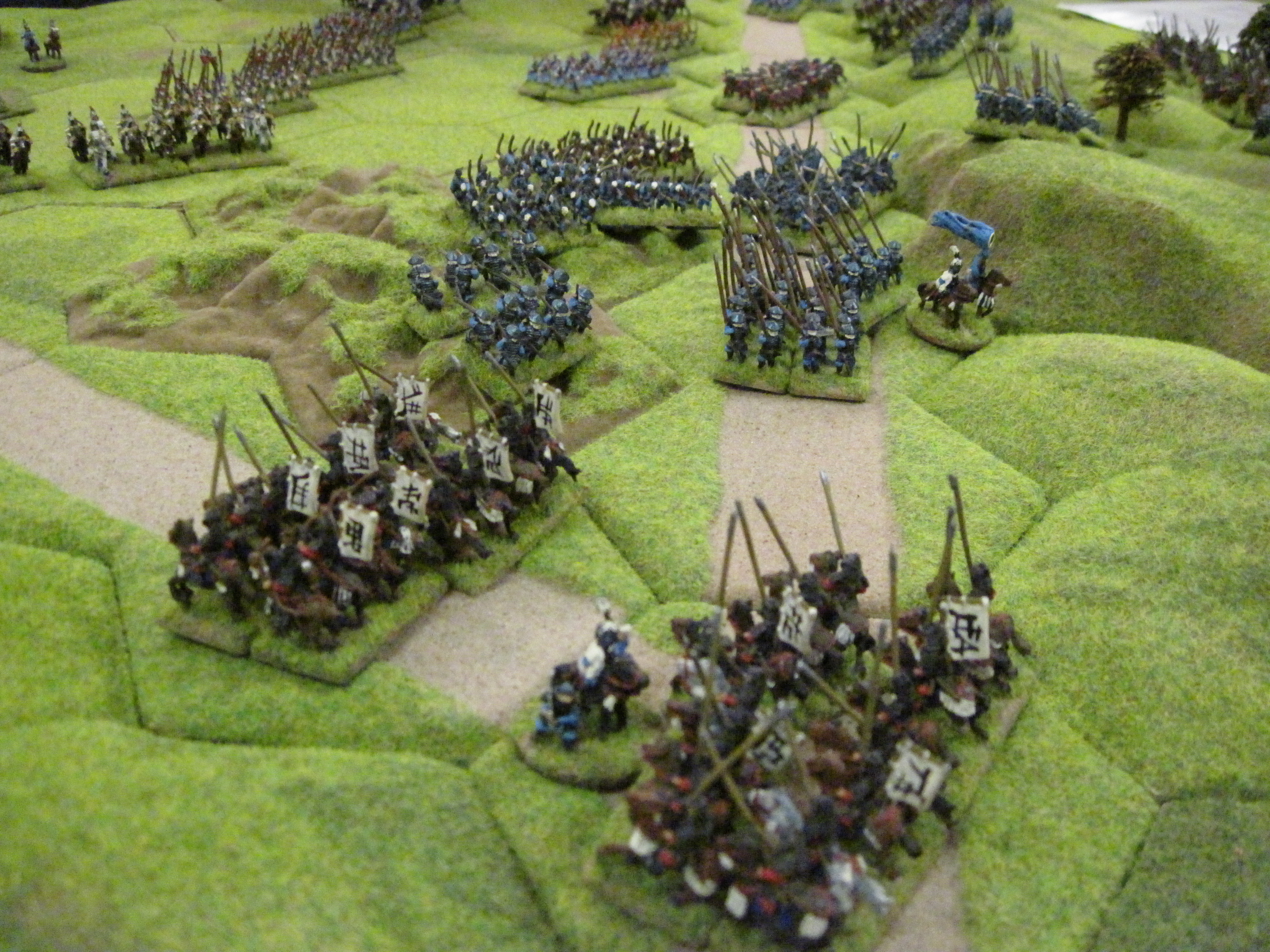 On the other wing, Steve moved the massed units of Korean Heavy cavalry along the line of the road towards my waiting foot Samurai and ashigaru. This would not be a fair contest so I pulled back into the protection of a small area of woodland adjacent to the road.