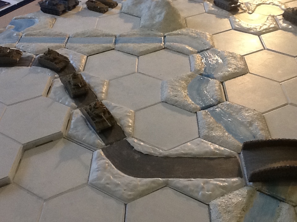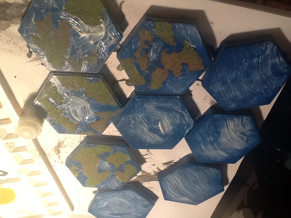 Experimenting with paint and water texture again. I have painted some of my blue single and blue marsh hexes a slightly brighter shade of blue and then applied a coat of water texture and have tried to shape it into flowing water. Below are some pictures of the result before it has dried.