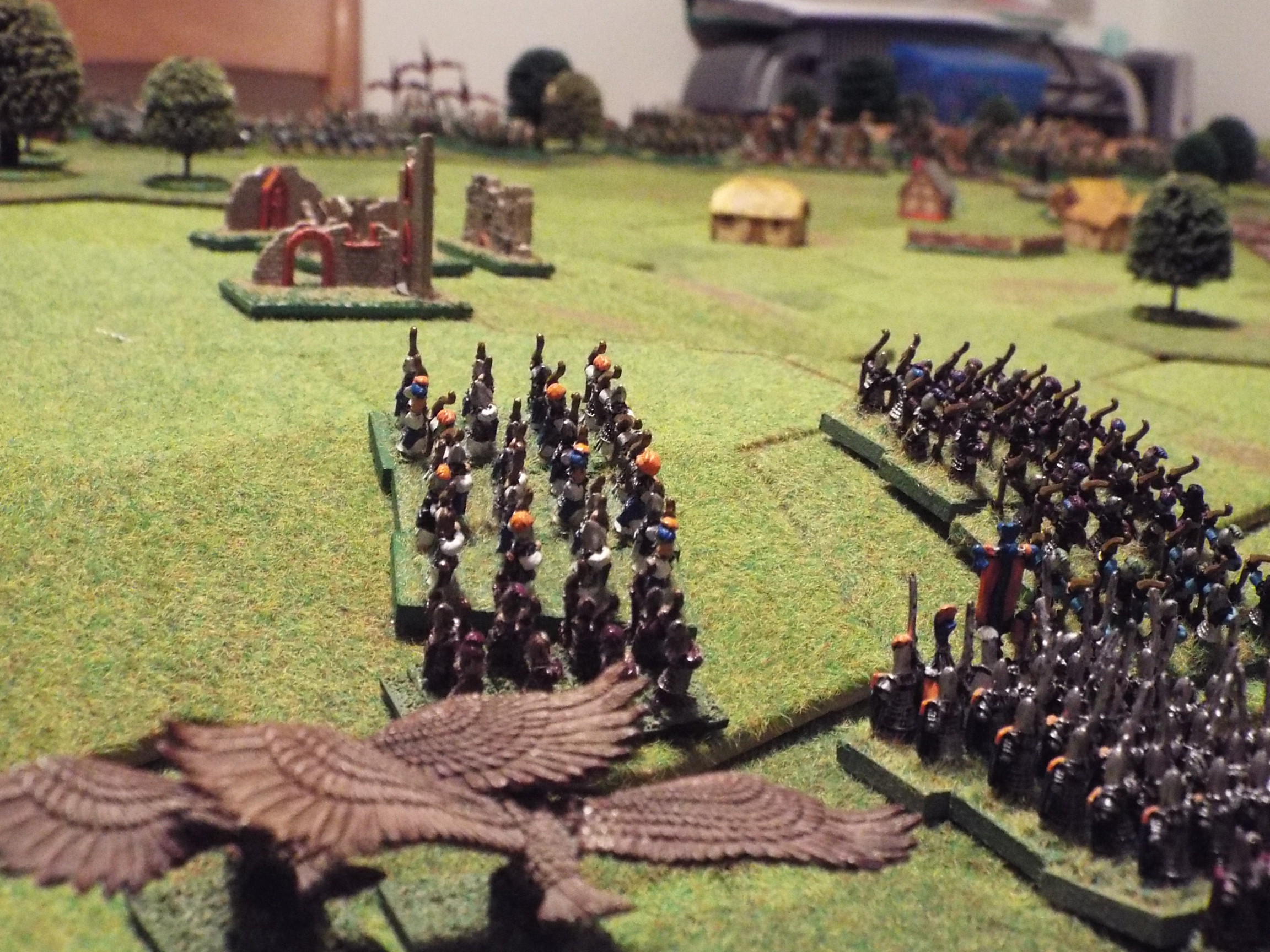 The elves swept forward with cold determination to drive the savage hordes back from Caerfen. The cavalry and eagles moved up on the right flank- the missile cavalry forming a screen to the front. On the left, the infantry marched swiftly in columns to take the old ruins on the ridge above the village.