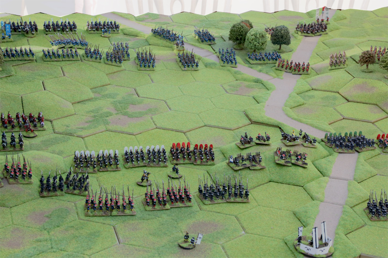 The terrain table was 17 hexes wide by 15 deep or just under 6ft by 4ft, which provided plenty of room for both sides to deploy and manoeuvre. There was a three way road intersection near the centre of the table adjacent to a 4 hex wooded area with roads leading of both table edges (deployment zones). Two areas of elevated ground were situated either side of the central open area, both with forested areas on top. A few small woods and hills were also widely spaced which provided for plenty of open ground.