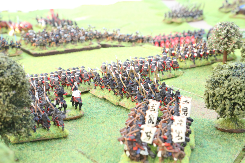 The plan should have worked but my red missile troops were not shooting straight and two six stand units of fast moving Ikko Ikki fanatics smashed into them causing havoc and taking all the momentum out of my attack. I then spent three game turns trying to deal with these nutters, which gave Dane the time to reinforce his right wing and force my tattered red attack back into the woods. I lost 4 units of red infantry including one samurai and my mounted unit of samurai was forced back into the woods and died the following game turn along with one of my precious generals.
