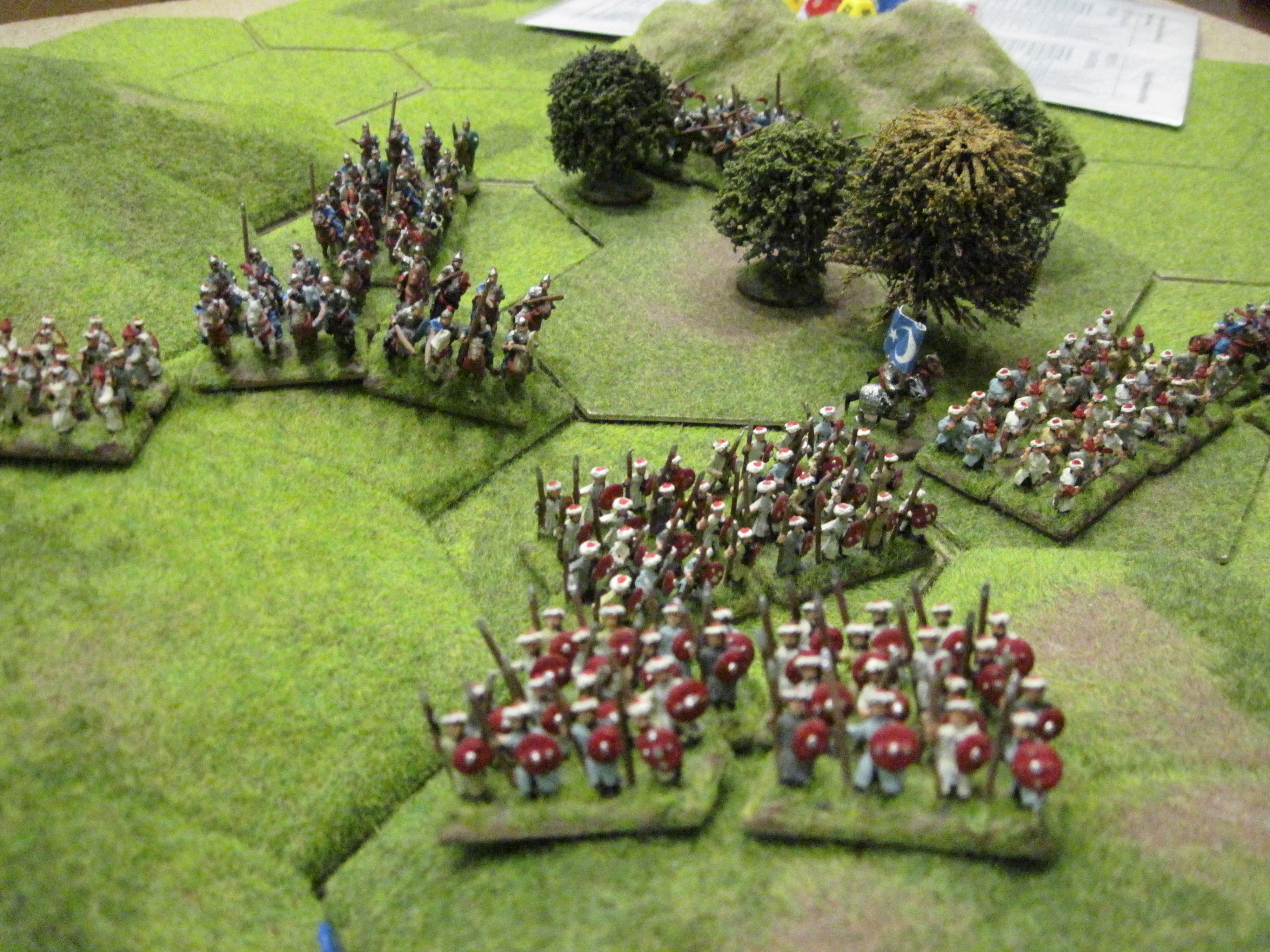Tony and Dave, with the dog-legged forests, hills and escarpments creating a water-shed in their deployment zone deployed most of the Ottoman cavalry against our right and the infantry centre and left against Chris. In response we kept our heavy cavalry centrally behind the forest and 8 hex hill with the hobilars positioned on the extreme wings and the mixed longbow and billmen thinly spread between them.