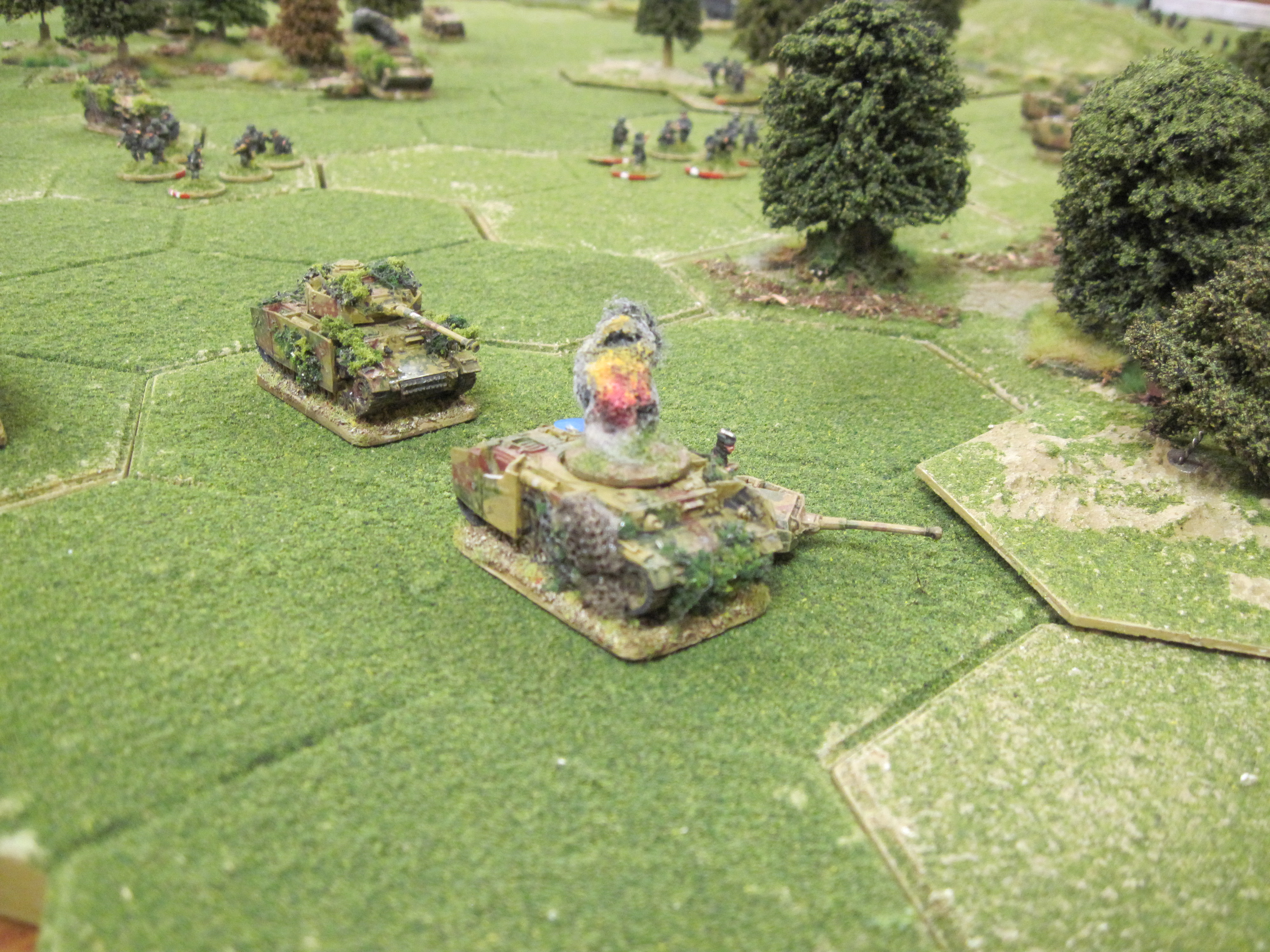 Meanwhile, the infantry of both sides were still just starting to get engaged. A British HMG machine gun section was caught in the open but decided to set-up and use its vickers mg to stop the advance of a German infantry section. The nearby German tanks ignored it and its accompanying infantry as they were too busy popping-off very successfully at the British tanks.