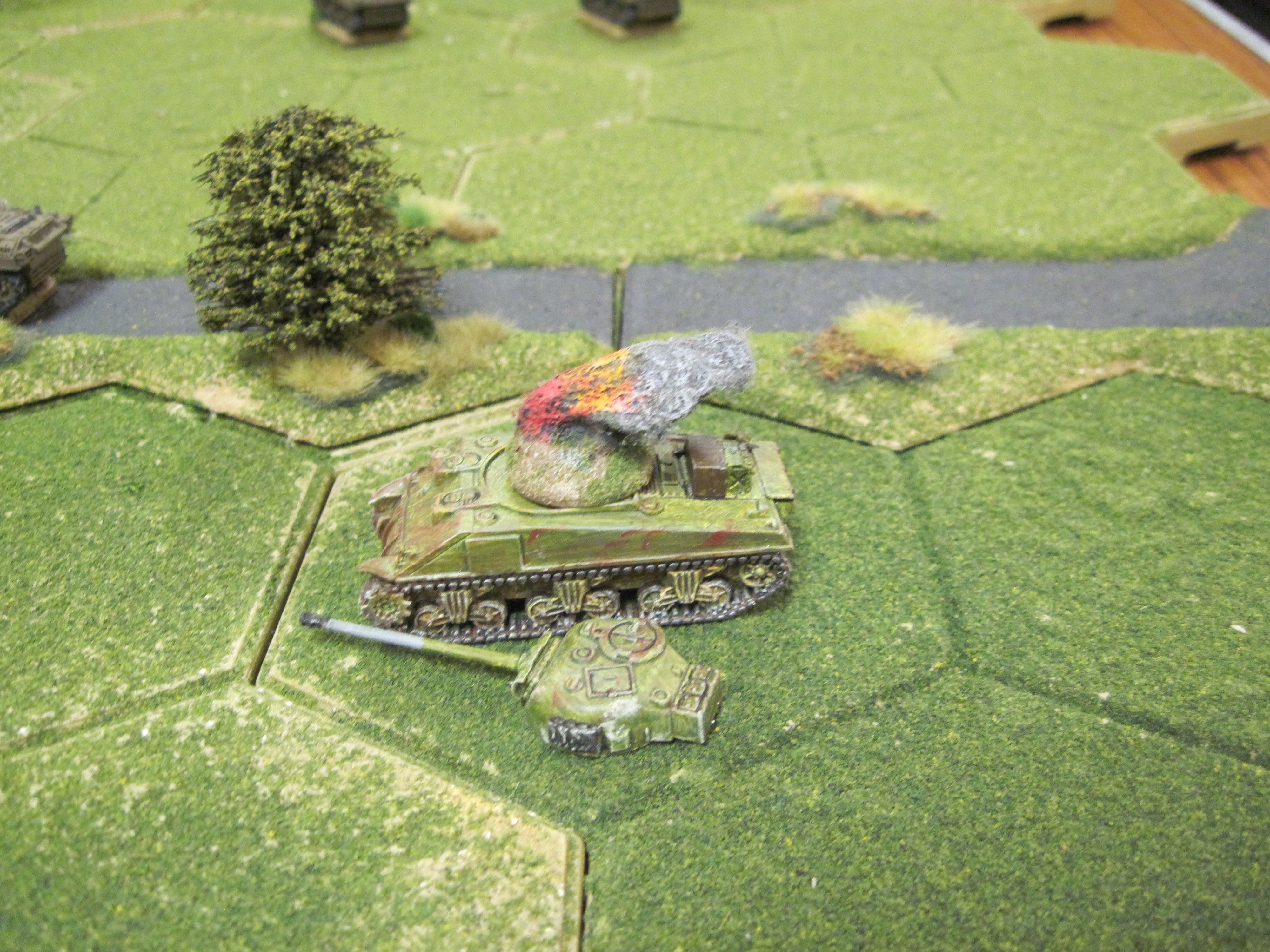 Within a couple of moves the left-hand side of the table had turned into a tank v tank shooting gallery as more British tanks arrived. A Sherman firefly arrived to lend its support and was immediately dispatched. The German tank gunners after initially being on the receiving end, soon found their targets and the table was soon littered with burning Shermans!