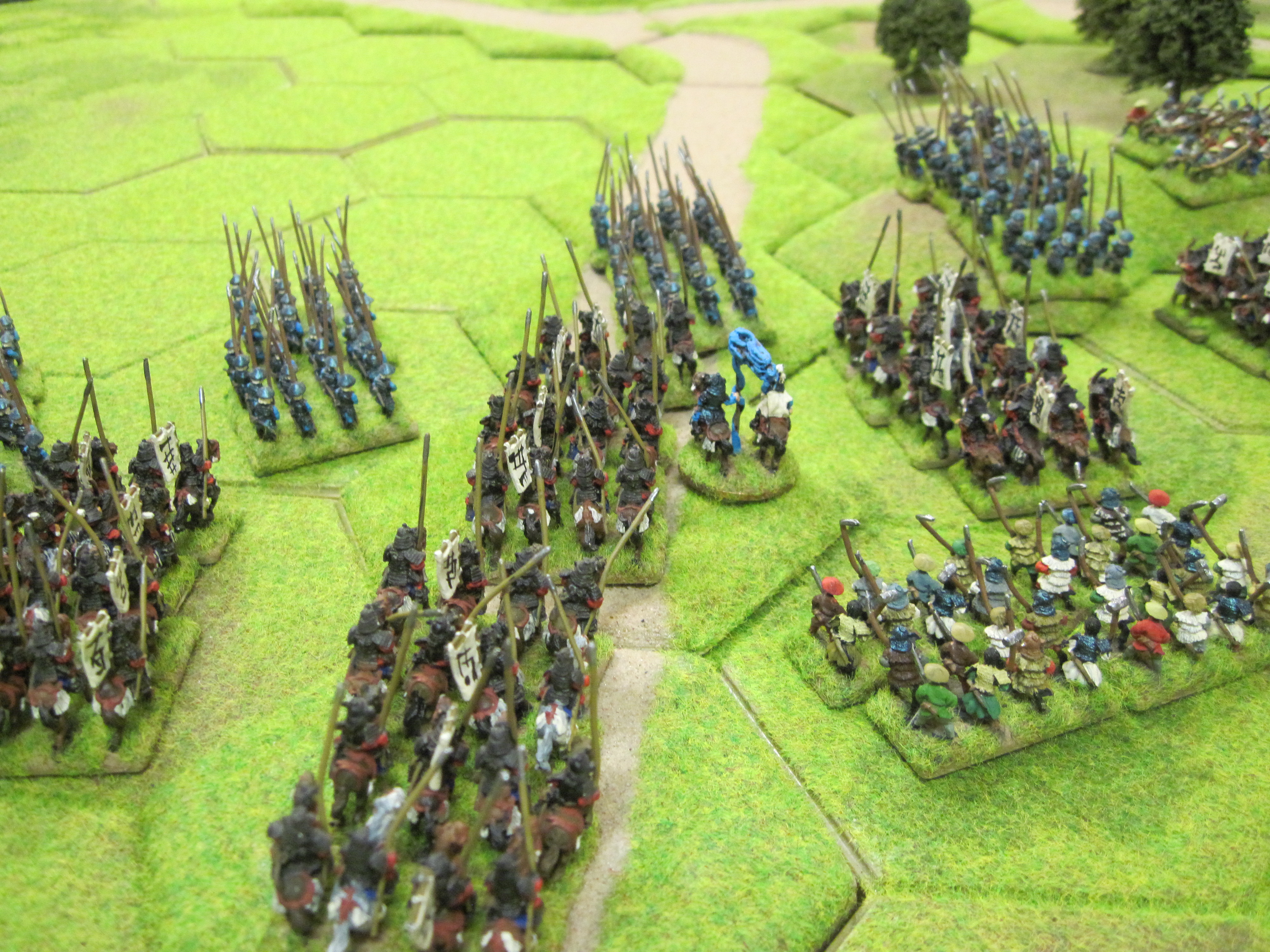 Meanwhile, on the right-wing Chris was having a tough time against Steve’s archers, which stifled each and every attempt to advance against them. No side could gain a decisive advantage here, until the shooting dice favoured one side over the other.