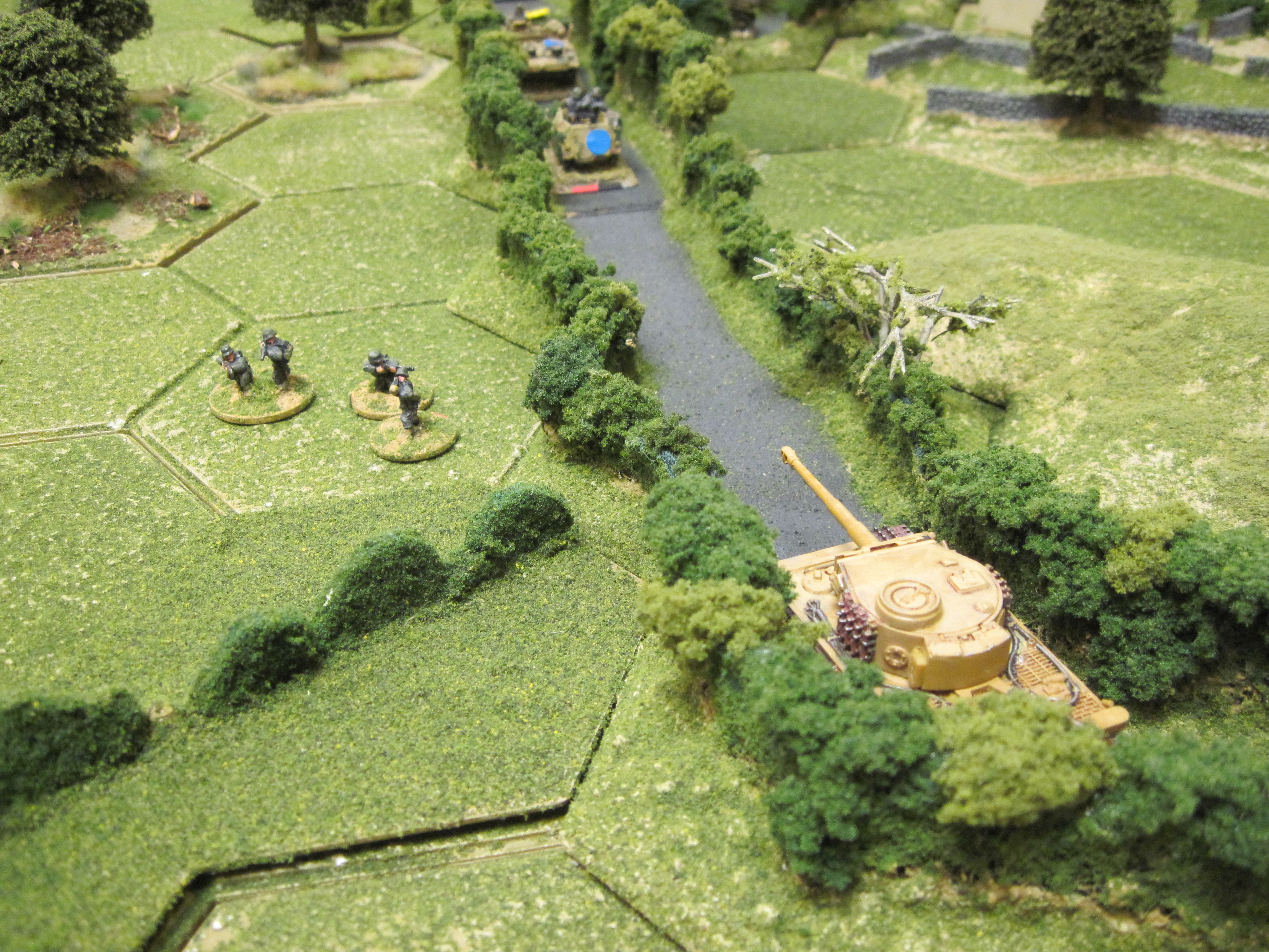 A German infantry section moved up to a building overlooking the crossroads with the aim of destroying the British Stuart, but this was really only a token gesture towards freeing-up the main road and the fastest escape route for the German armour. In reality, despite suffering significant casualties in infantry and vehicles, the British units had succeeded in gaining control of the ground adjacent to the one side of the road. Any German armour attempting to escape along the road would present its side armour to 17pdr and 76mm armoured piercing shells from the now numerous British tanks. The road would soon be blocked with burning tanks!