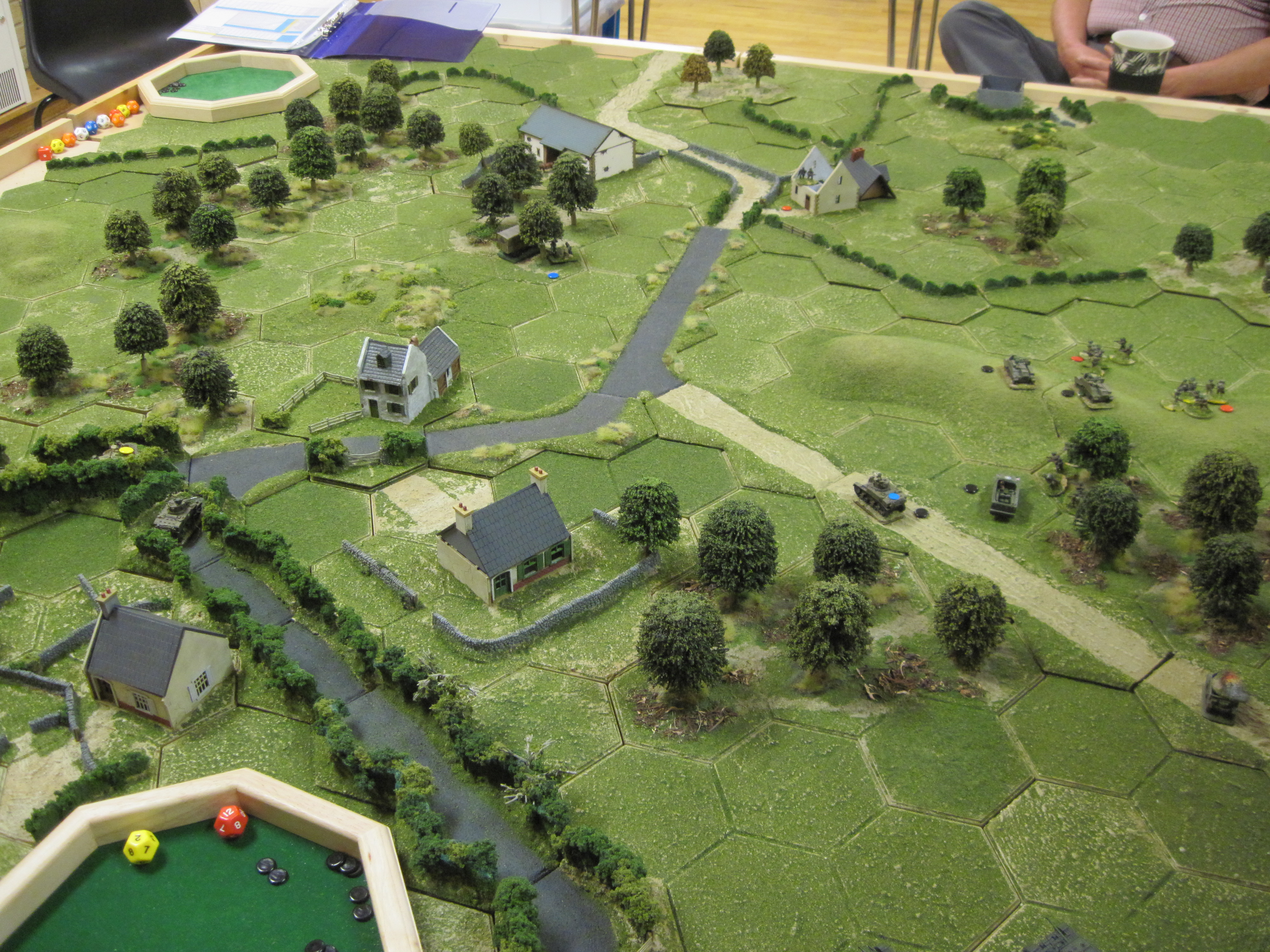 This scenario gave the German players the task of enabling assets to escape from the Falaise pocket by crossing safely across the length of the table, edge to edge. The British players would have the task of stopping or destroying these assets.