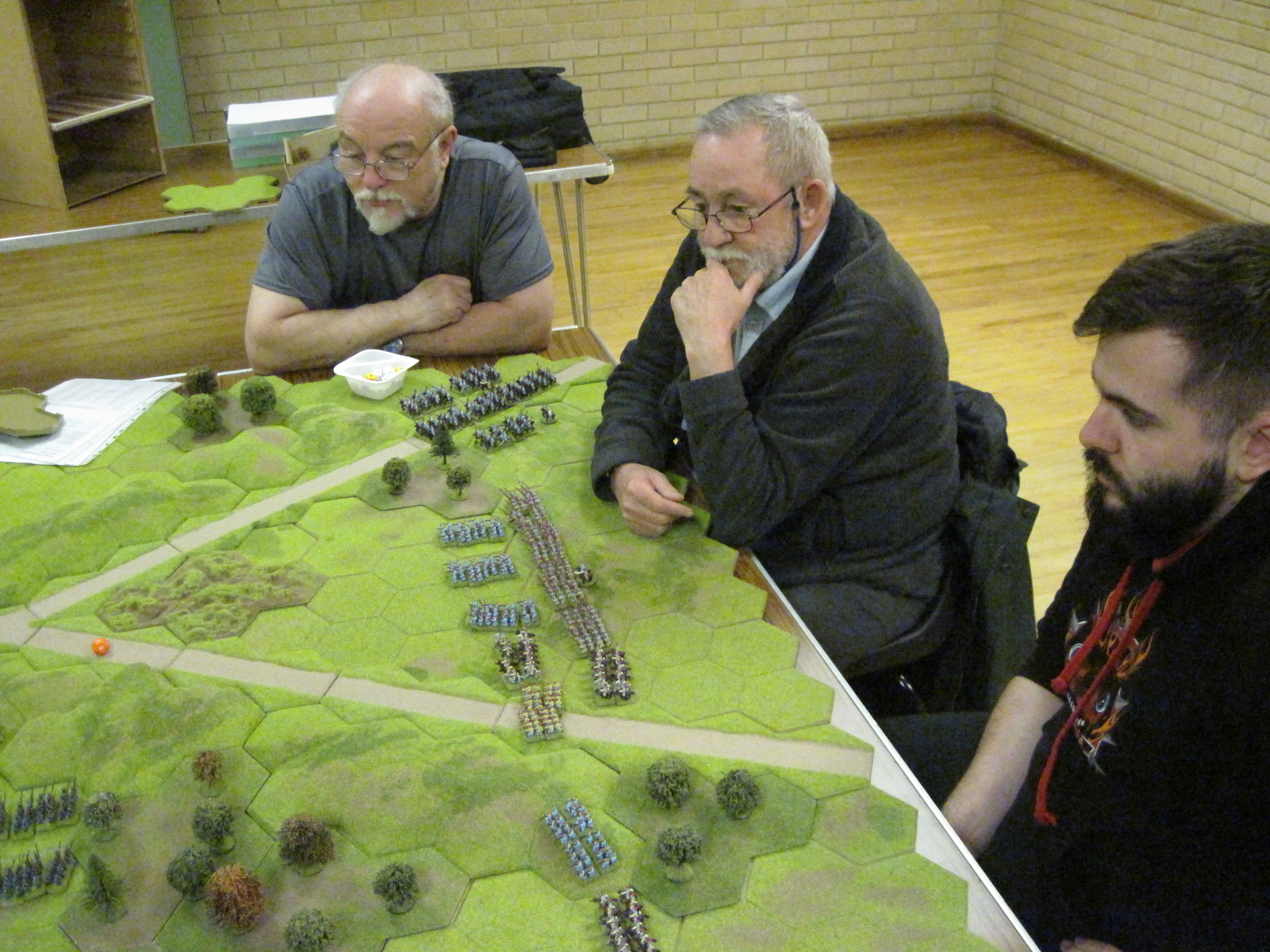 In this 6 player game the three a side teams were decided by di roll – highest three v lowest three using a D12. Choice of table edge, first deployment and first move were decided in the same way.