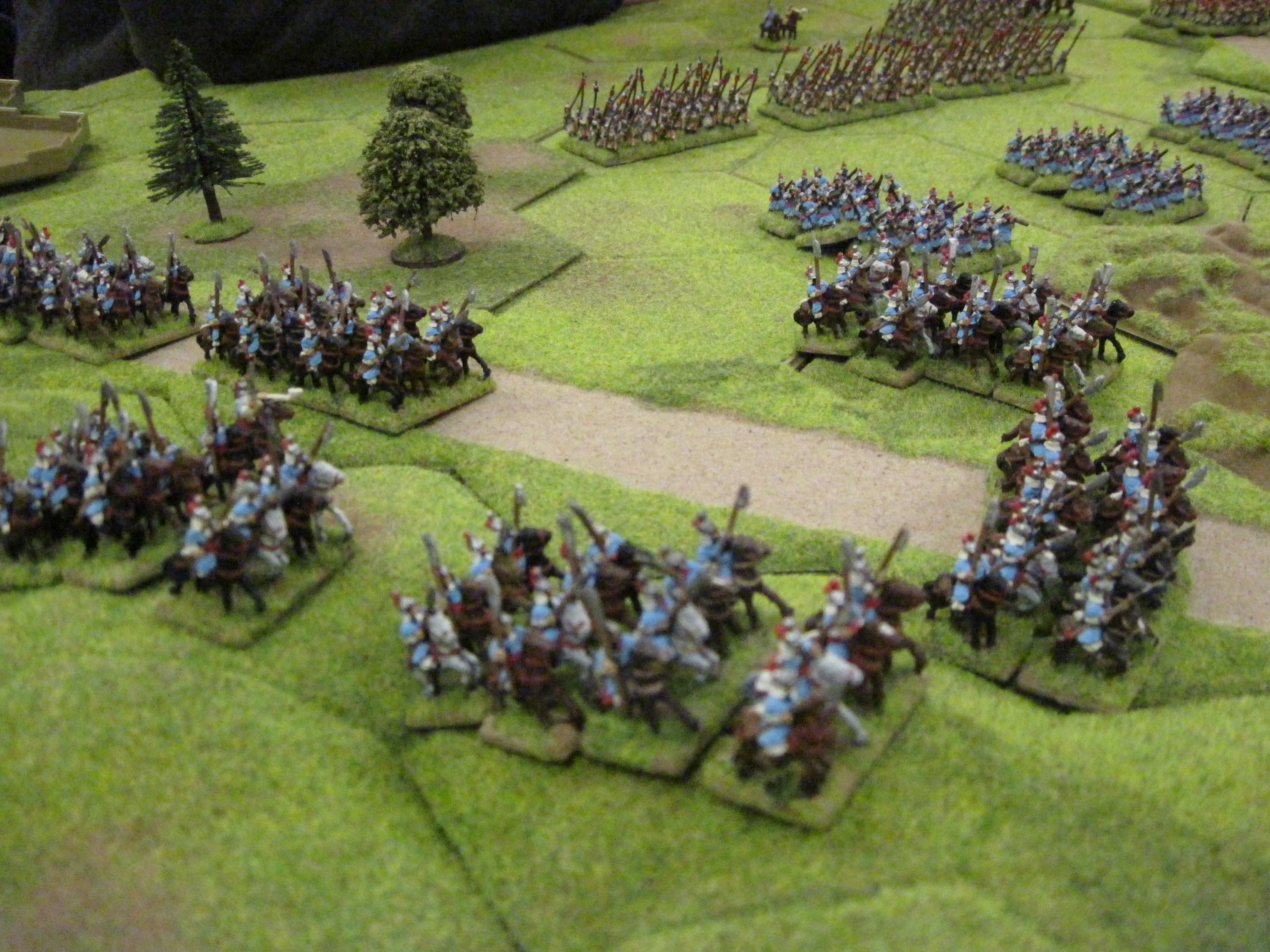 On the other wing, Steve moved the massed units of Korean Heavy cavalry along the line of the road towards my waiting foot Samurai and ashigaru. This would not be a fair contest so I pulled back into the protection of a small area of woodland adjacent to the road.