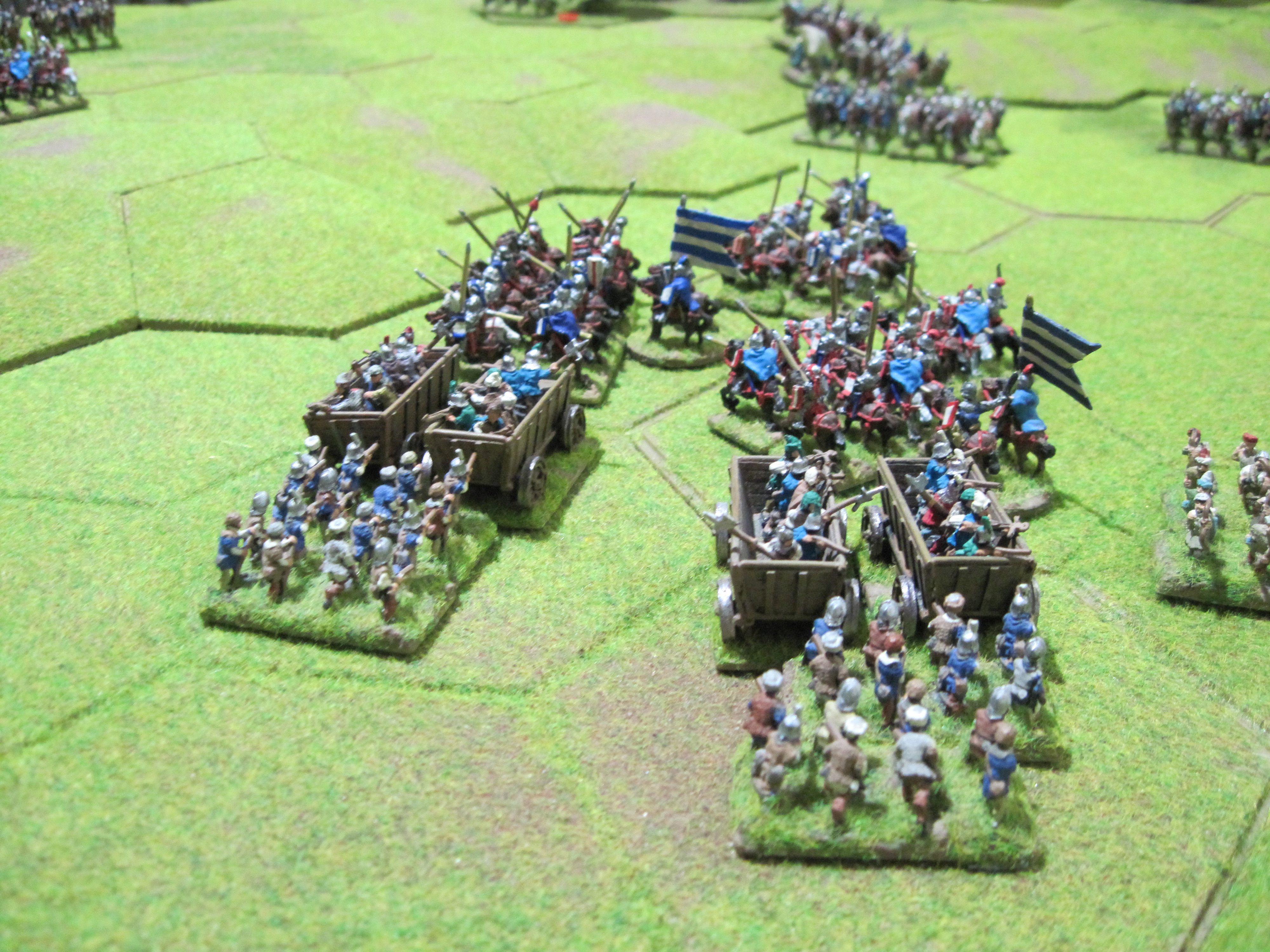The Ottoman army was typical of the period with nine units of Sipahis and Akinci bow-armed light and medium cavalry and large numbers of infantry consisting of azab archers and spearmen. In contrast, the Hungarian army had 9 units of heavy cavalry accompanied by a mixed infantry force of archers, crossbows, two units of warwagons and accompanying handgunners. Because of the relatively high points of the heavy cavalry, to bulk up the numbers, the Hungarians had 6 units of peasants at only 3 points per unit. This balanced the points cost of the 2 armies at 275 points and also brought the number of units in each army to a more even balance.