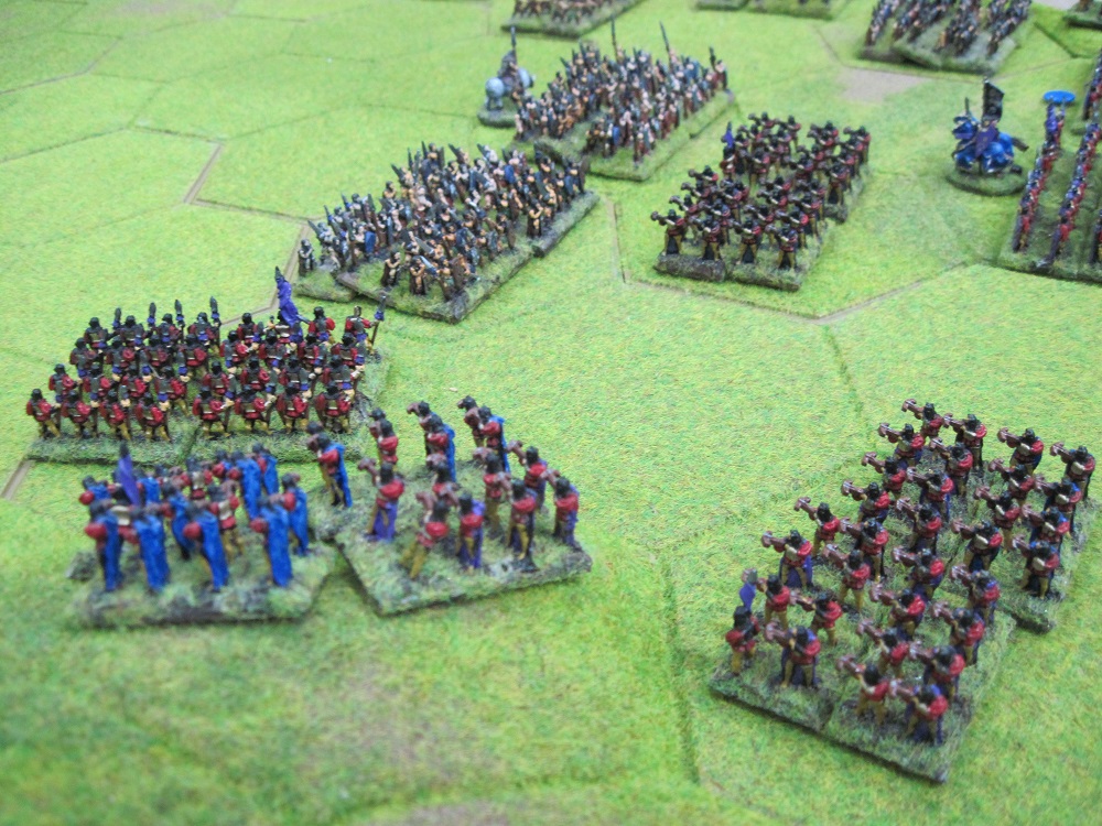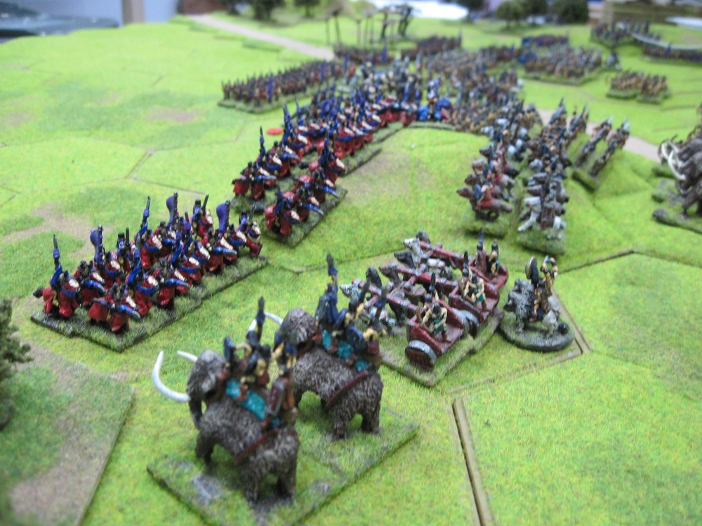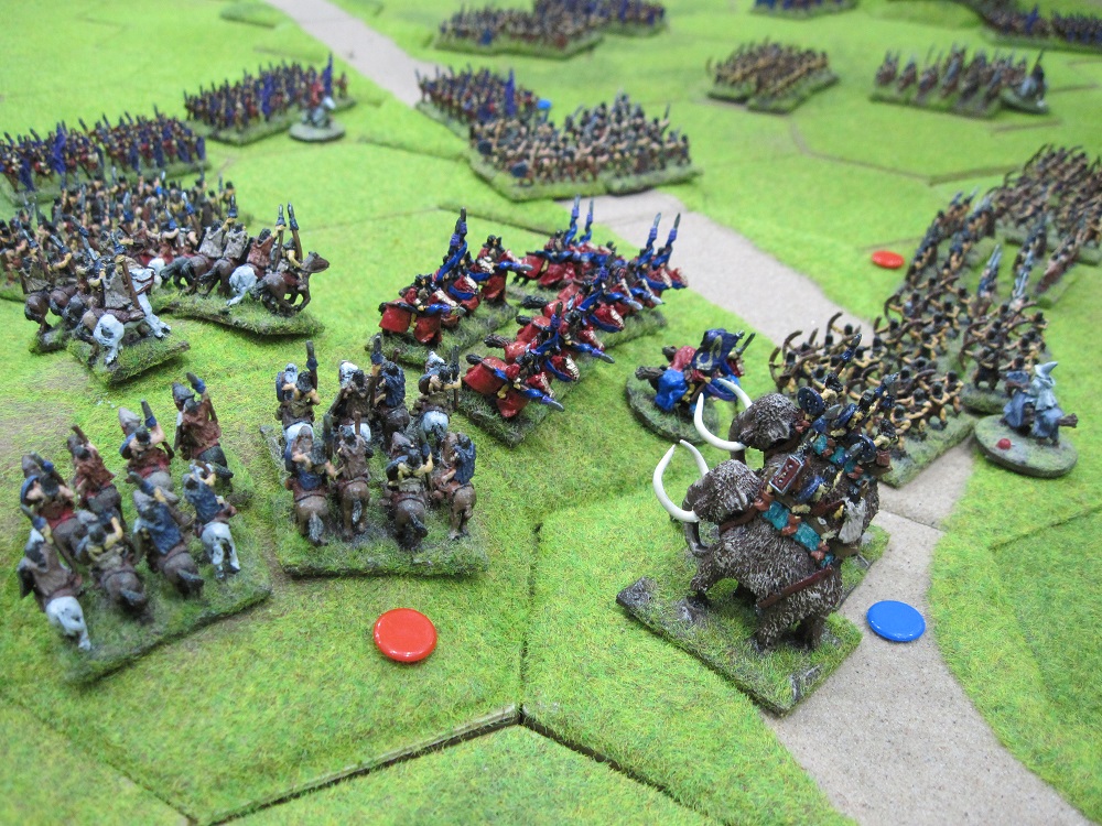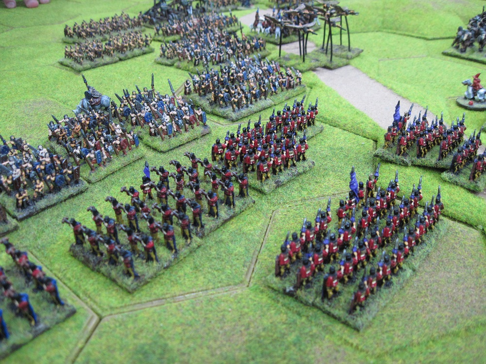 The dice roll for choice of first or second deployment went to Tim and I which gave us the advantage of responding to the Barbarian deployment with our units organised to deliver a specific game plan. However, with one player from each side in a remote location it is impossible to discuss battle plans without communicating this to your opponents as well!