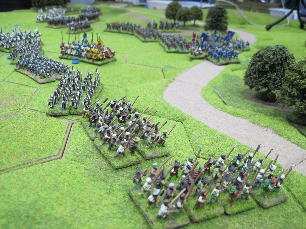Tim pulled 2 surviving units of militia back into woodland hexes close to his table edge and reorganised his rear units into a battle line to confront the charging French cavalry. In the shooting phase Chris delivered a blow which sent a unit of mounted sergeants fleeing in the following hand-to-hand combat phase the Teutonic spears and knights halted the French cavalry and in doing so removed their impact bonuses.