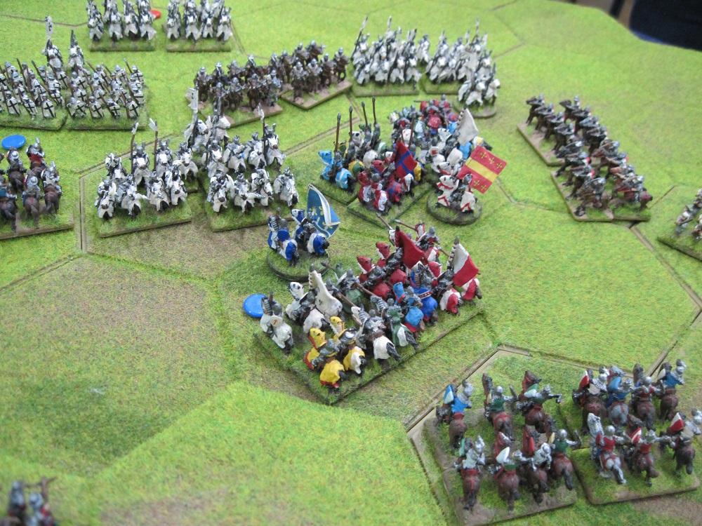 The 4 hex wood prevented the 2 wings of the French army from supporting each other and when the French cavalry was finally defeated along with 2 generals, Tim’s Teutonics switched their attention, and their now greater numbers to the French left wing. The French left put up a very strong fight but it was only a matter of time before the attack by Teutonic knights and spear units decided the game.