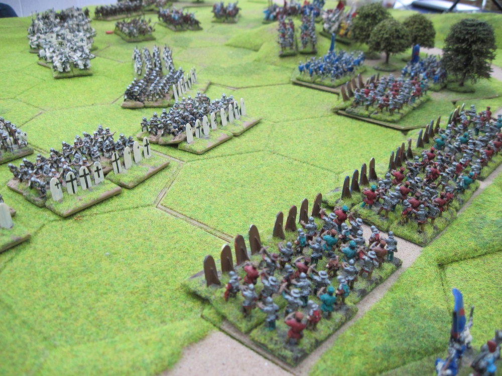 Tony, won the di roll for first move and he quickly advanced to take possession of the 2 areas of woodland between which he deployed his 5 units of French crossbow with pavisses to the fore! He concentrated 7 of his 8 units of cavalry on his right wing along with 2 of his 3 generals. In response, Tim matched up his 4 units of crossbow with Tony’s, again with pavisses in front. Behind these he created a mixed line of Teutonic spears knights and 2 units of mounted crossbow. However, more significantly his line of crossbow was extended using 5 units of peasant militia which created a sacrificial block against any potential French massed cavalry charge.