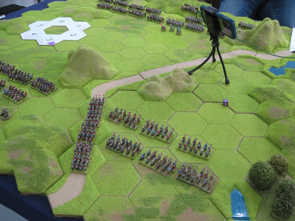 The two main battle lines remained within easy charge range of each other but outside shooting range while the prolonged struggle on the right of Tony’s line continued without any indication that a resolution could be reached. Tony moved his 3 heavy units into position to charge along the road between the ‘blocking’ hill hexes but then stopped. The stalemate then continued until Tim decided to advance his entire bow line into shooting range. In response Tony charged his Mongol heavy cavalry through the hilly gap and into hand-to-hand combat with the Ottoman Qapakulu heavy units.