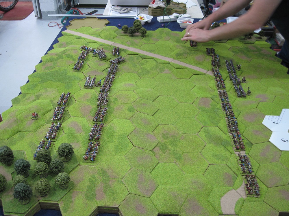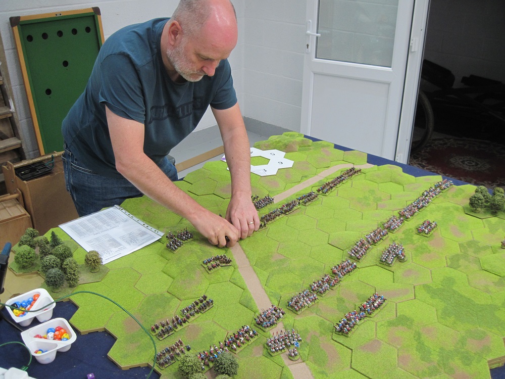 The first couple of tactical moves for both sides saw the small number of heavy cavalry units mostly accommodating a general, move positions within their own cavalry lines. The attack would come quickly, and the trick would be to make preparations in anticipation of this. Tony opened proceedings by pushing his Mongol light cavalry into shooting range of the extreme left wing of our line where 2 units of Akici cavalry were occupying a small area of woodland. Despite the extra A2 cover afforded by the wood hexes in the ensuing shooting phase managed to disrupt one unit and disrupt and recoil another.