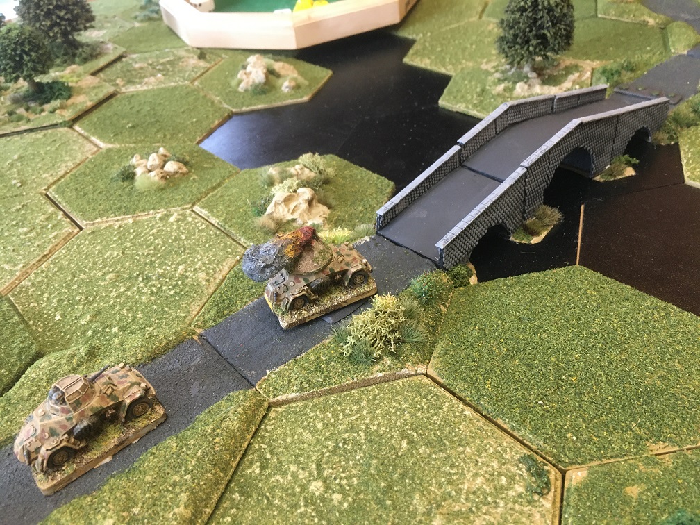 It was with a fair degree of caution that both German forces advanced with sdkfzs taking the lead with units of 3 panzer IV’s following on in close support. It wasn’t long before the lead sdkfz attempting to cross the stone bridge was blown-up by an anti-vehicle mine. With the road blocked the following panzers spread out to engage in a long distance shooting match with a 6pdr gun position which opened-up on them.