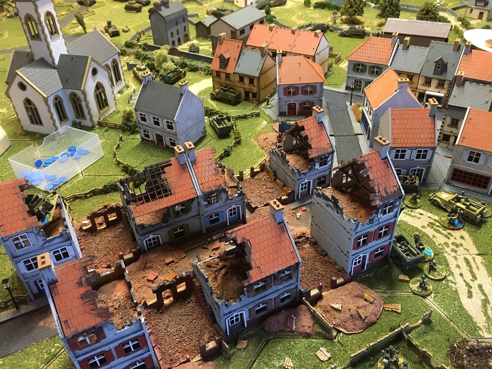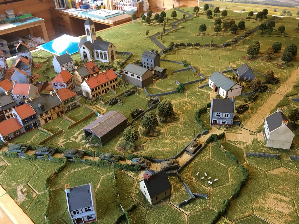 Thanks to Dave for organising this game using his own bespoke Hexon terrain and extensive collection of WWII miniatures. In this scenario the German force has launched a counter attack lead by a German tank force consisting of 3 Panthers, 2 Stug IV’s and a Tiger. These would appear along 2 parallel roads leading to a small French town held by a substantial British infantry force supported by 20 tanks; Shermans, Sherman fireflies, Stuarts and Cromwells. German infantry units would join the counter-attack after a pre-set number of game turns.