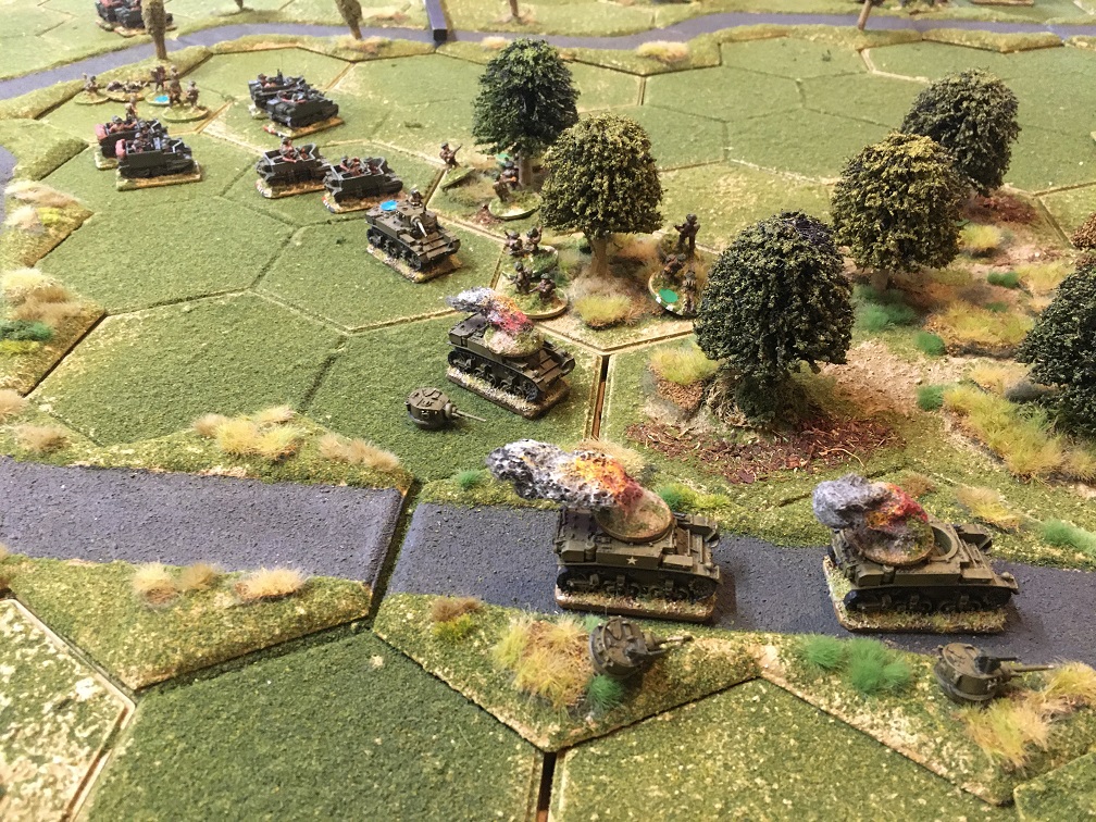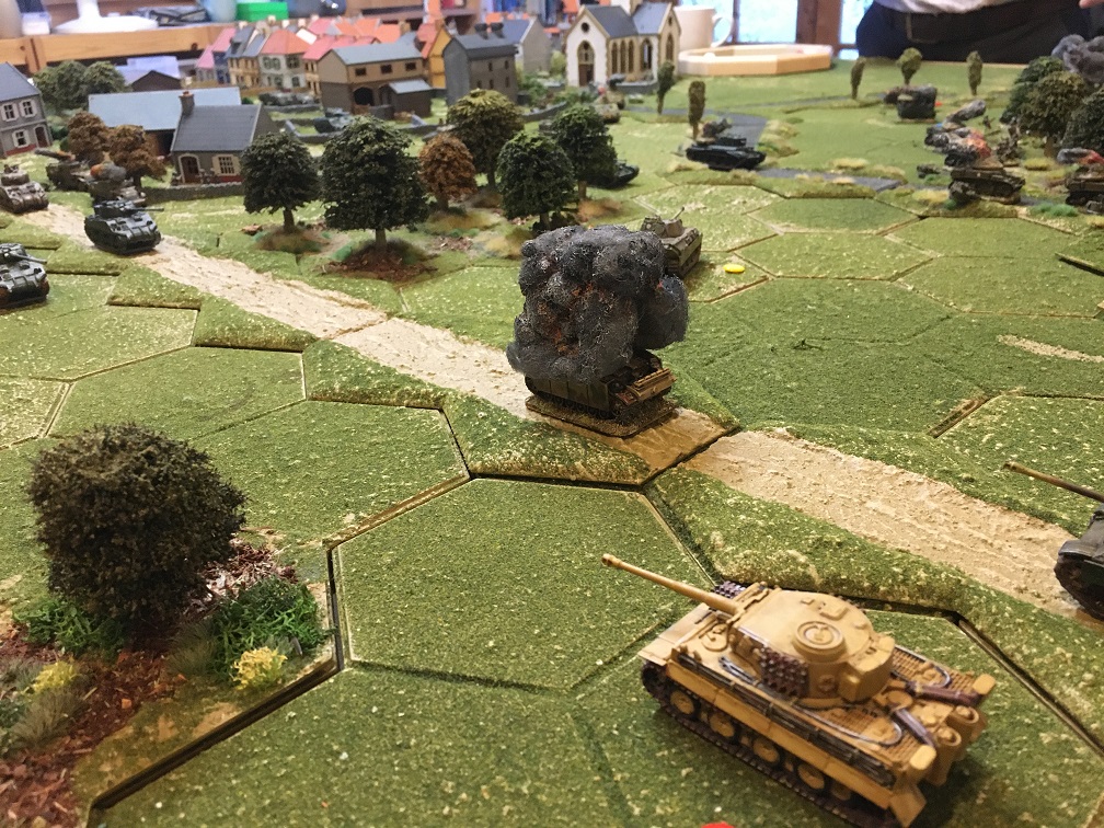 Four Sherman fireflies eventually positioned themselves try and eliminate the German armour with their 17pdrs, but again, mainly by sheer luck rather than good management the German tanks failed to burn like their British counterparts which were now littering the battlefield in ever greater numbers.
